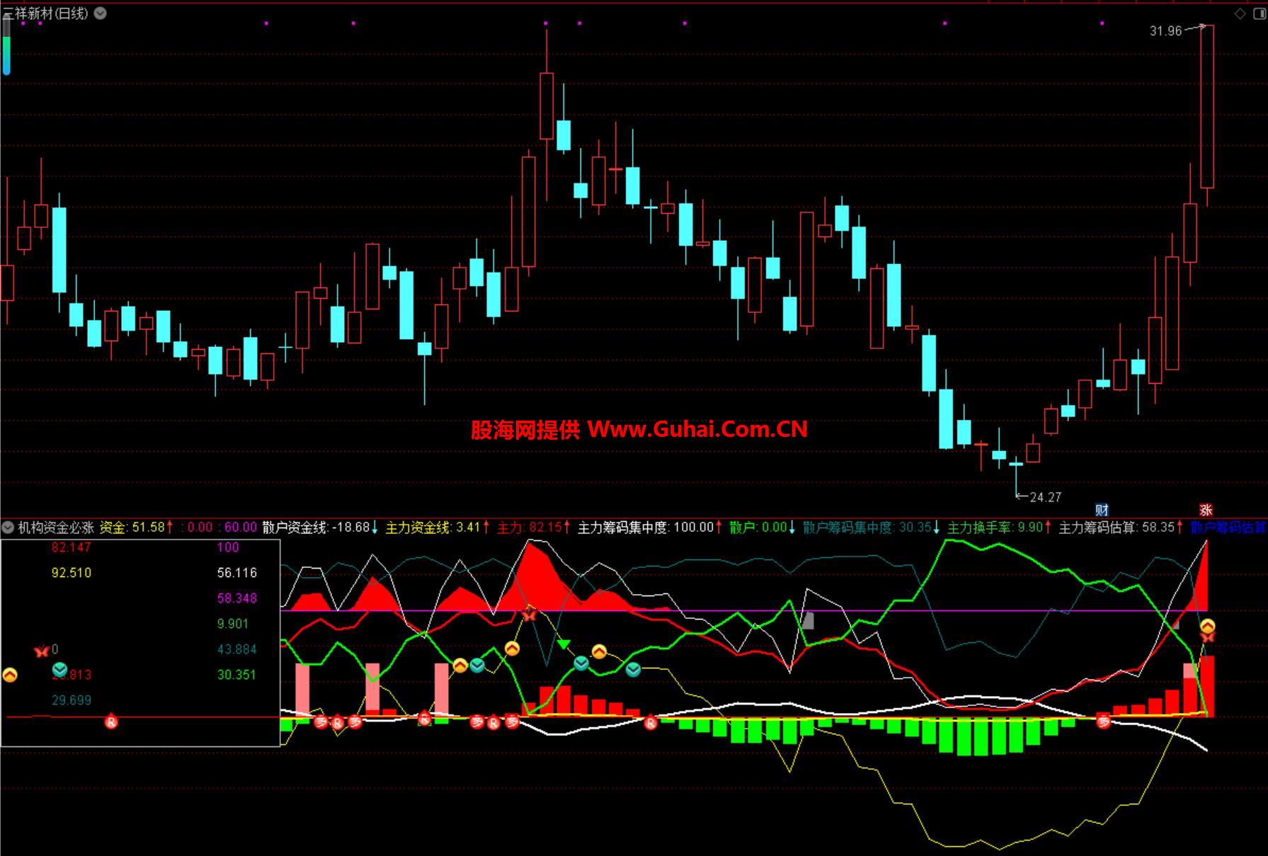机构资金必涨是一个非常厉害的分析主力筹码和主力控盘的副图指标,遗憾的是买入点闪闪烁烁的,没有明确的定义和信号。所以,班门弄斧,给机构资金必涨加上了一个买入信号。