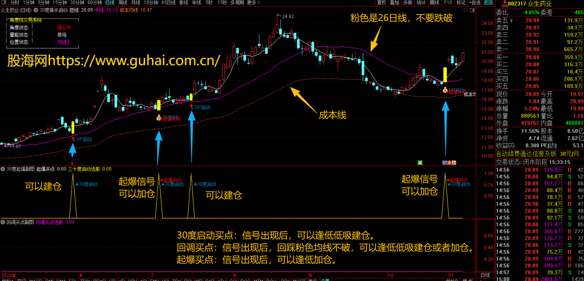 主图中白色线为5日短线,粉色线为26日中线,黄色虚线为成本均线也是重要的支撑,跌破得离场走人。