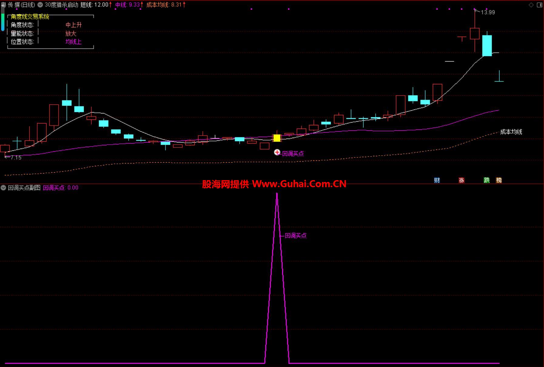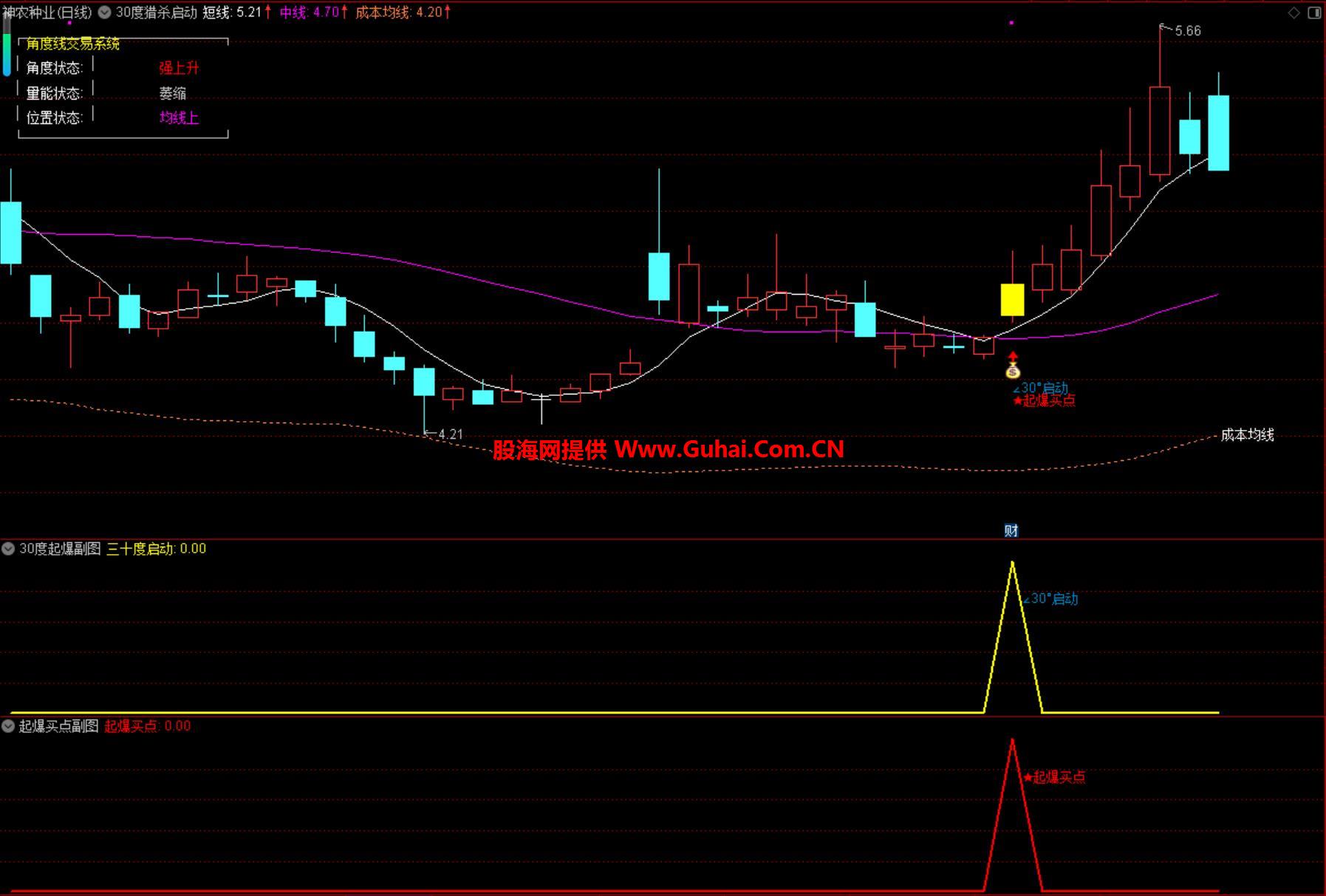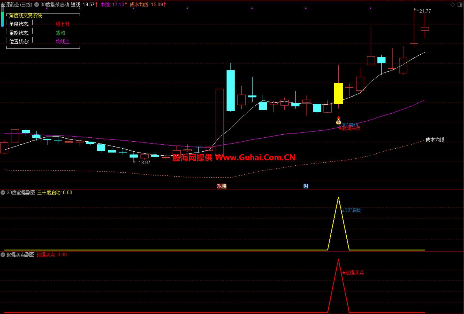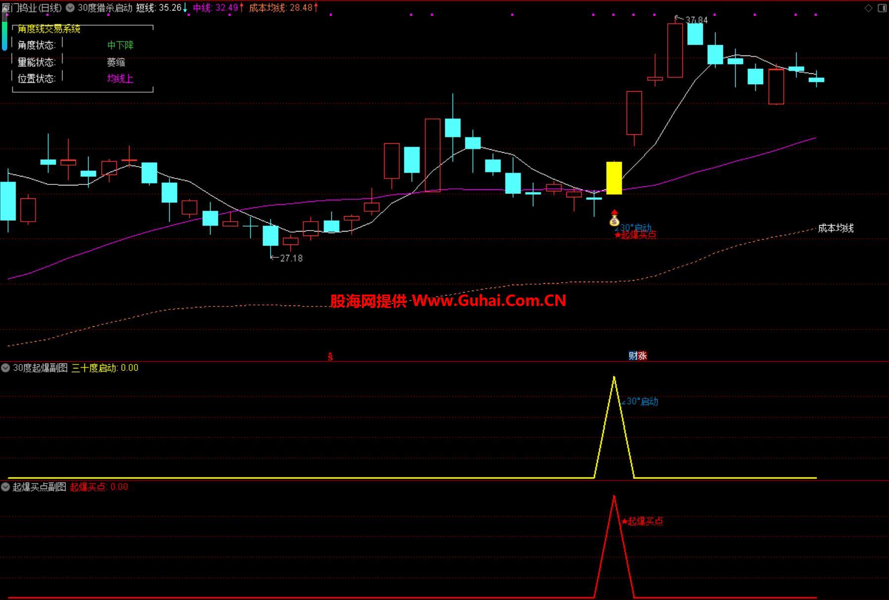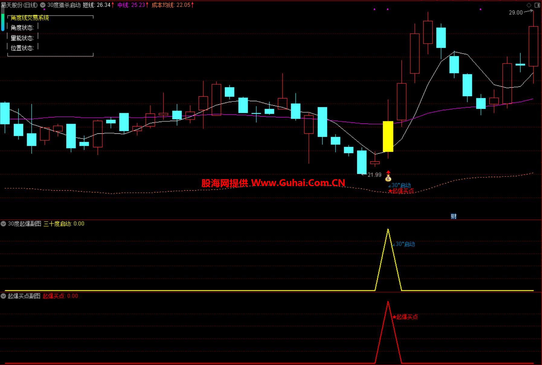 相关简介:【30度猎杀启动】主副图选股指标,回调+启动+起爆三信号模式