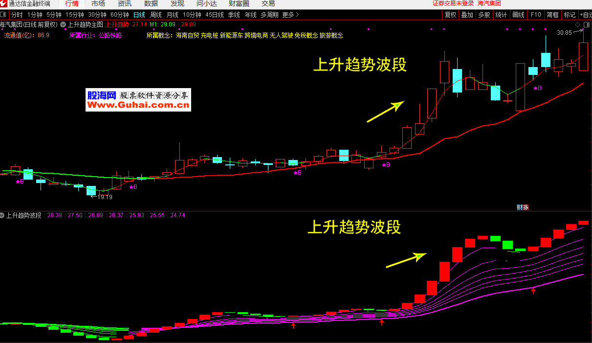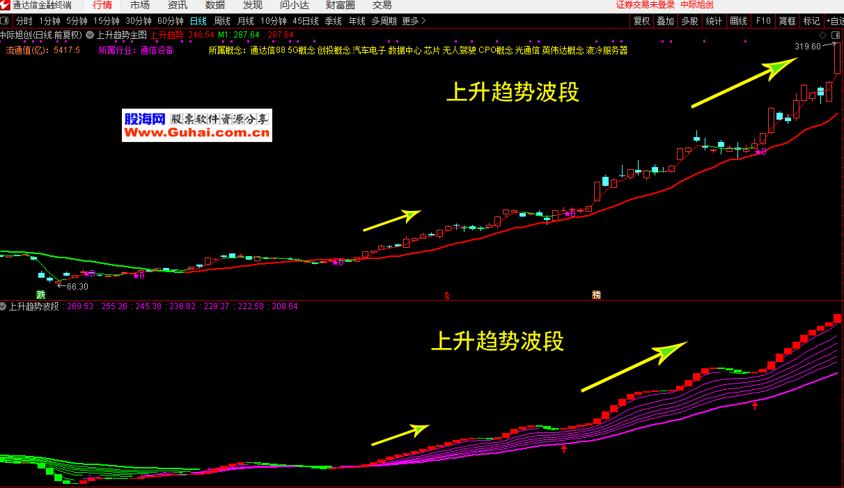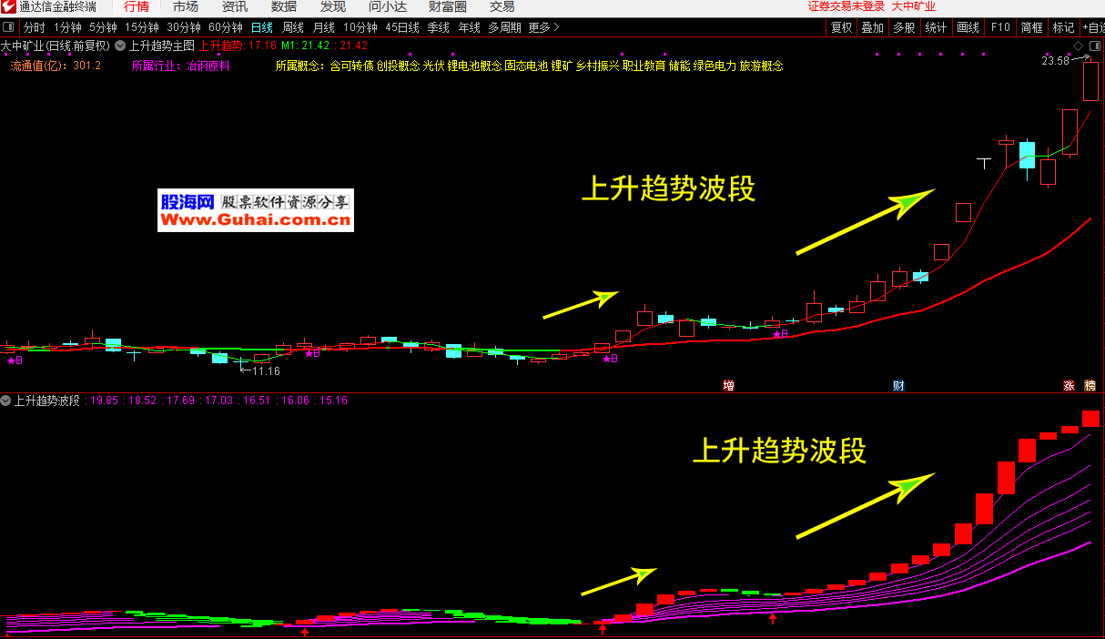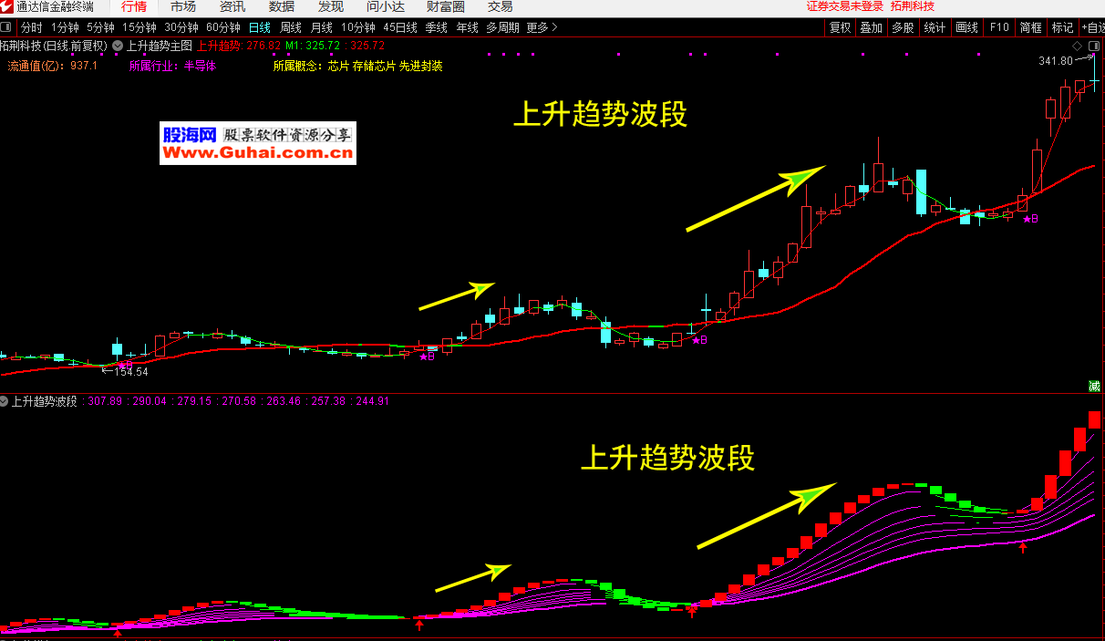 通达信 上升趋势主图+上升趋势波段+趋势波段选股指标公式 无未来函数 源码文件分享