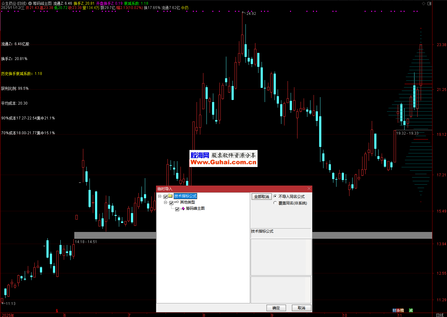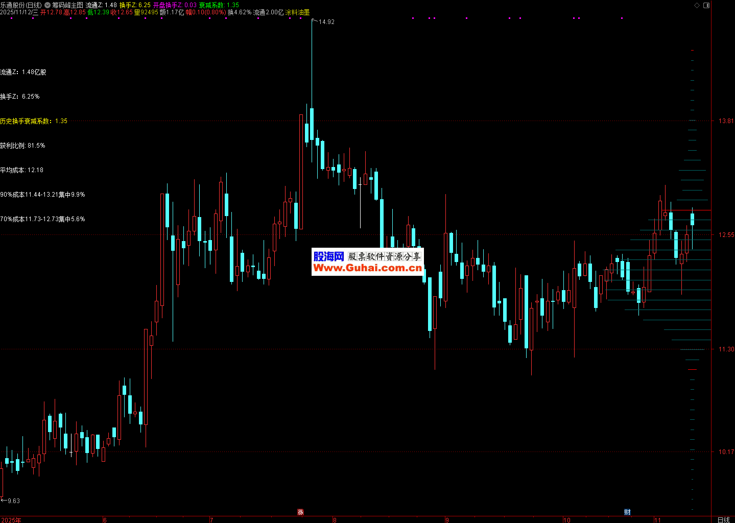 通达信【筹码峰】主图指标 细致显示 覆盖了流通股、换手率、成本分布核心数据 分享一个筹码峰主图,源码,清爽;覆盖了流通股、换手率、成本分布核心数据。