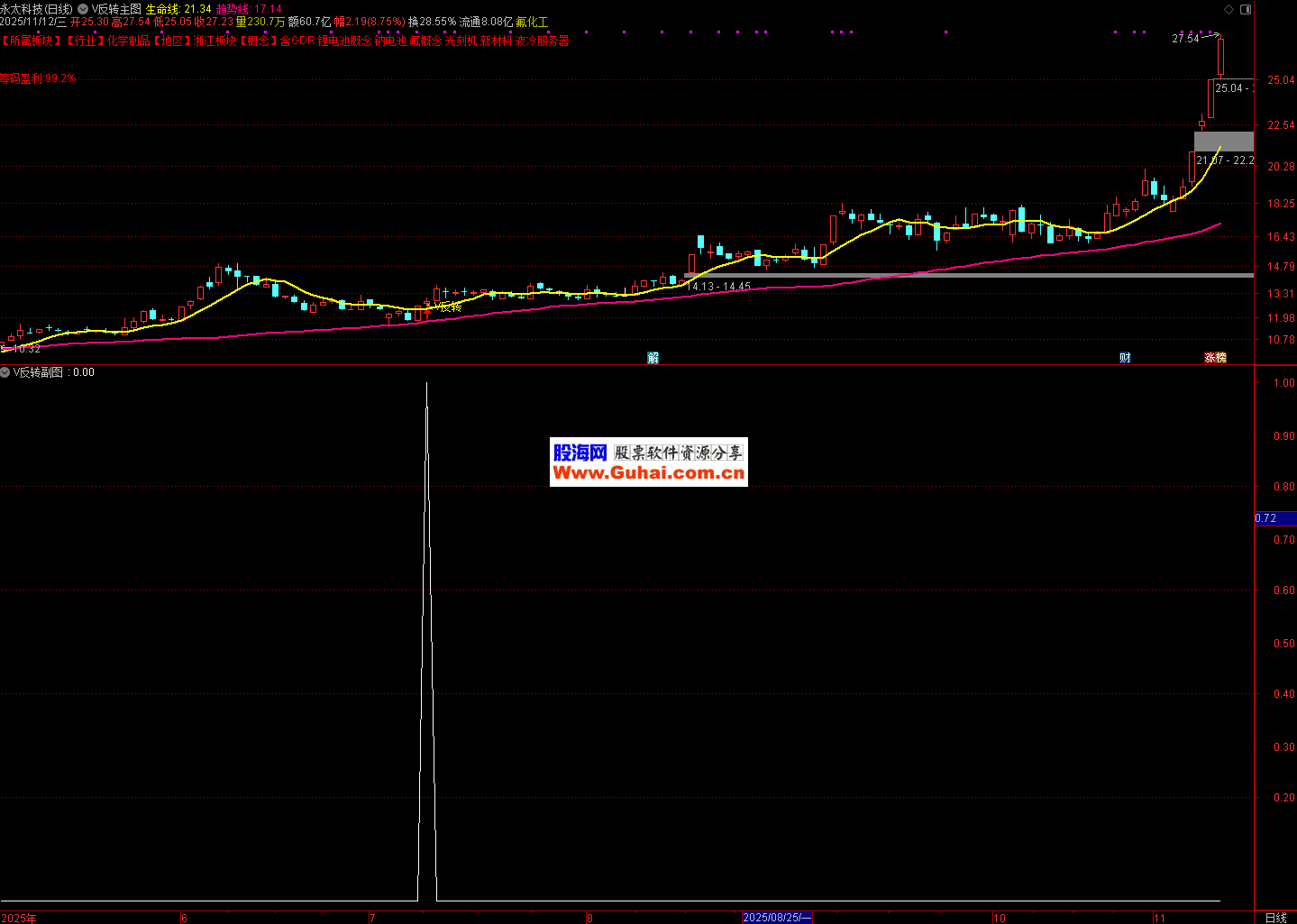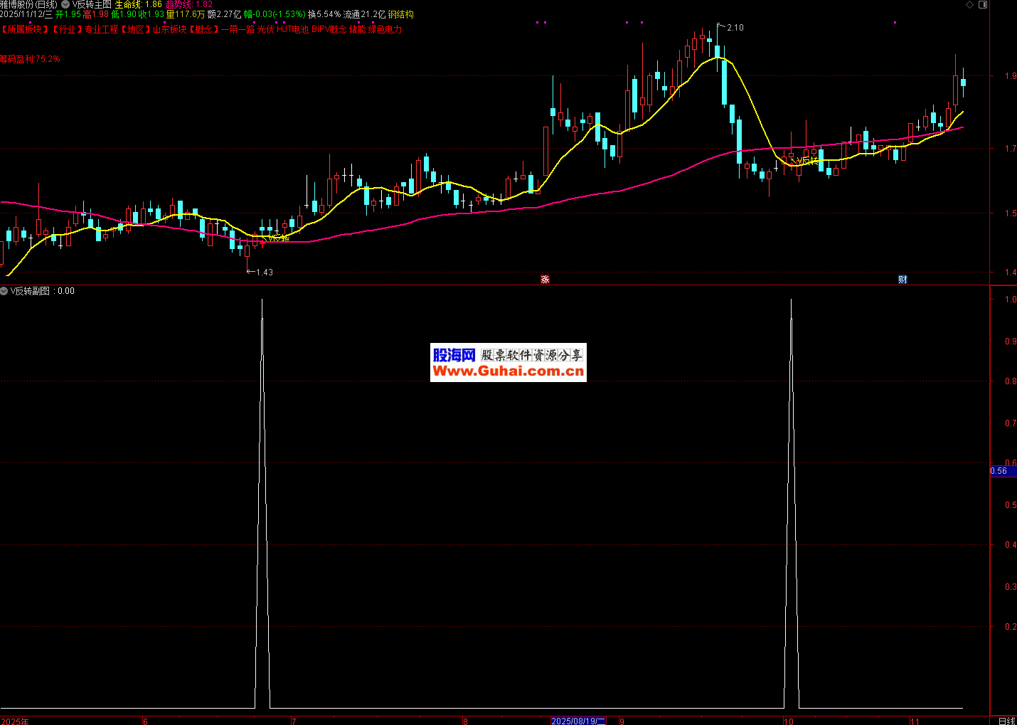 主图核心展示生命线与趋势线:生命线作为多空分界参考,趋势线动态跟踪运行方向,当趋势线出现转向拐点时,主图会同步标注“V反转”信号,直观提示潜在转折机会。