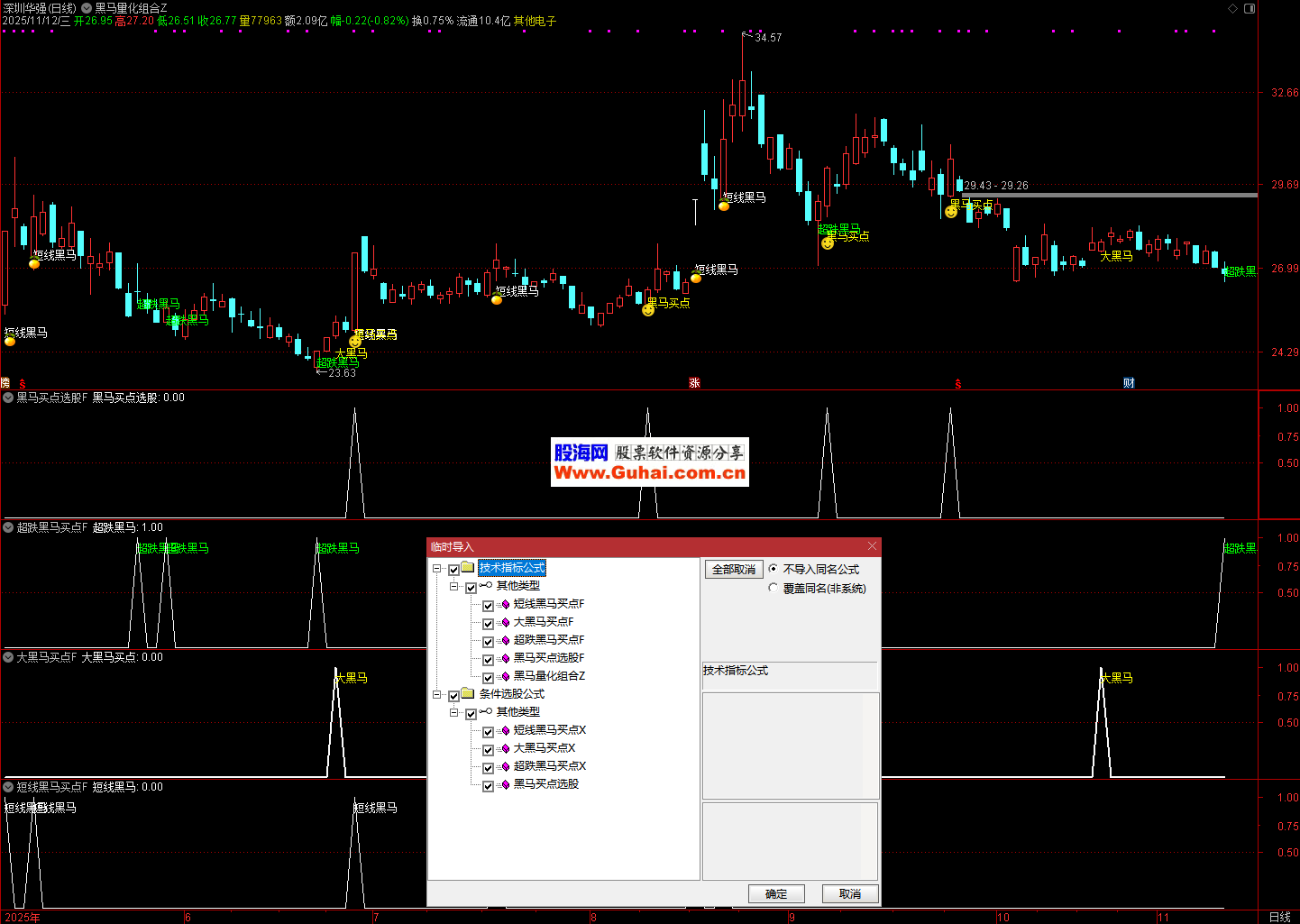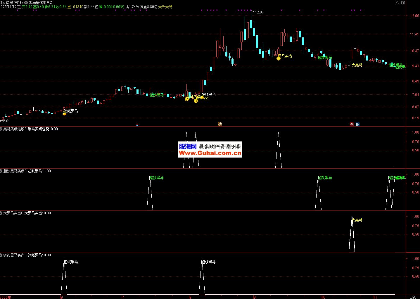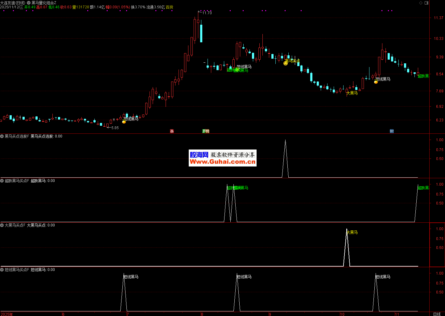 指标通过多组均线交叉、动量强度和超跌反弹信号,识别股票短期强势起涨点。当短期均线上穿中长期均线且成交量放大时提示"黑马买点";在价格超跌区域结合动量反转捕捉"超跌黑马"机会;综合量价、波动率和趋势强度筛选出"大黑马"标的。