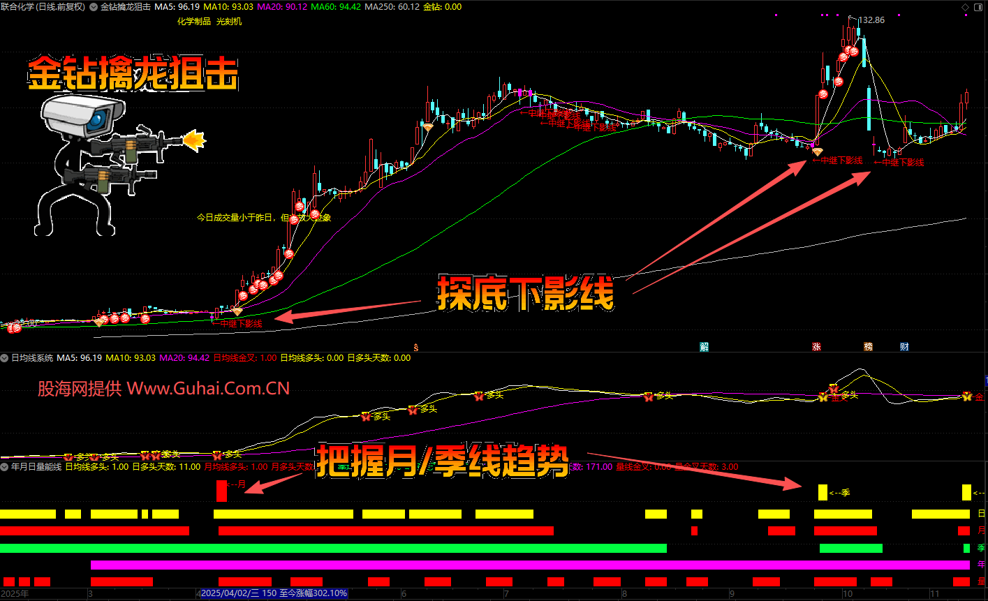 1、当日线、月线、季线、年线同时多头,叠加量能金叉,触发黄金买点信号(如代码中“日”条件),历史回测胜率提升显著。