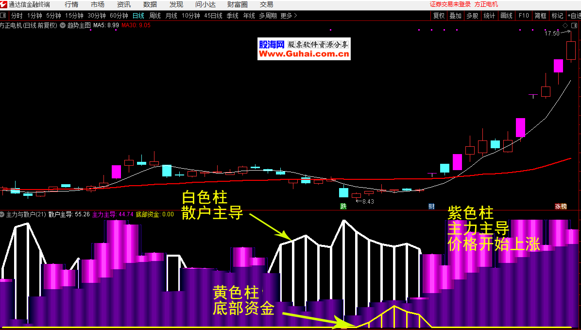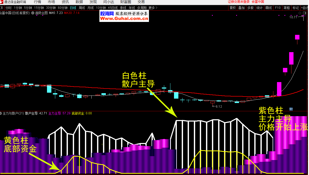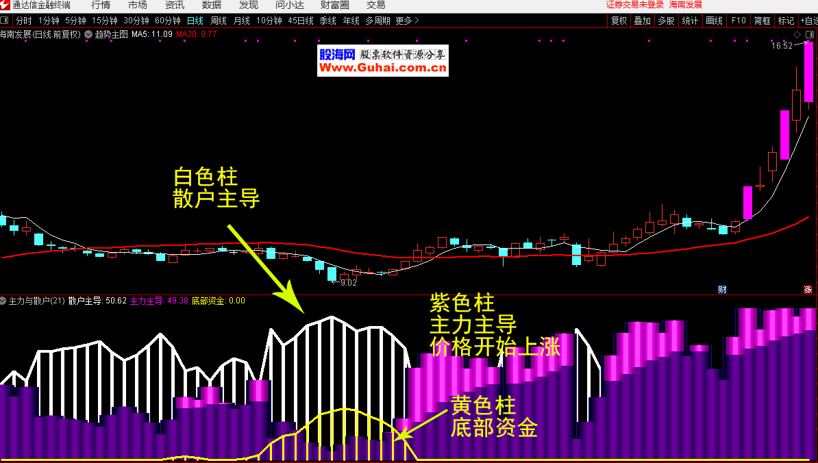 3.主力与散户副图指标中开始出现紫色柱子表示主力开始介入,特别是主力主导数值上穿50时,可以开始关注介入;