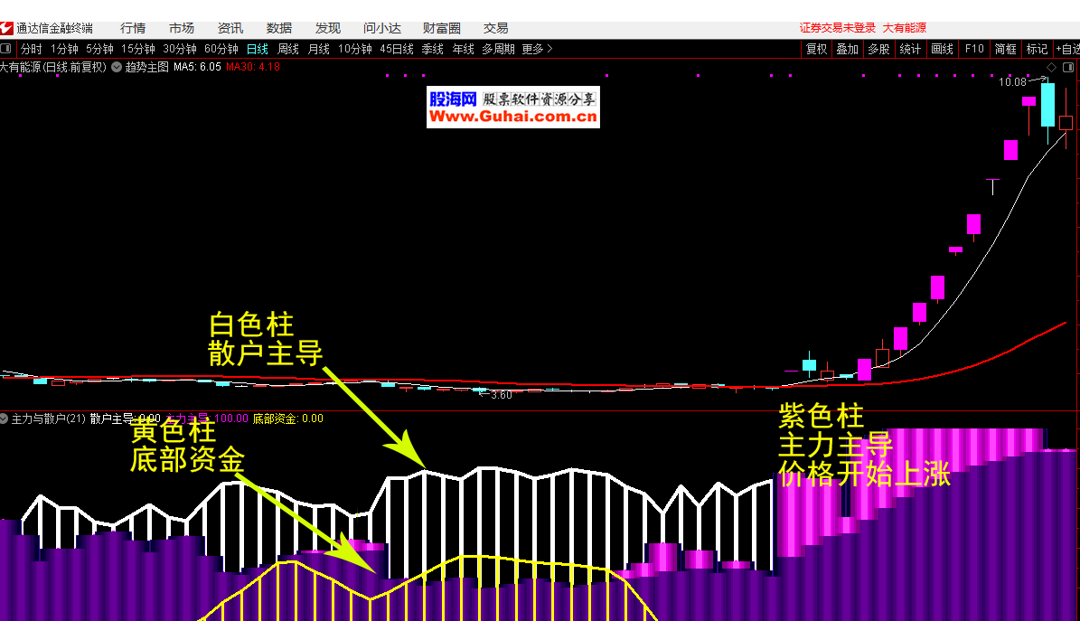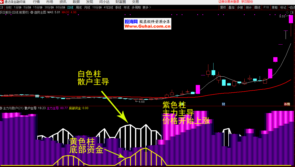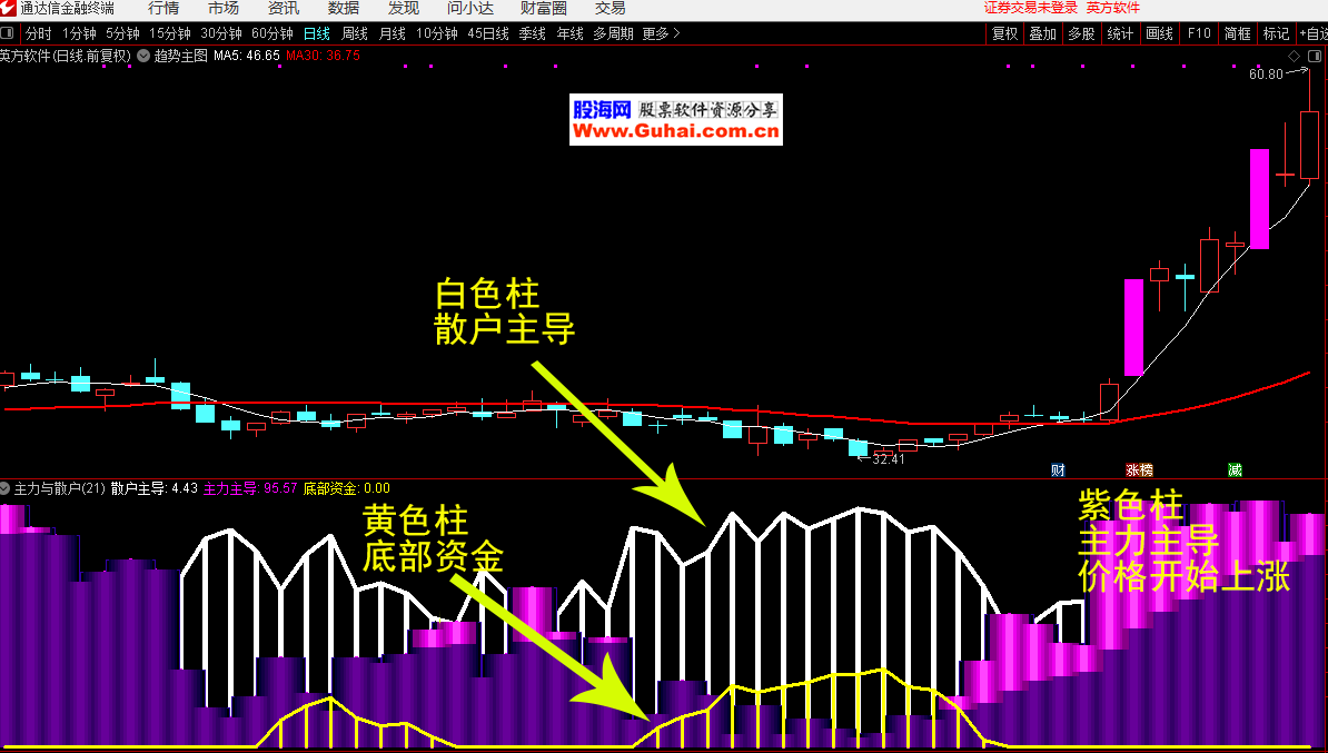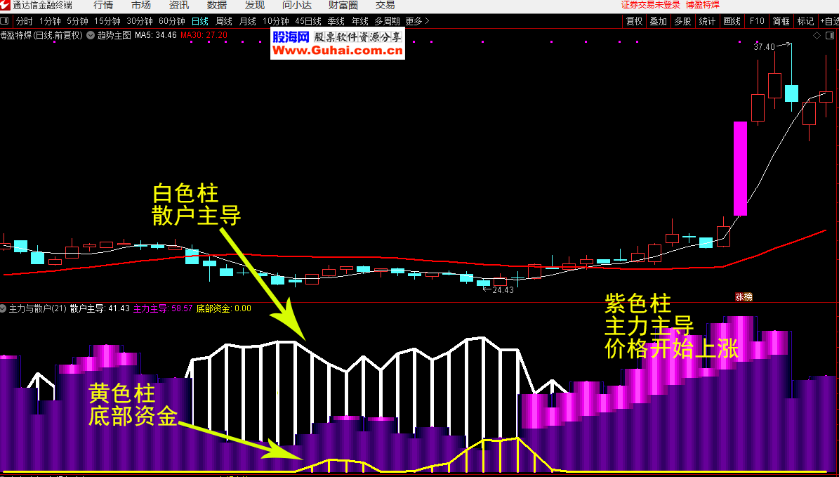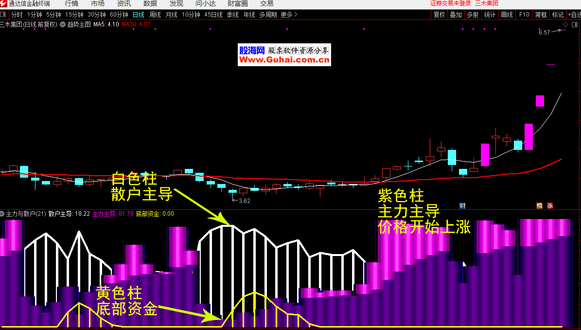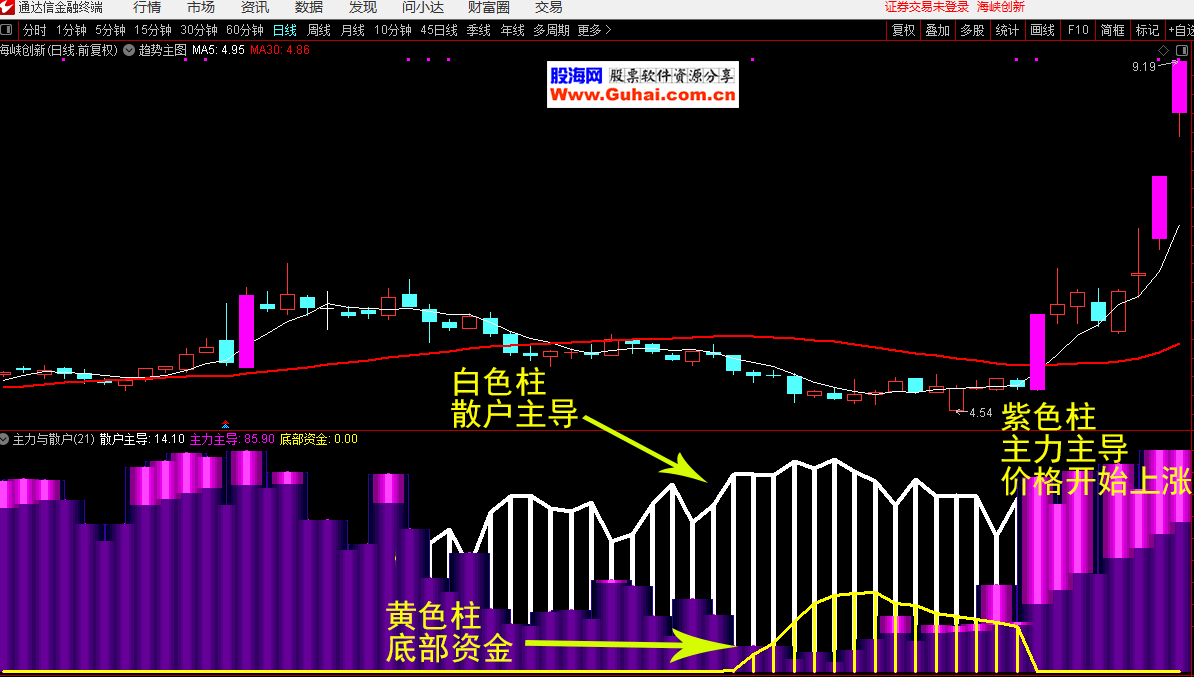 4.主力状态一目了然:白色(散户主导与套牢)----黄色(股价将接近于底部)----紫色(主力开始主导价格上涨)
