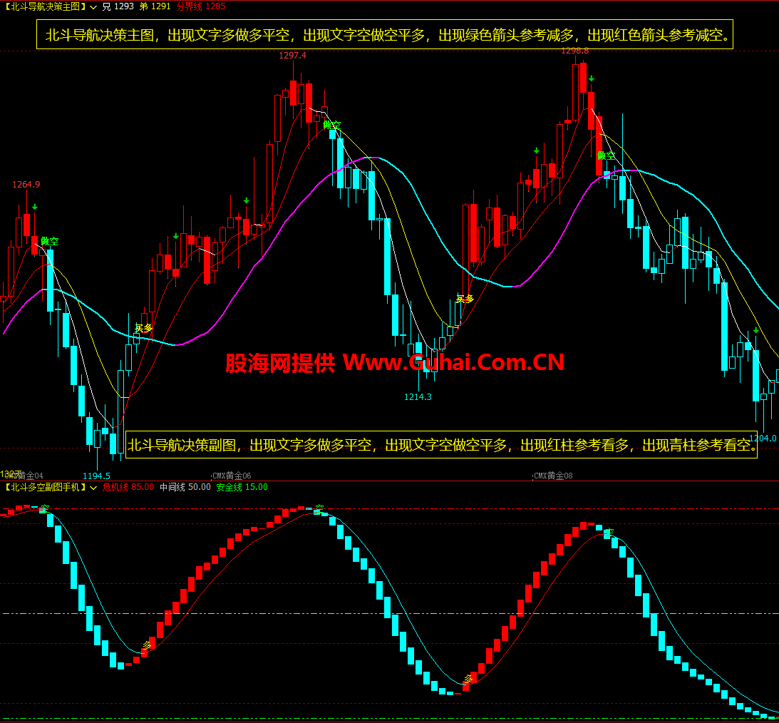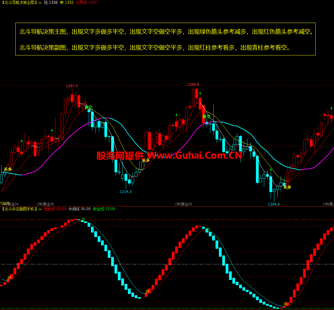 2,北斗导航决策副图,出现文字多做多平空,出现文字空做空平多,出现红柱参考看多,出现青柱参考看空。