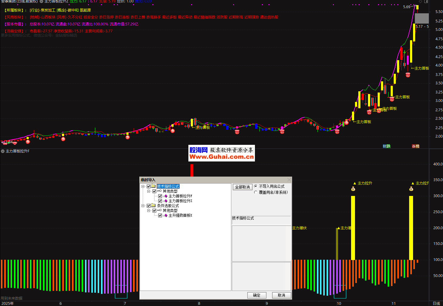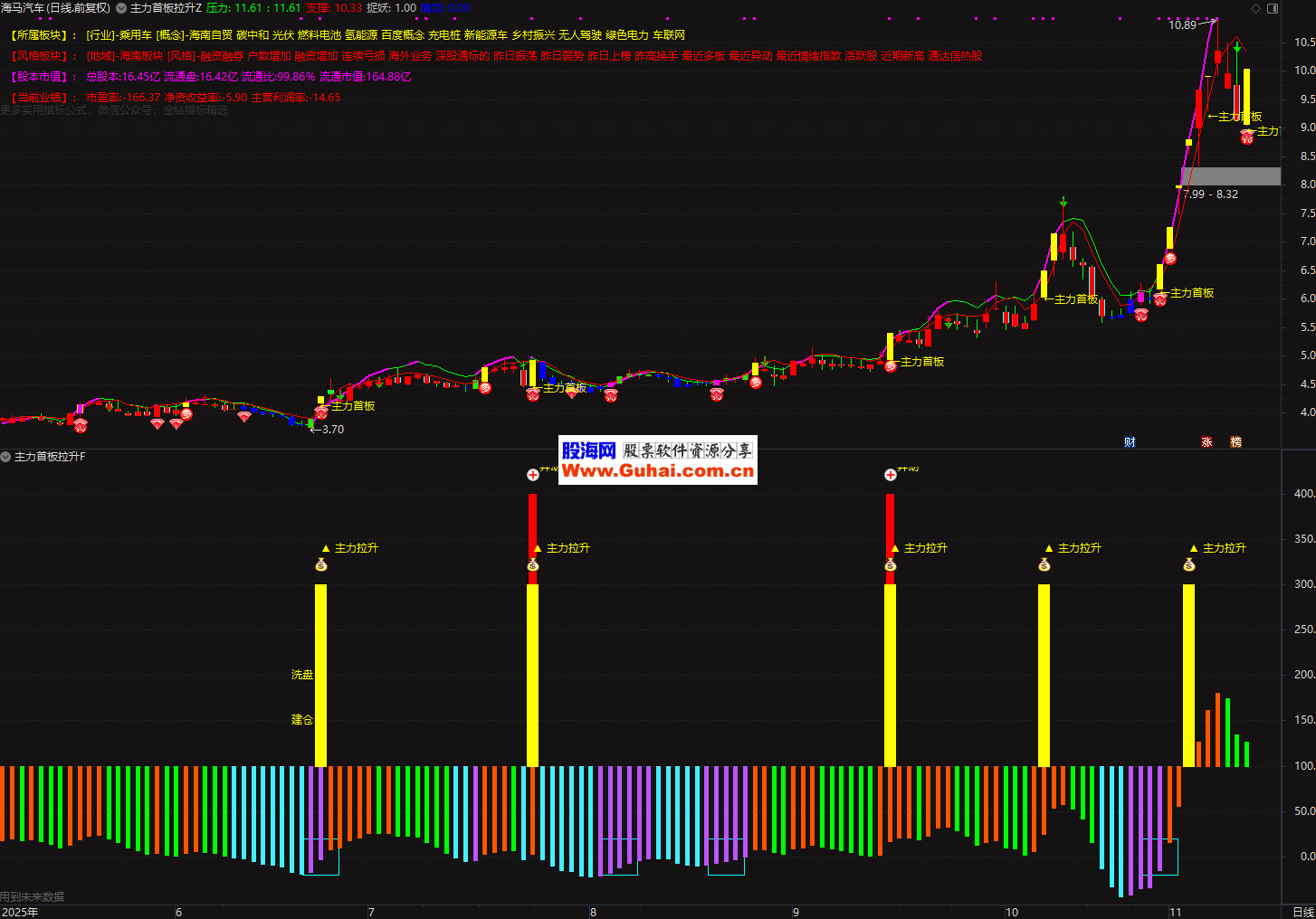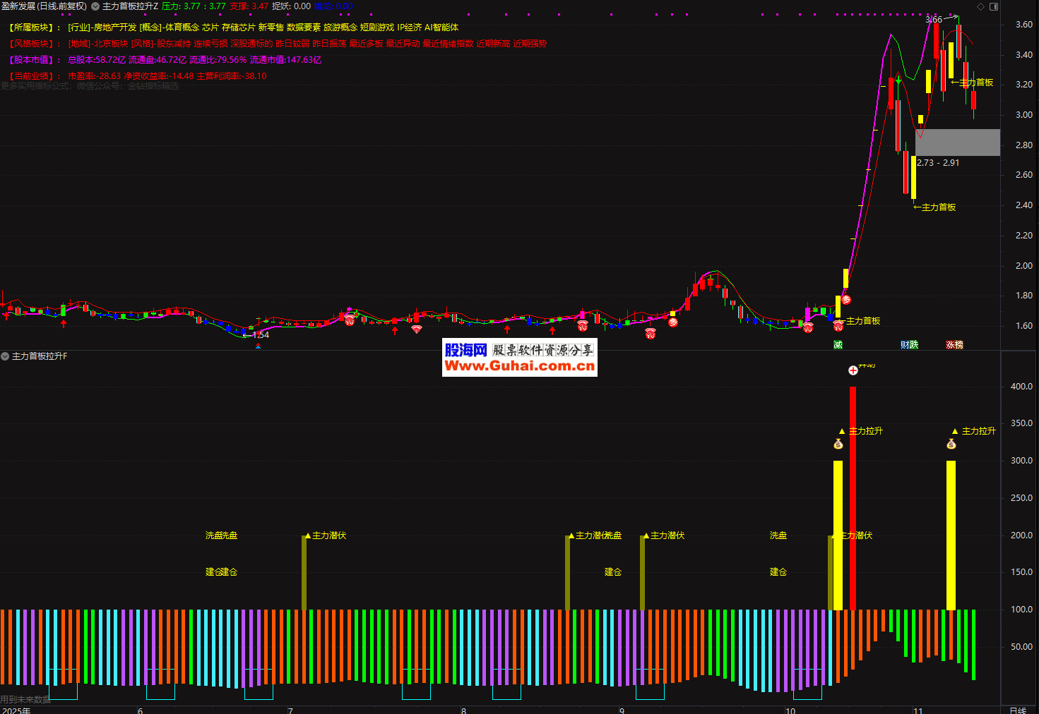 主要功能:通过多重技术指标综合判断股票买卖时机。它融合了价格趋势、动量变化、超买超卖状态和主力资金动向等多维度信号,在不同阶段给出明确的建仓、洗盘、主力潜伏等提示。