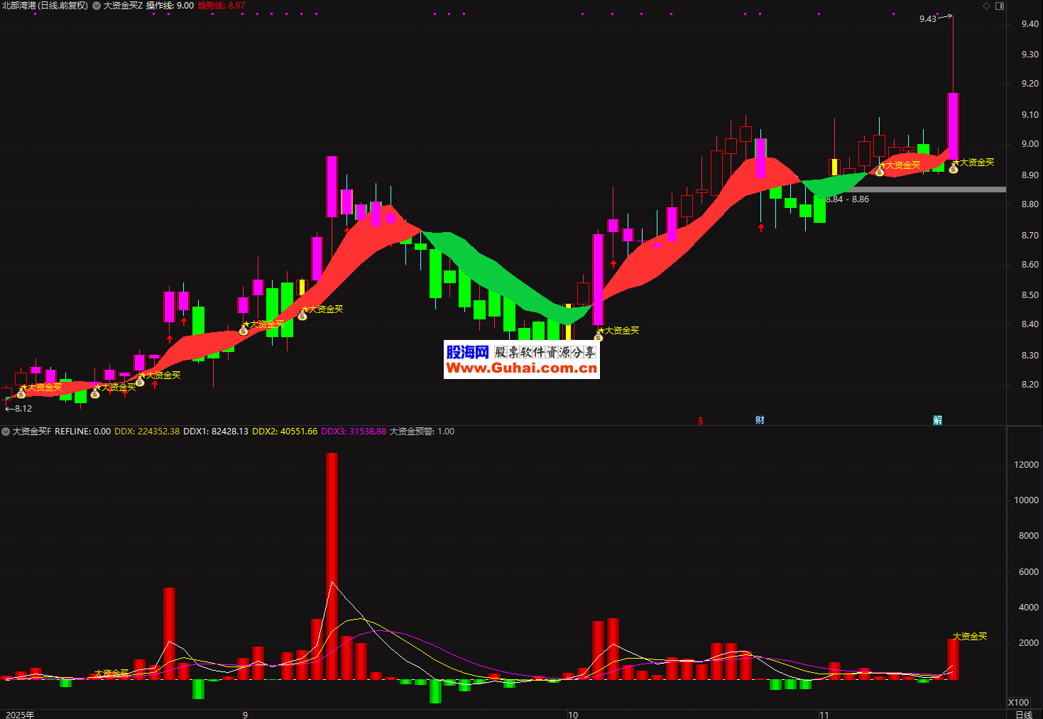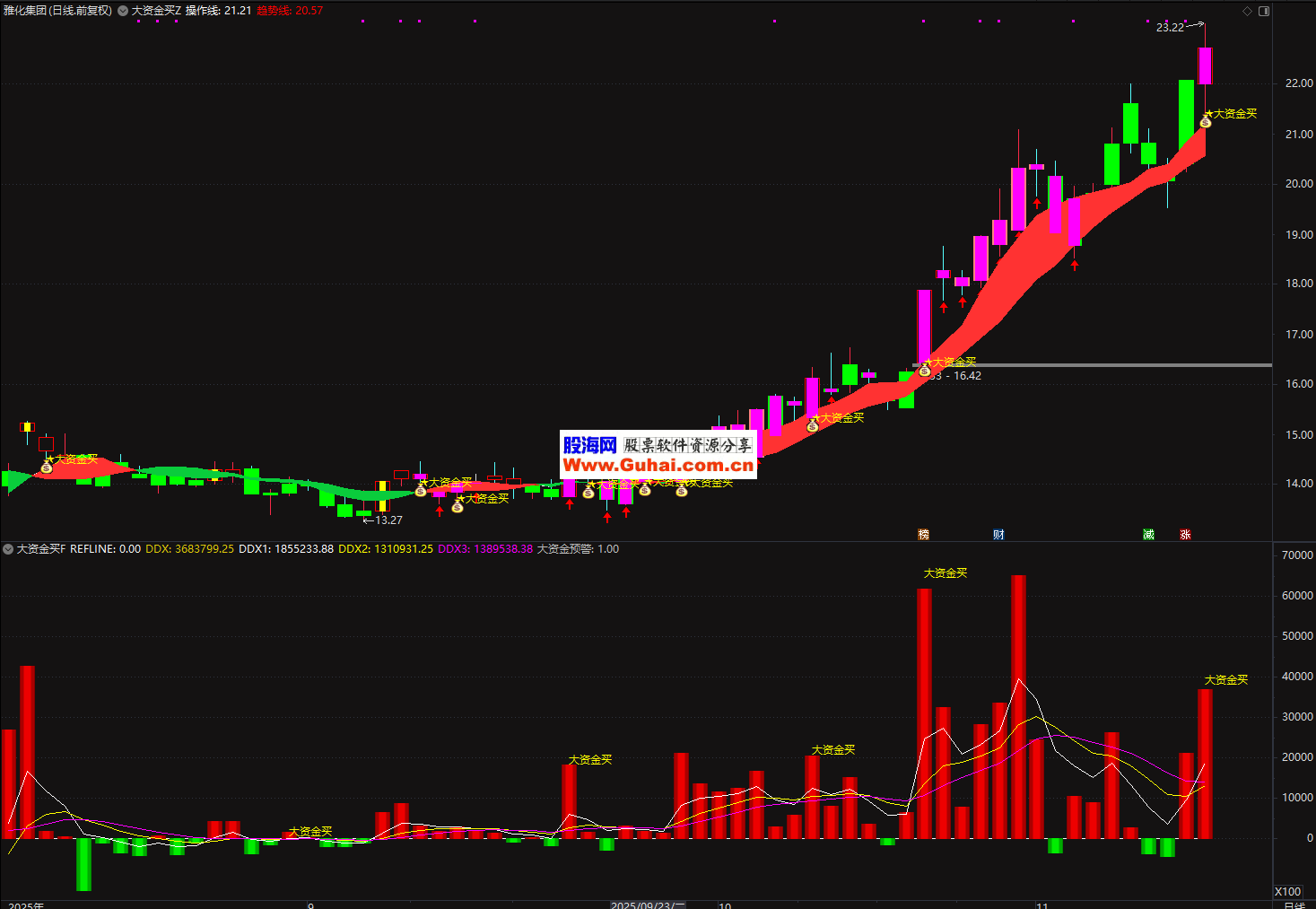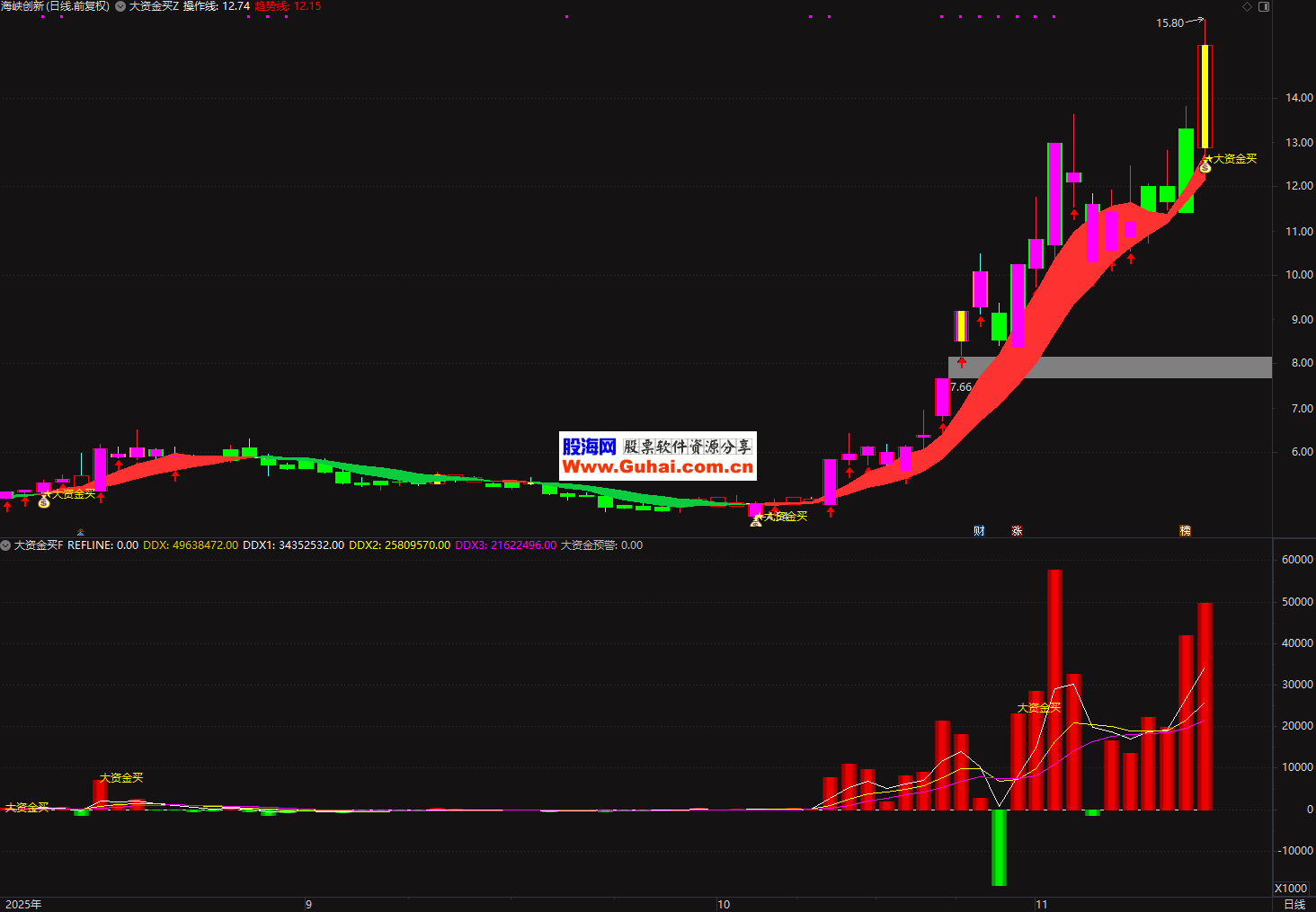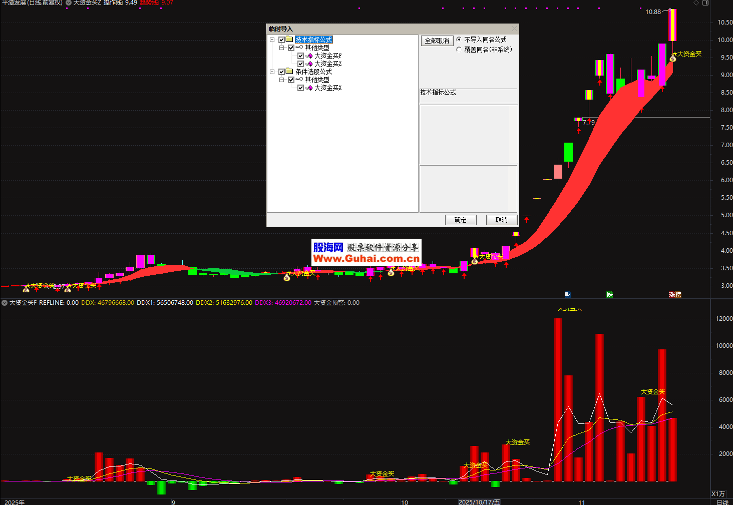 指标通过分析价格波动与成交量,区分大资金买卖力量。核心计算买卖量差值并平滑处理,用彩色柱状图直观显示资金流向。当短期均线上穿中长期均线且成交量放大时触发买入预警。