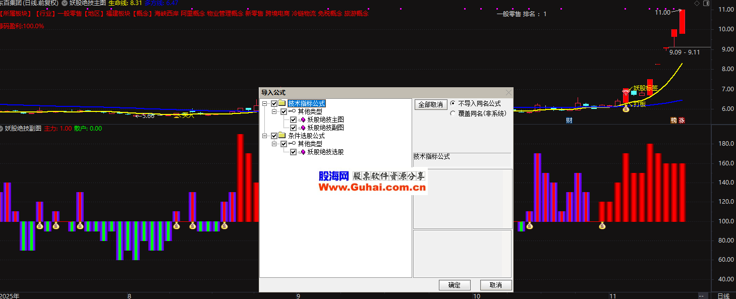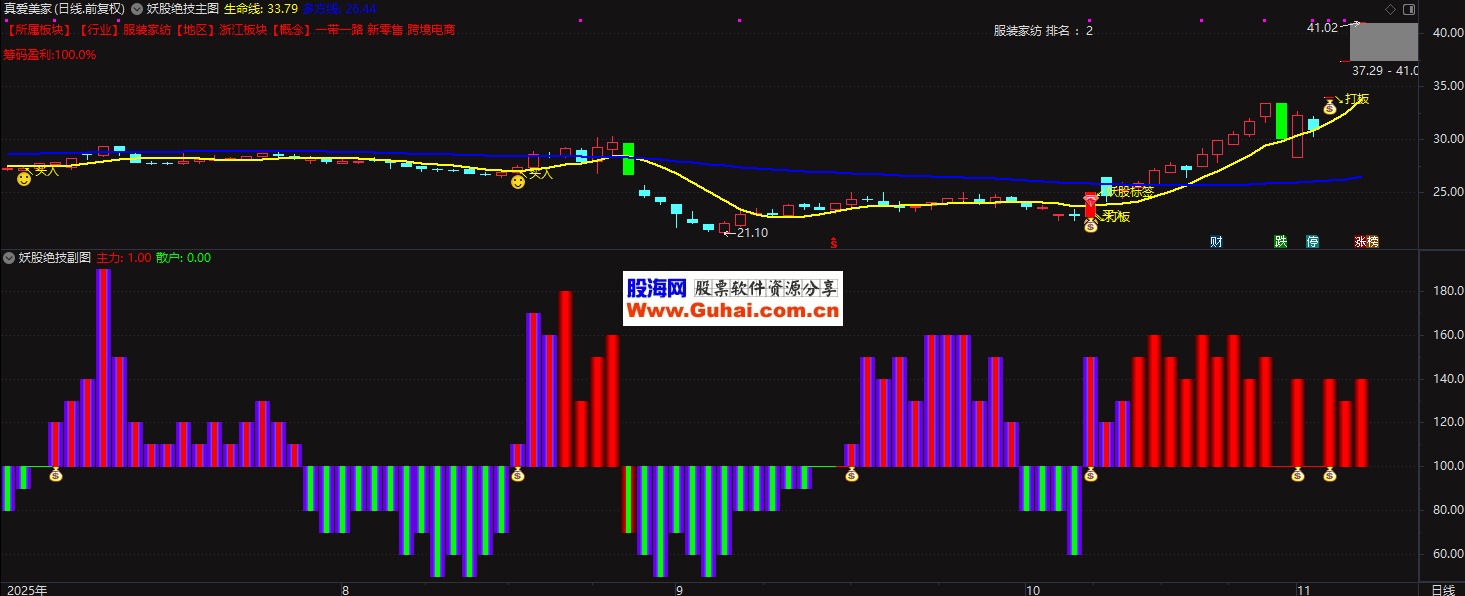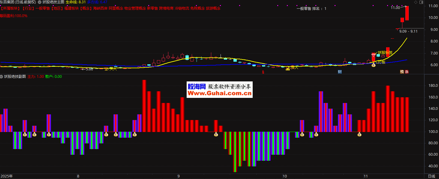 主要功能:通过计算股票的控盘程度、价格动能和板块排名,识别即将启动或加速上涨的潜力股,并在图表上标注买入、卖出信号。