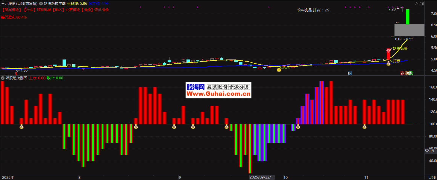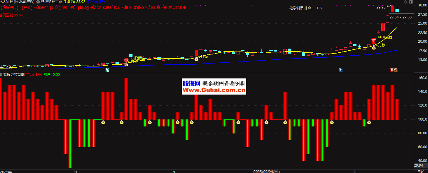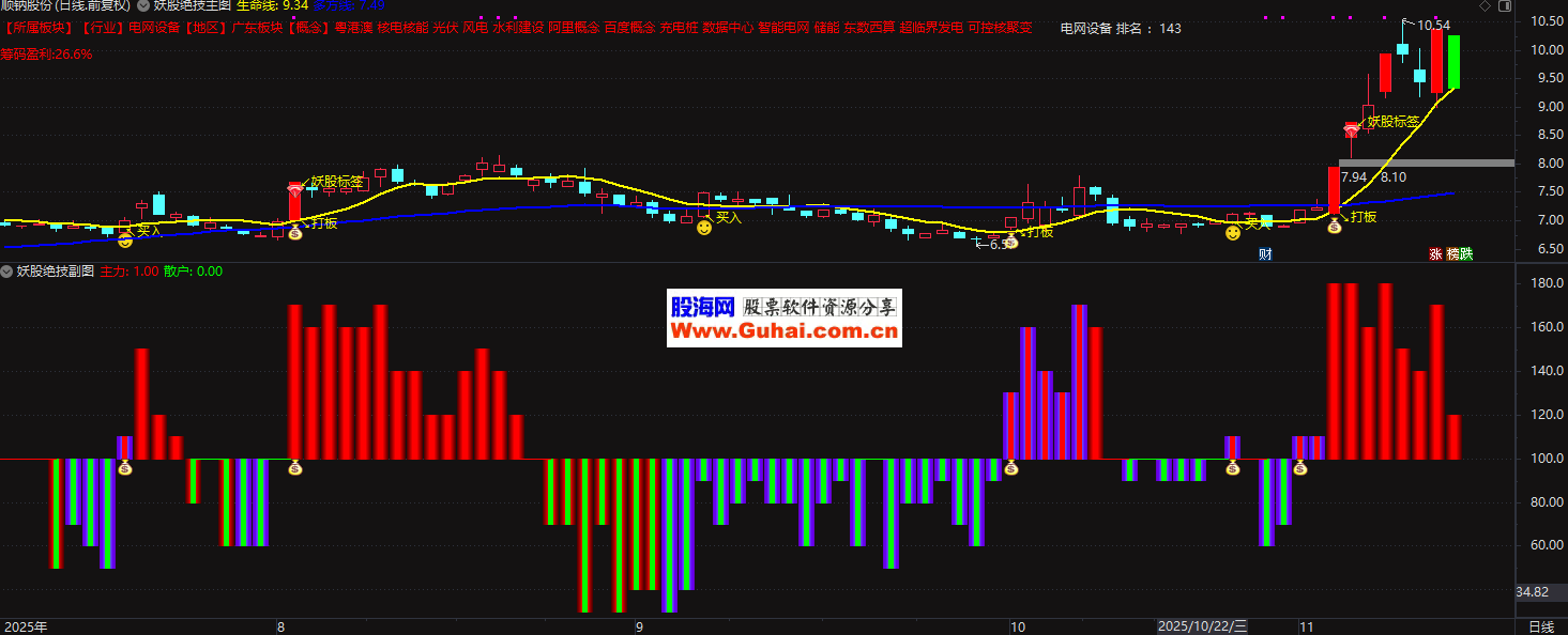 指标主要用于识别具备"妖股"潜力的股票,通过分析股票的量价关系、控盘程度和板块背景来捕捉短期强势股的买卖点。