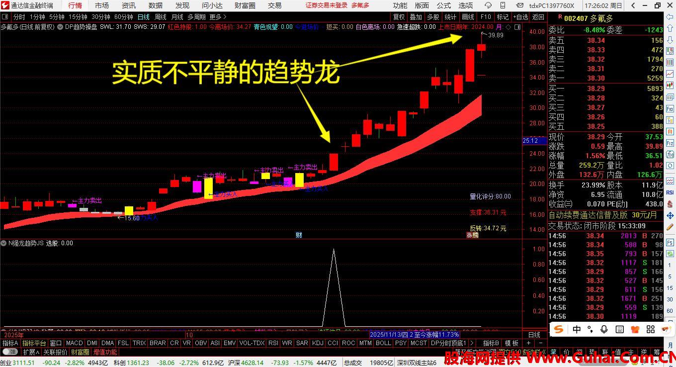 该策略是一个高标准的综合选股策略,通过严格的多重条件过滤,旨在筛选出在趋势、动能、资金、异动四个维度都表现优异的股票,从而提高投资成功的概率。核心思想是“宁可错过,不可做错”,与通达信平台评分4.68的“强龙趋势”是同源优秀指标,核心如下: