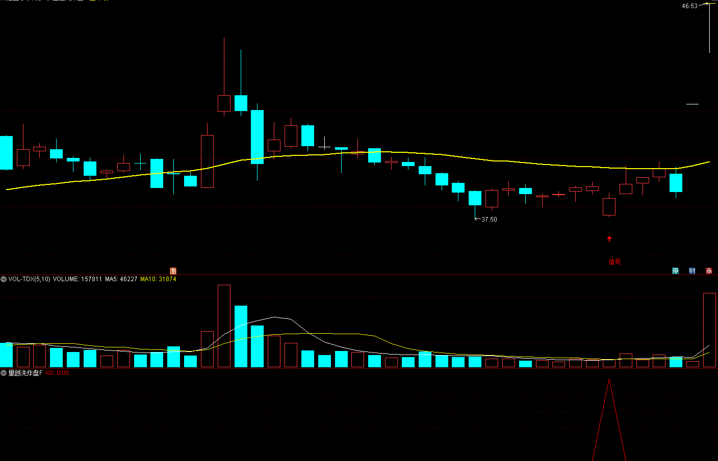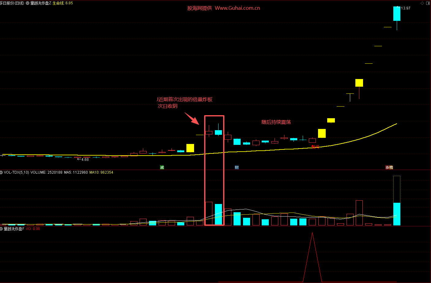 4、某一天,震荡期间的量能累和超过前面炸板和次日阴线两天量能总和的两倍时,往往时洗盘结束的标志,意味着经过了充分的换手,随时会启动;