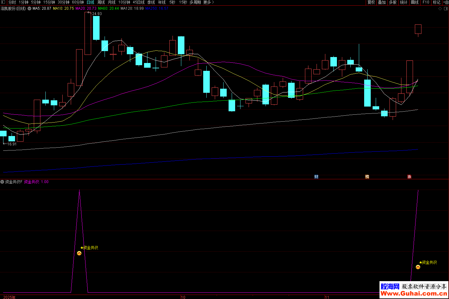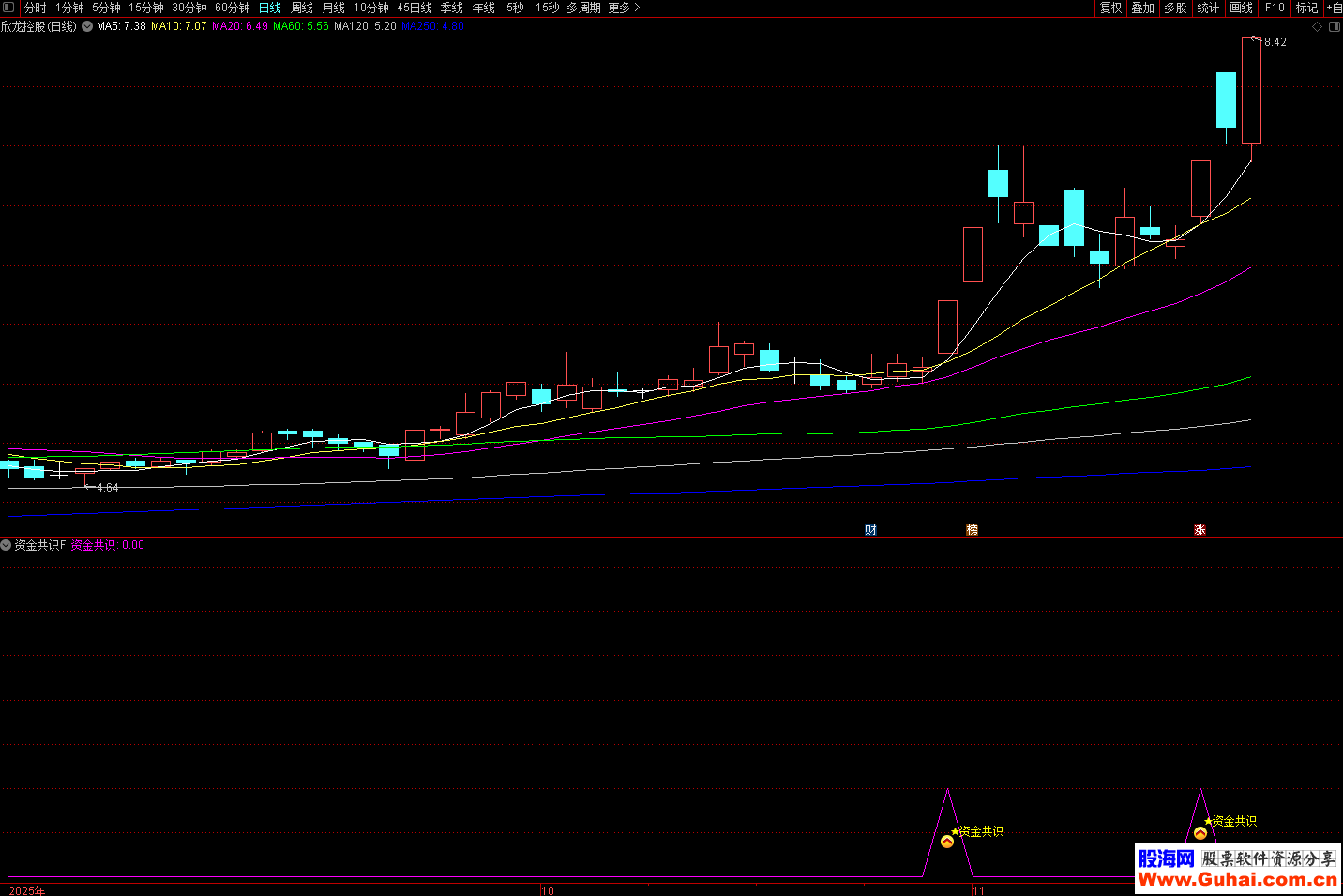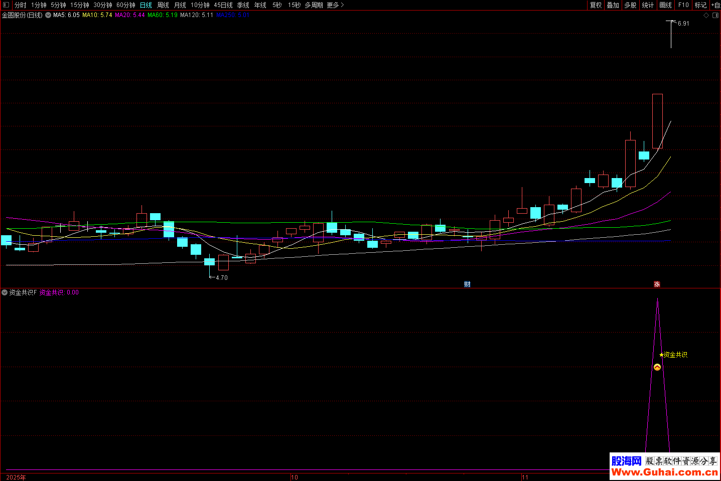 信号显示:当所有条件同时被满足时,该指标会在图表上绘制一个特殊的图标和“★资金共识”的文字标签,直观地标记出这个时点。