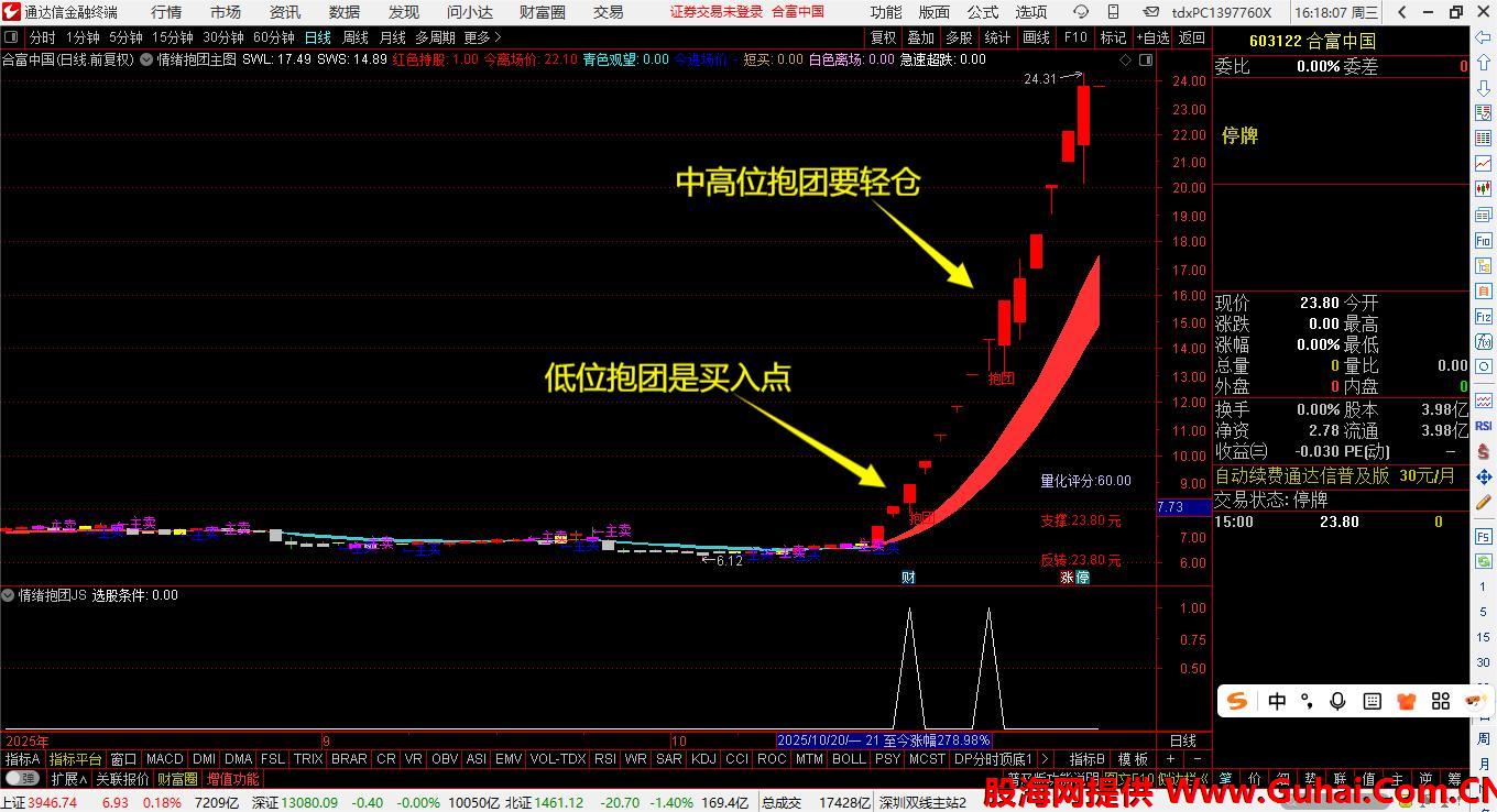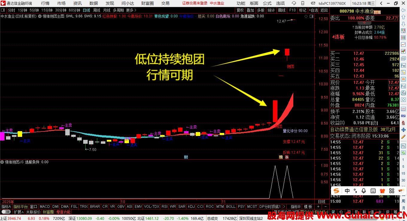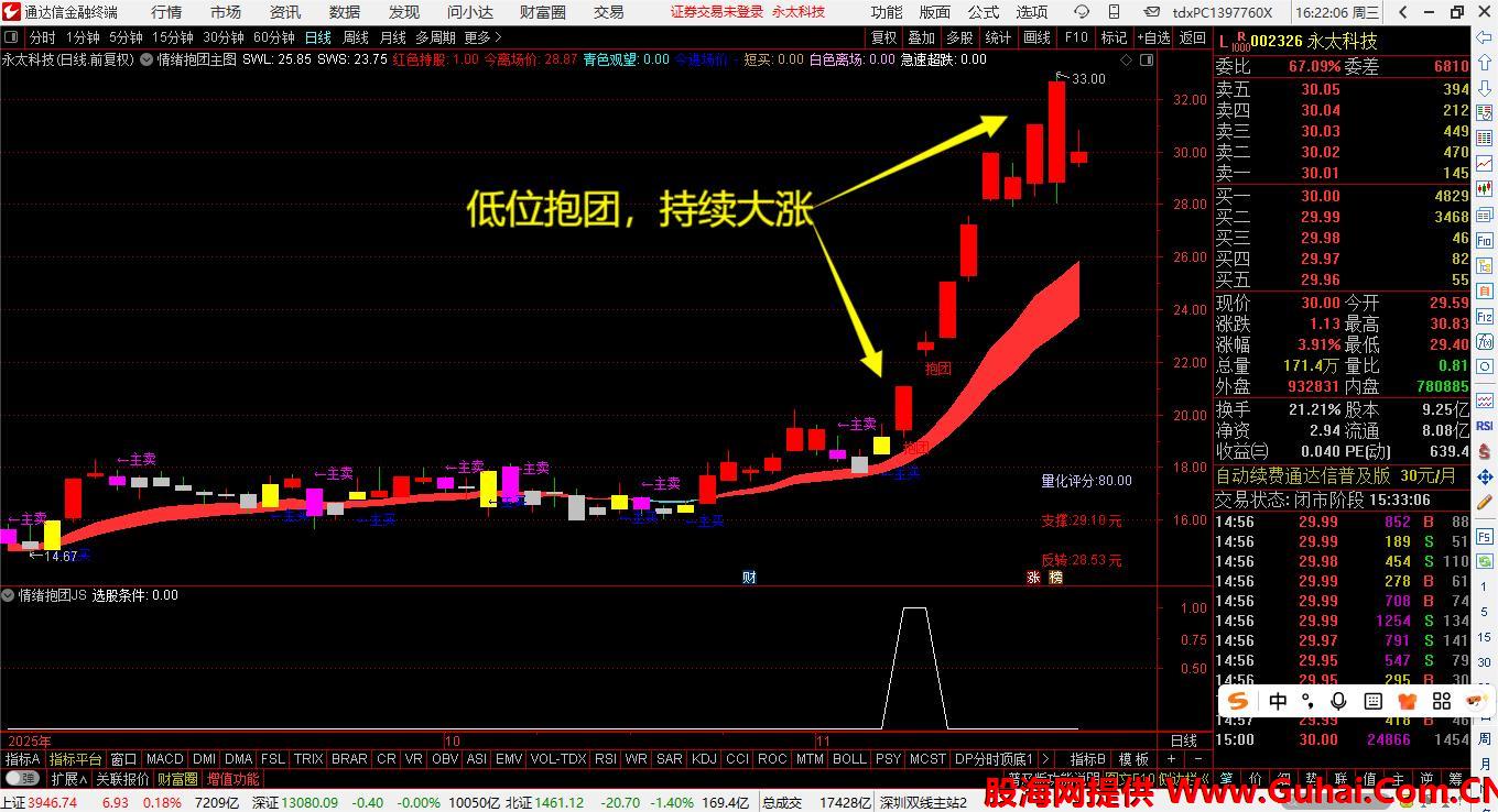 相关简介:本策略聚焦“情绪+资金+技术”三重共振,专攻涨停基因明确、主力深度介入的抱团强势股,尤其是在市场震荡、下跌中表现优秀。个股达到条件时,在主图中有明确的“抱团”字样,低位抱团是最佳买入点,中位抱团要轻仓,一般行情还会持续,高位抱团(5板以上)不要进;是实现利润翻倍不可或缺智能工具。