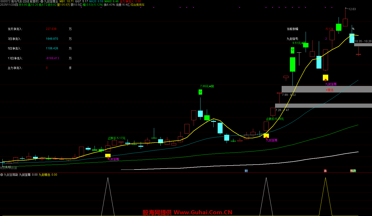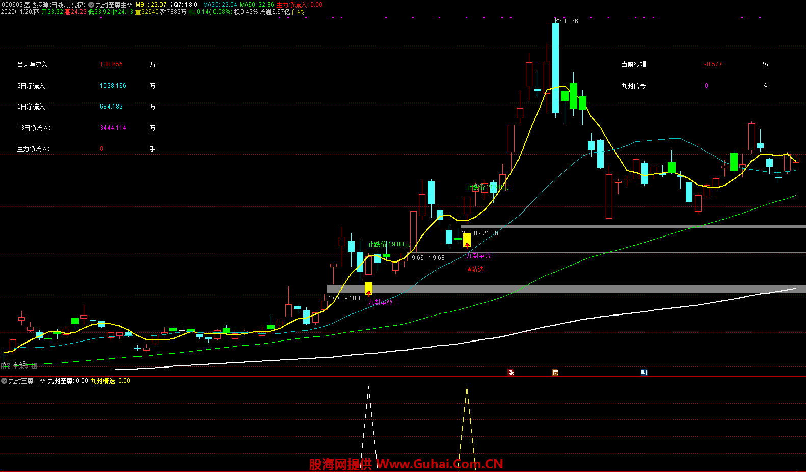 操作策略是在出现“九封至尊”信号时关注,若同时满足“九封精选”条件(即近期有多次强势表现)则作为更优买入点。