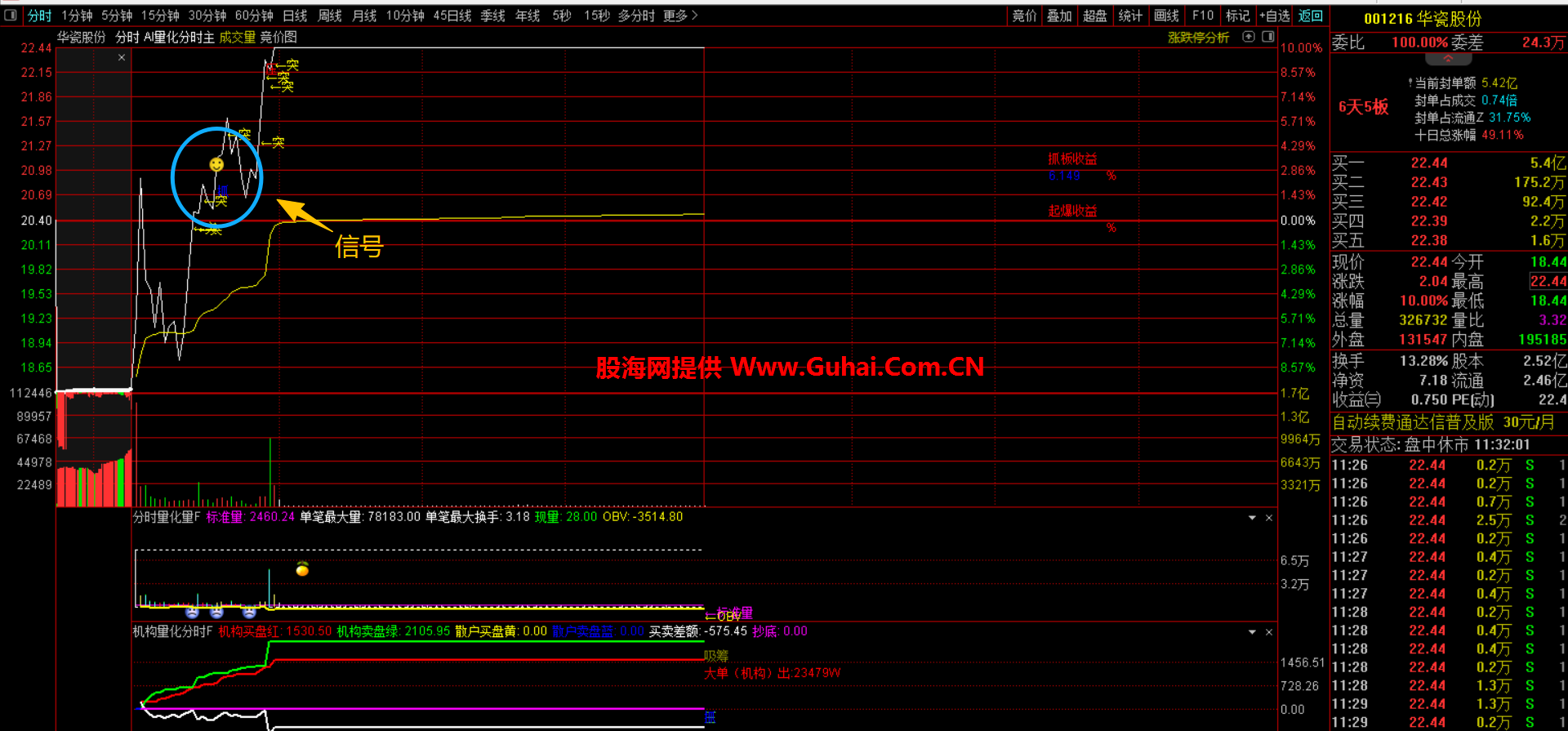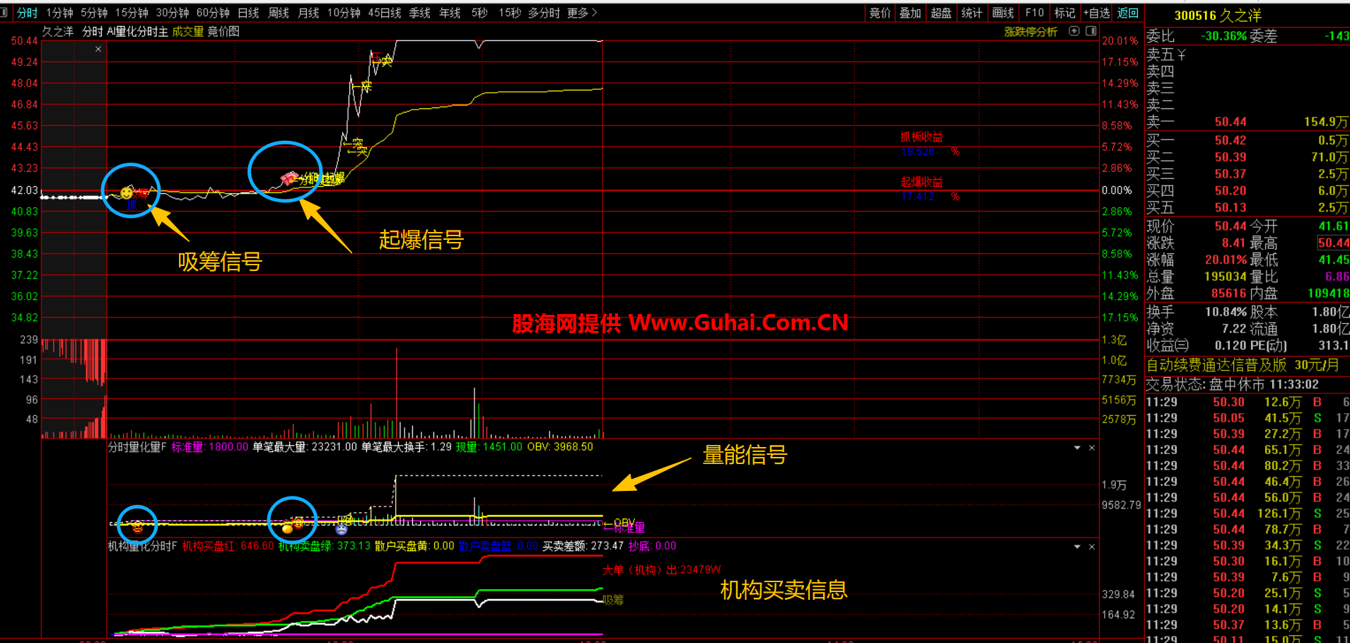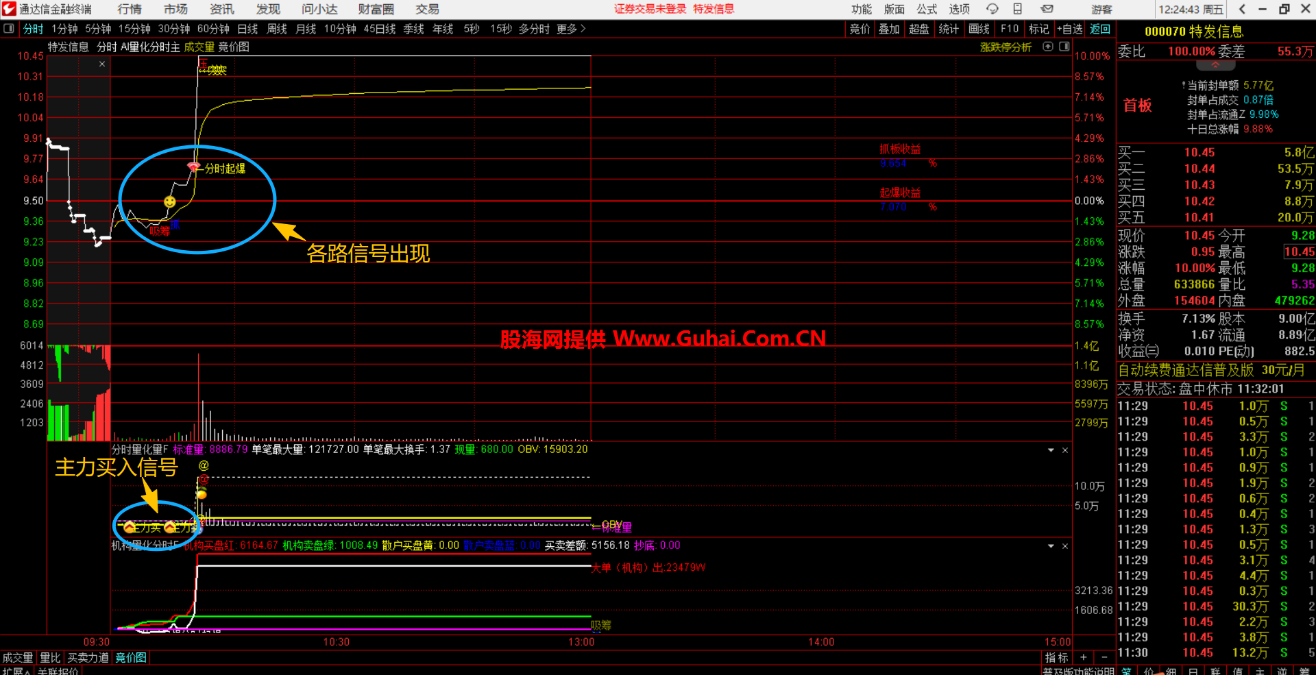 主要功能:通过分析价格突破、成交量放大、机构资金动向等多重条件,在分时图上标记"分时起爆"和"全仓"等买入信号。同时计算起爆收益和抓板收益,辅助判断短期爆发力。