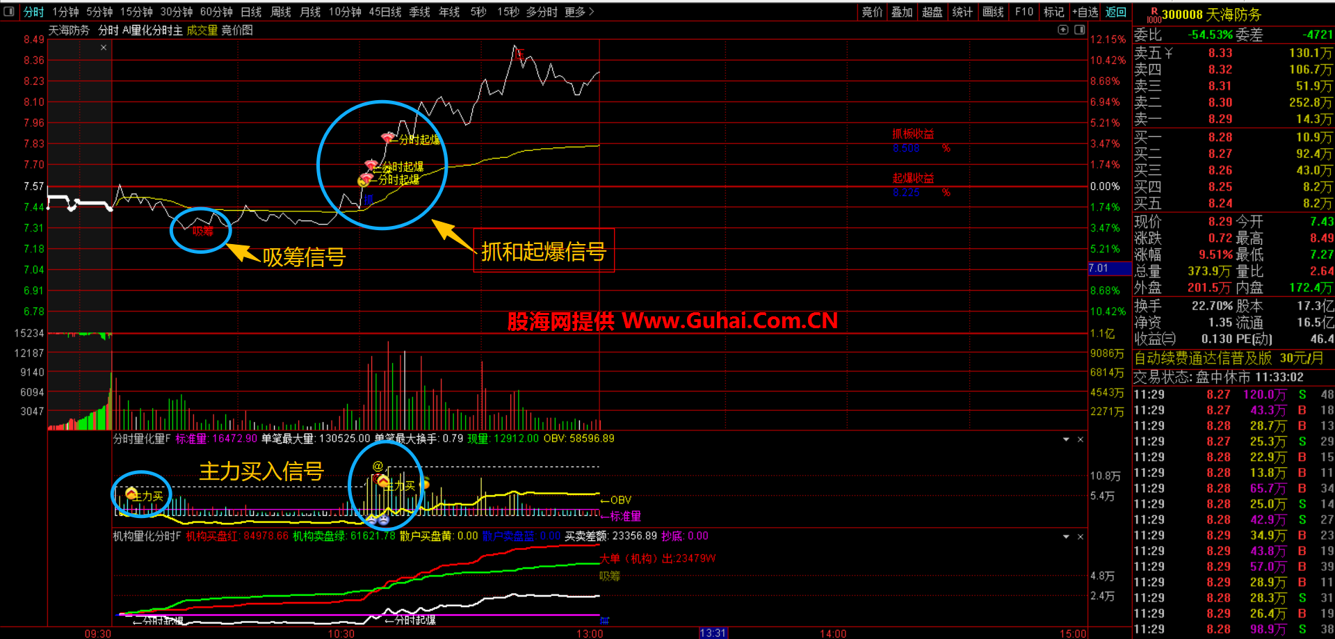 指标主要用于捕捉股票在分时图上的强势启动信号,帮助投资者识别主力资金介入的时机。