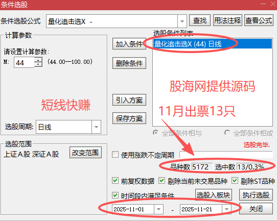本模式旨在:用最短的时间赚最快的钱;用最好的买点抓最好的波段。其信号少而精,在时间段选股中,21个交易日仅选出13只标的,平均每天1只。既可以做“尾盘买次日卖”的超短线,又可以视情况做波段。