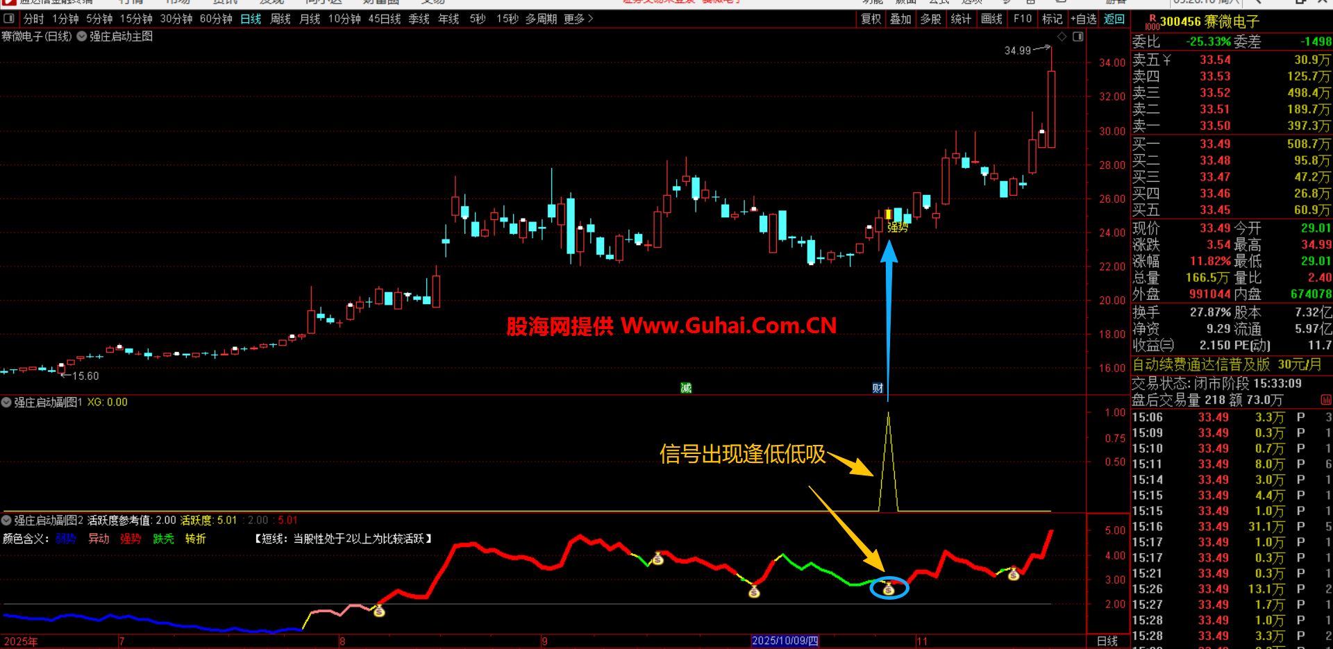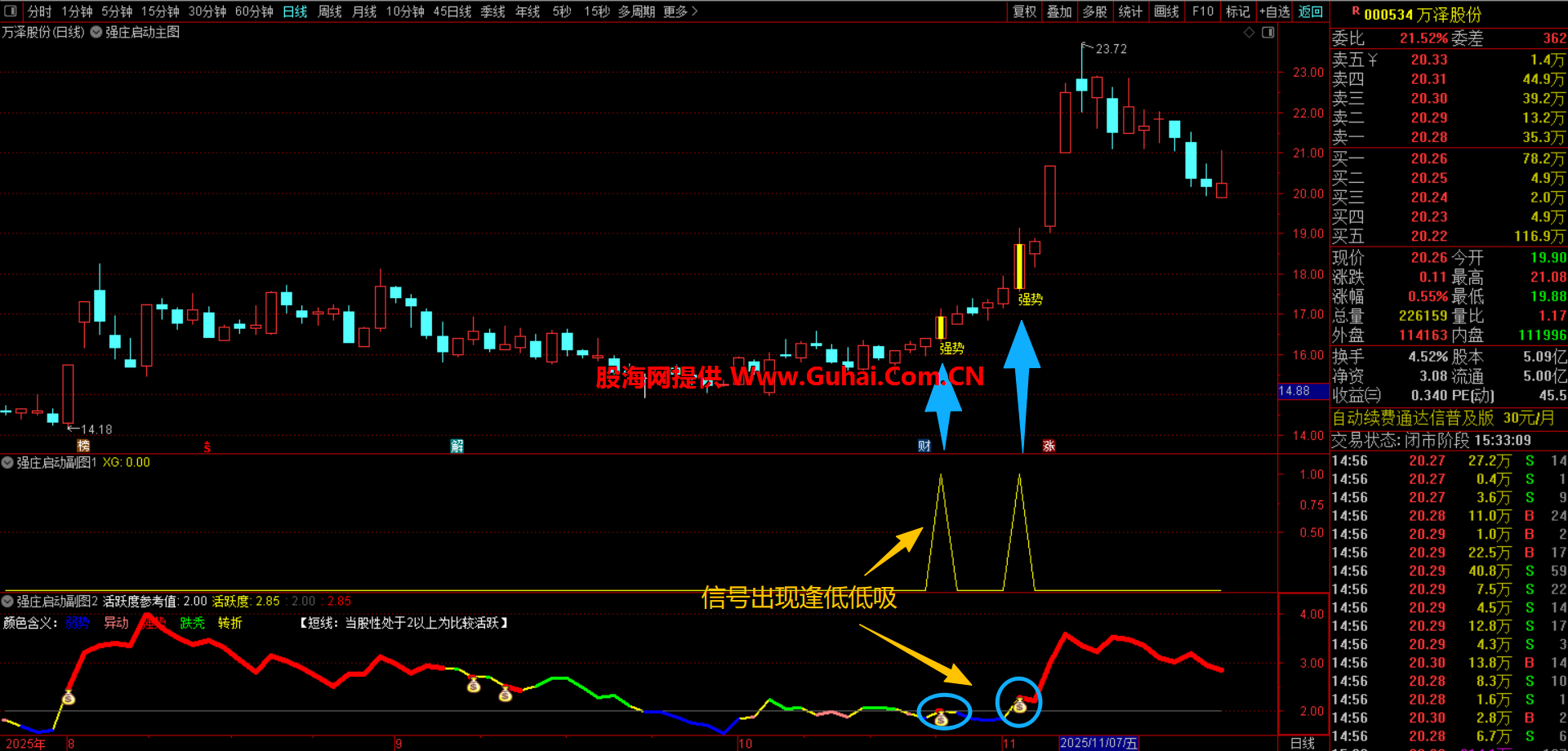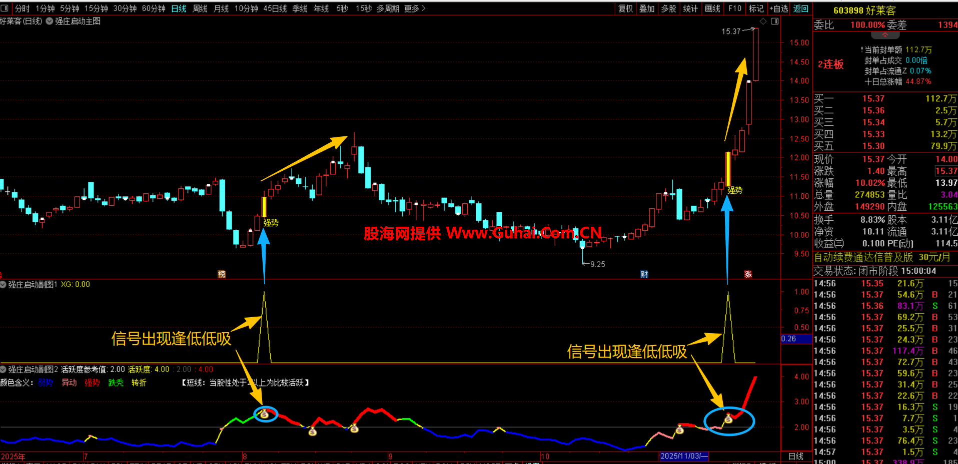 注意事项:趋势向下的不要选,强庄启动两个信号要同时,方可以逢低低吸,需配合5%止损纪律或(破前低止损)