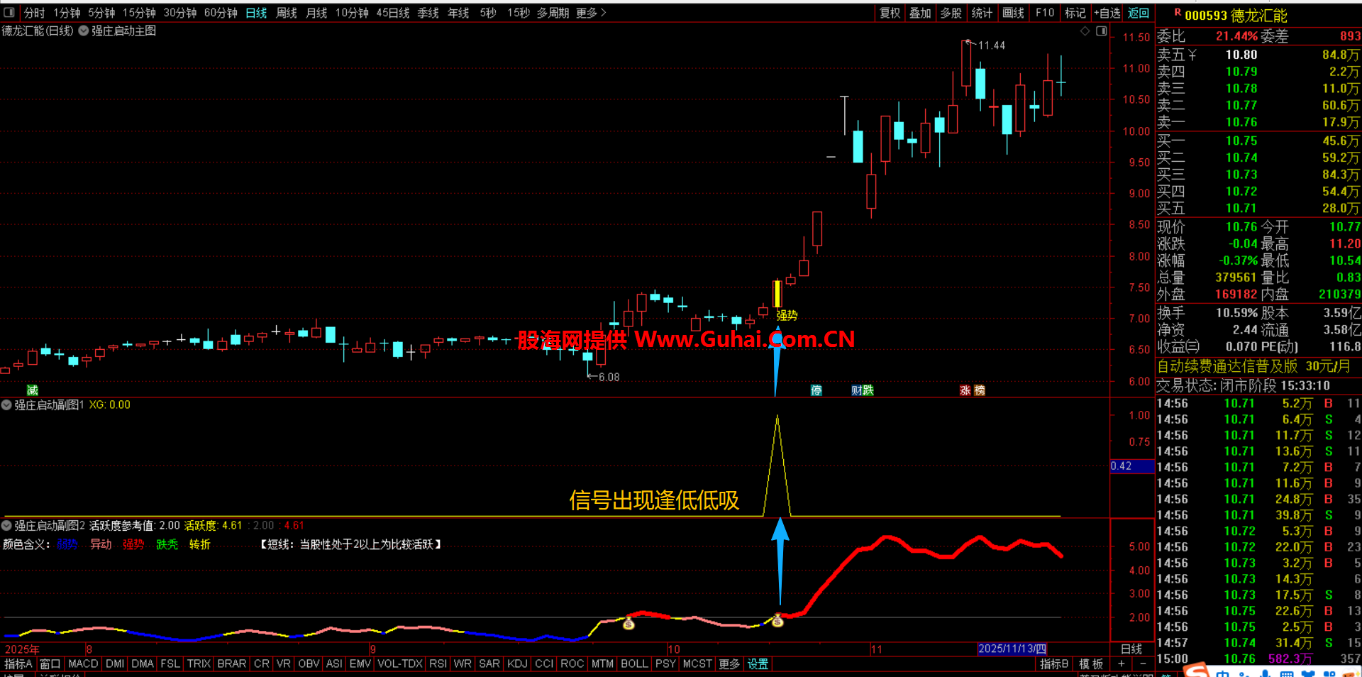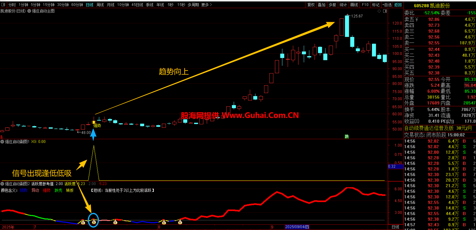 操作策略:当股票满足趋势指标转强、活跃度达标后,在首次出现连续三根阳线(非涨停)时考虑介入。