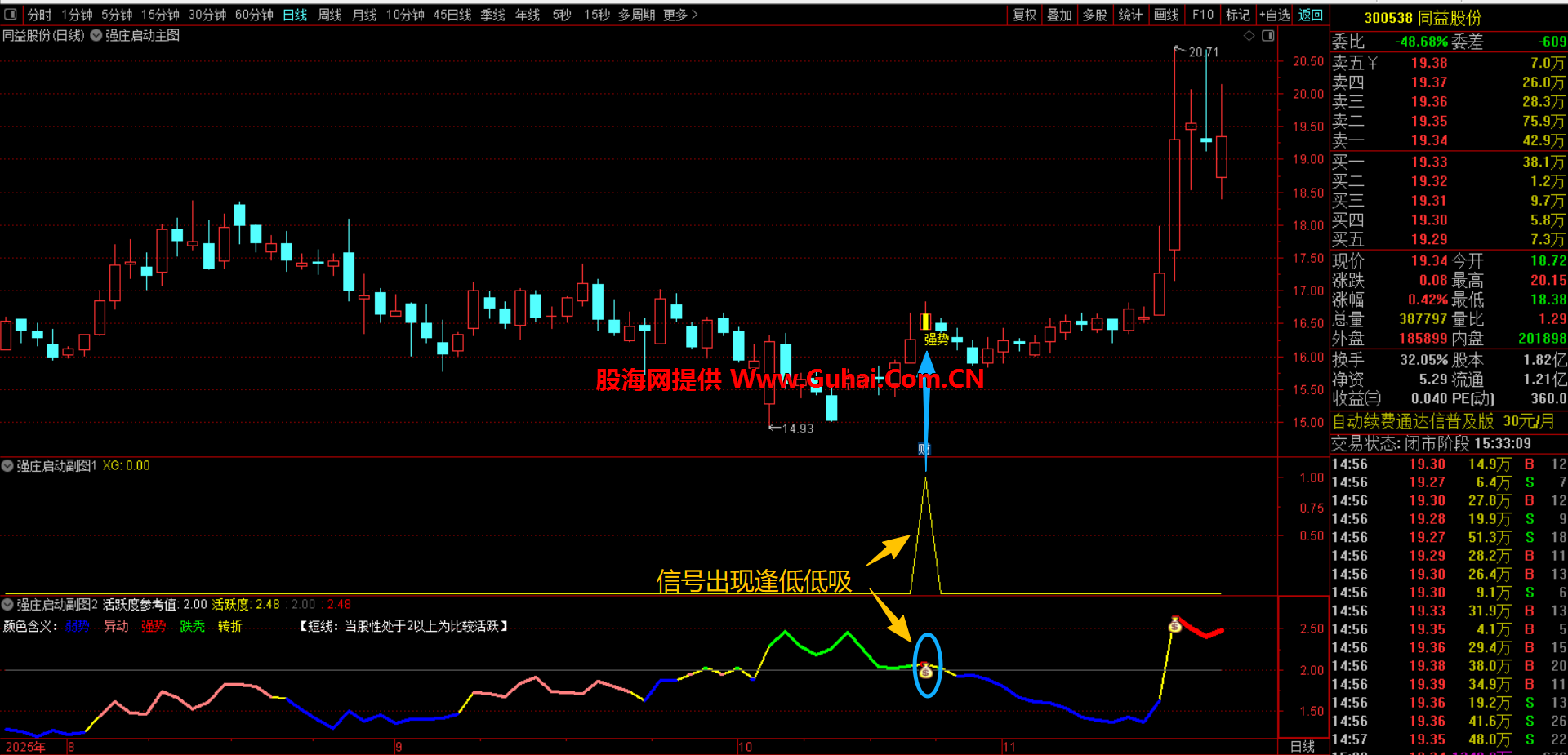 指标主要用于识别股票短期启动信号。核心逻辑是结合价格趋势、资金活跃度和K线形态进行选股。