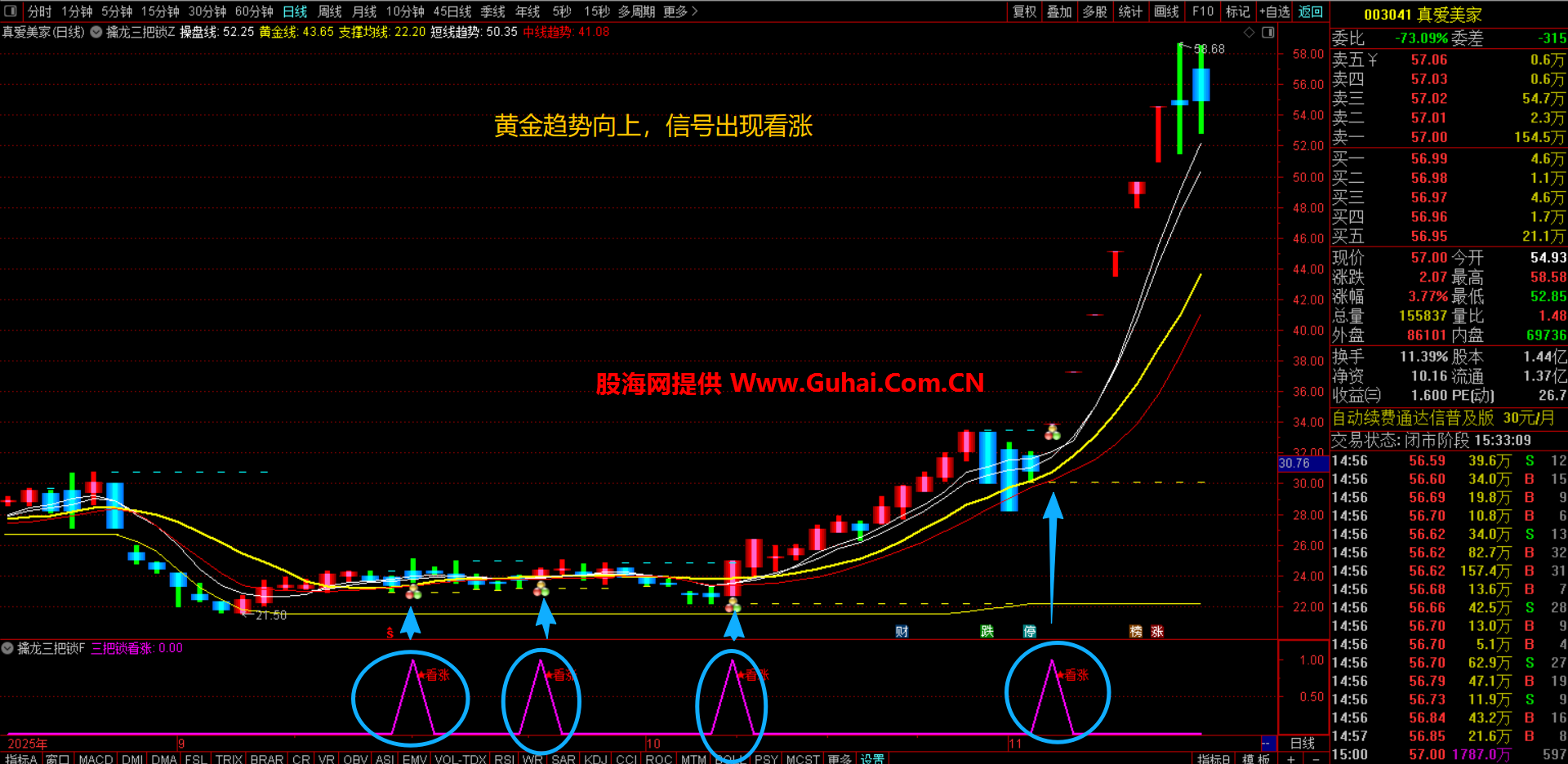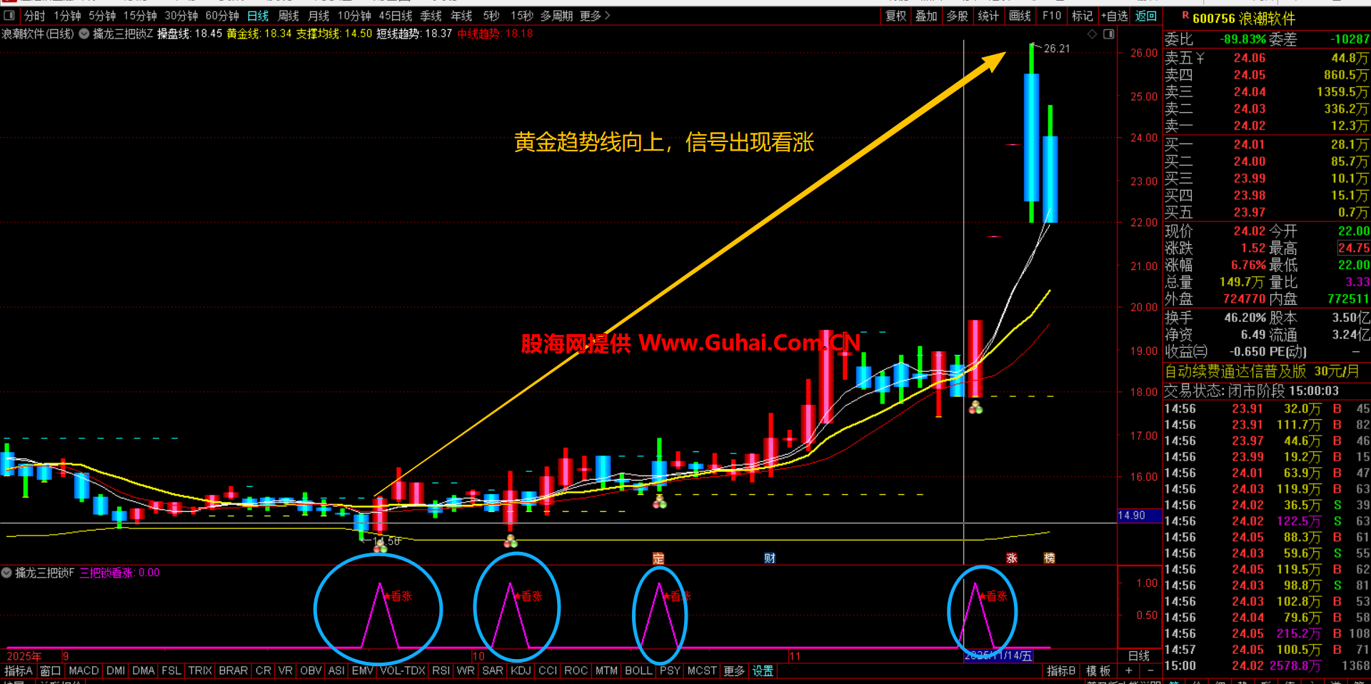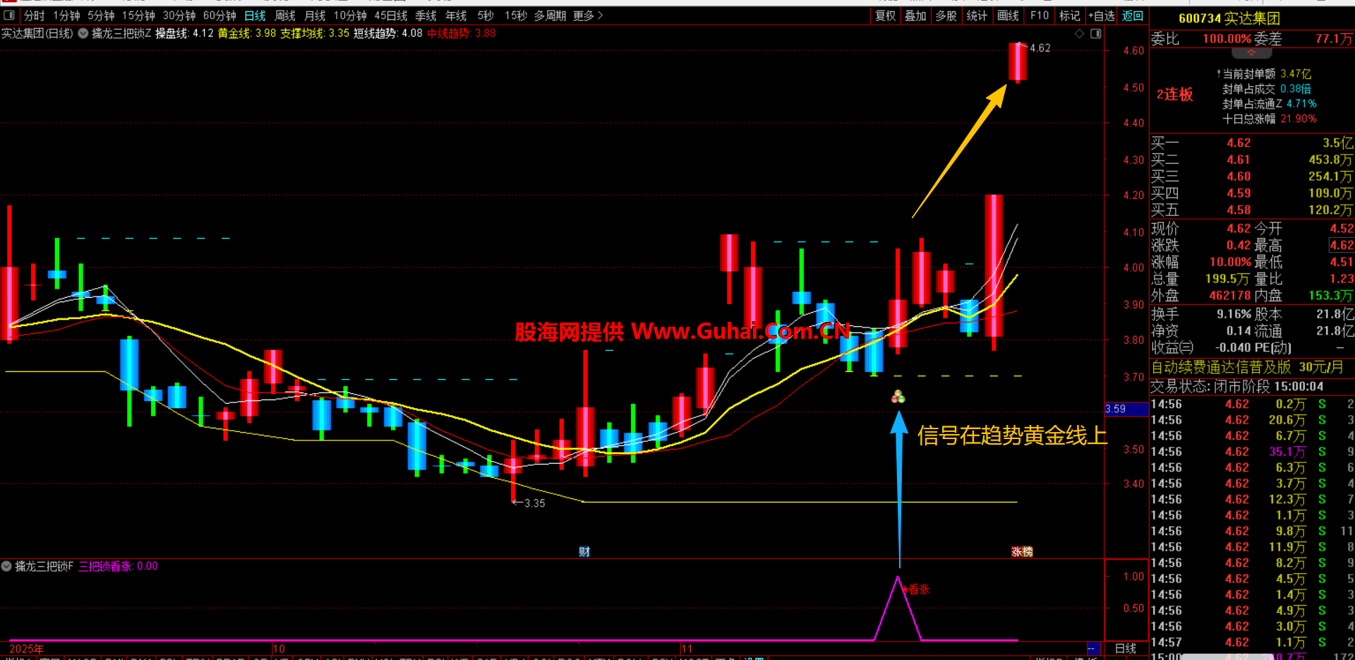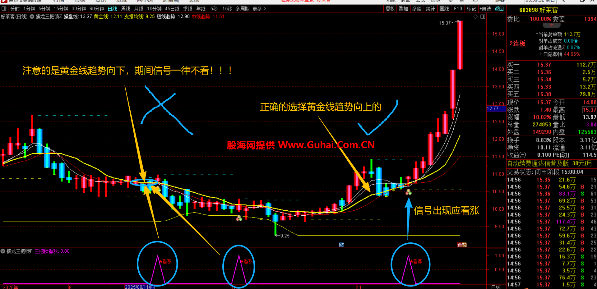 注意的是:黄金线趋势向下的信号不要选,等黄金线趋势拐头向上信号且收盘价站稳黄金线出现才选择!!!