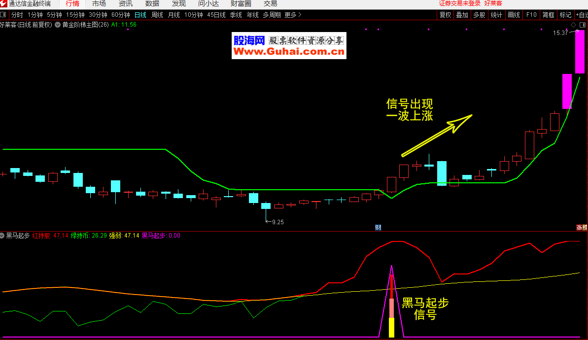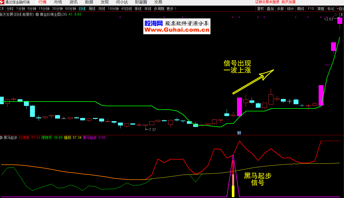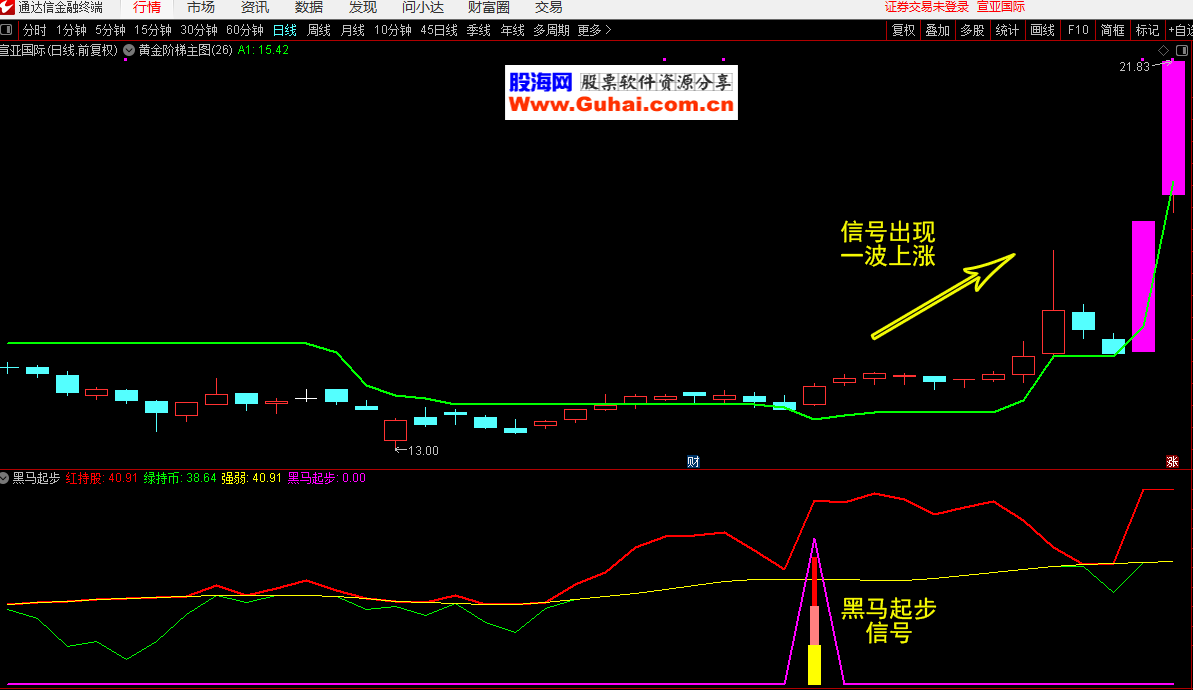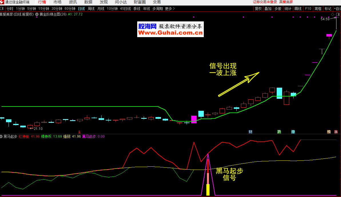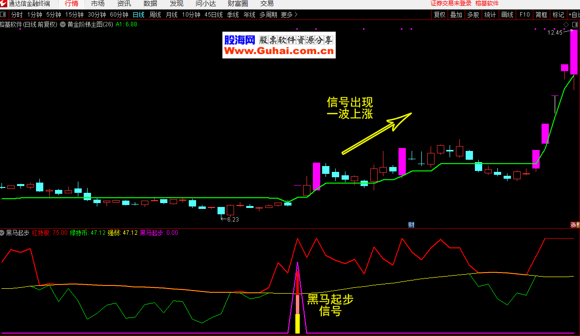 黑马起步副图出现信号后,可关注介入,优先选择黄金阶梯主图向上的个股,特别是有热点题材时更要看多做多,跌破信号K线最低点要果断离场。