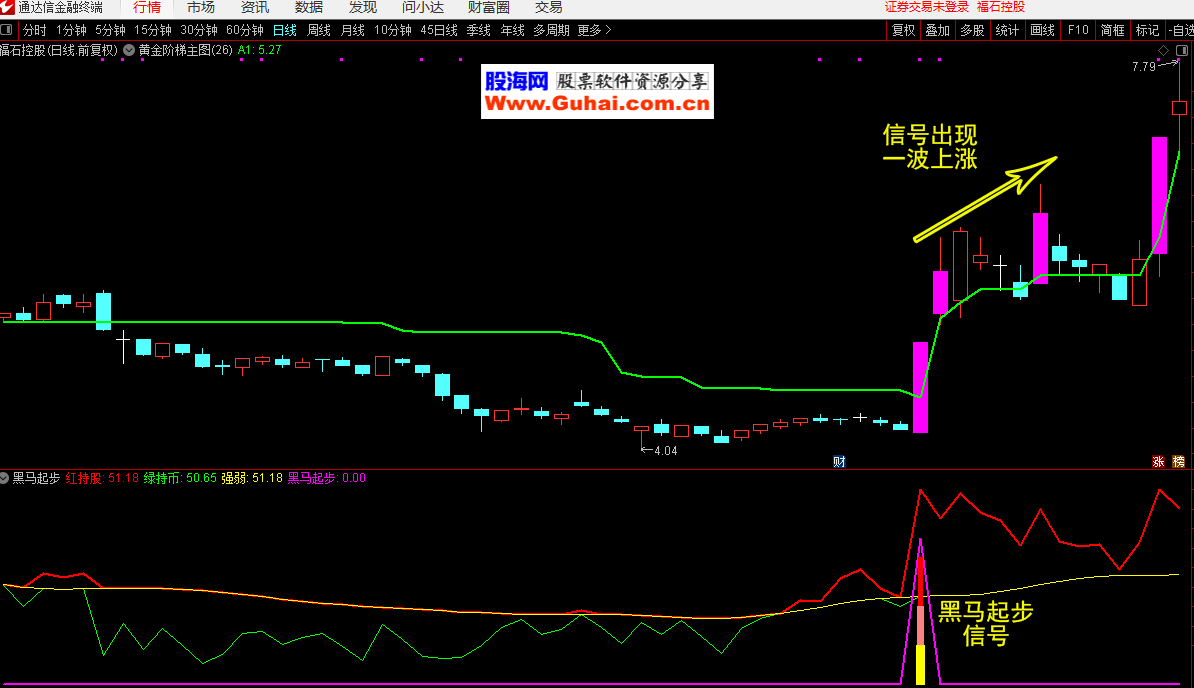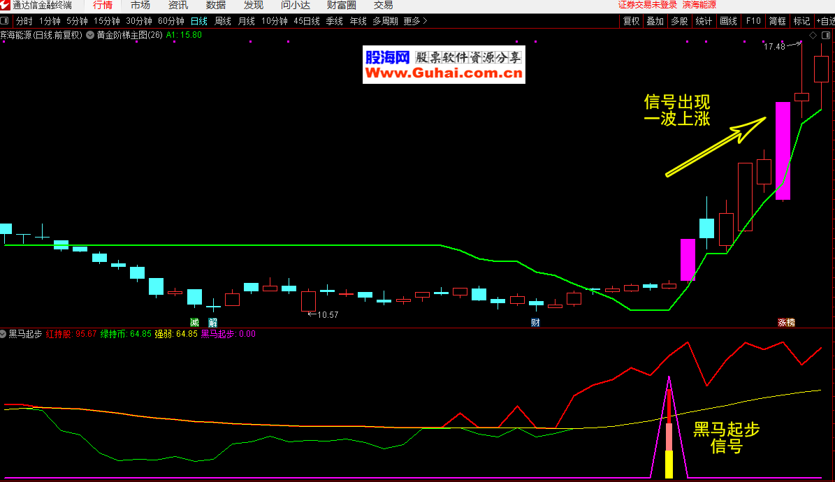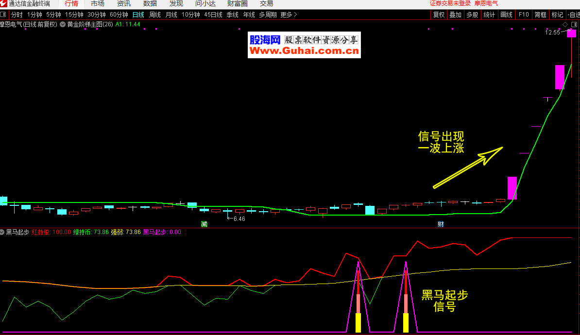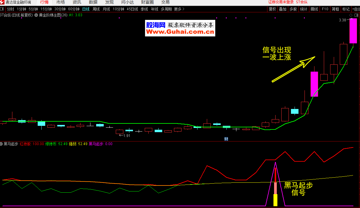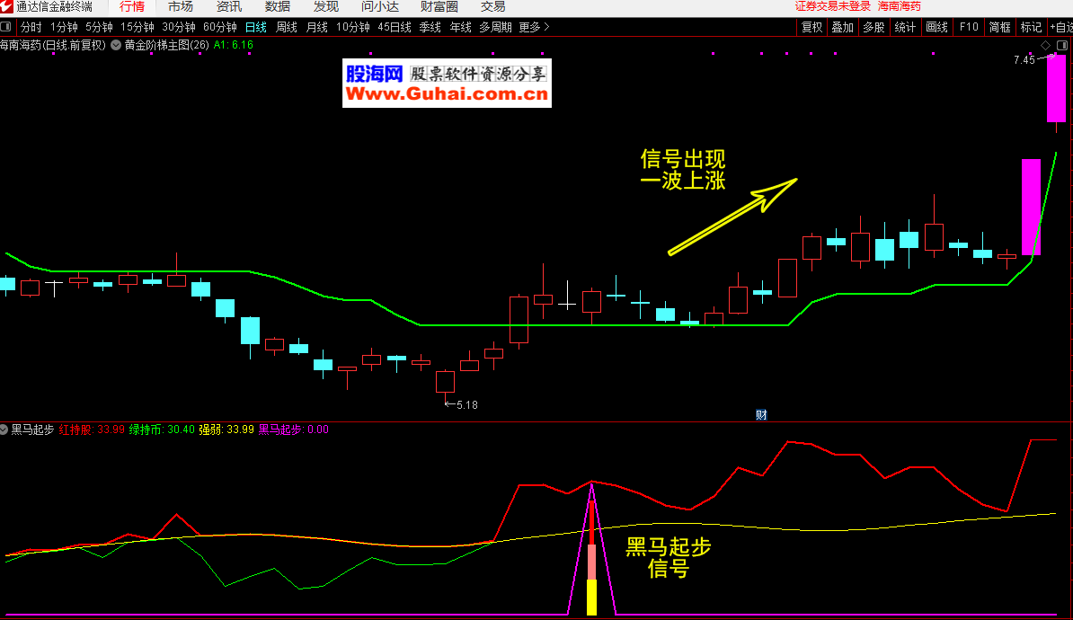 黑马起步副图出现信号后,可关注介入,优先选择黄金阶梯主图向上的个股,特别是有热点题材时更要看多做多,跌破信号K线最低点要果断离场。