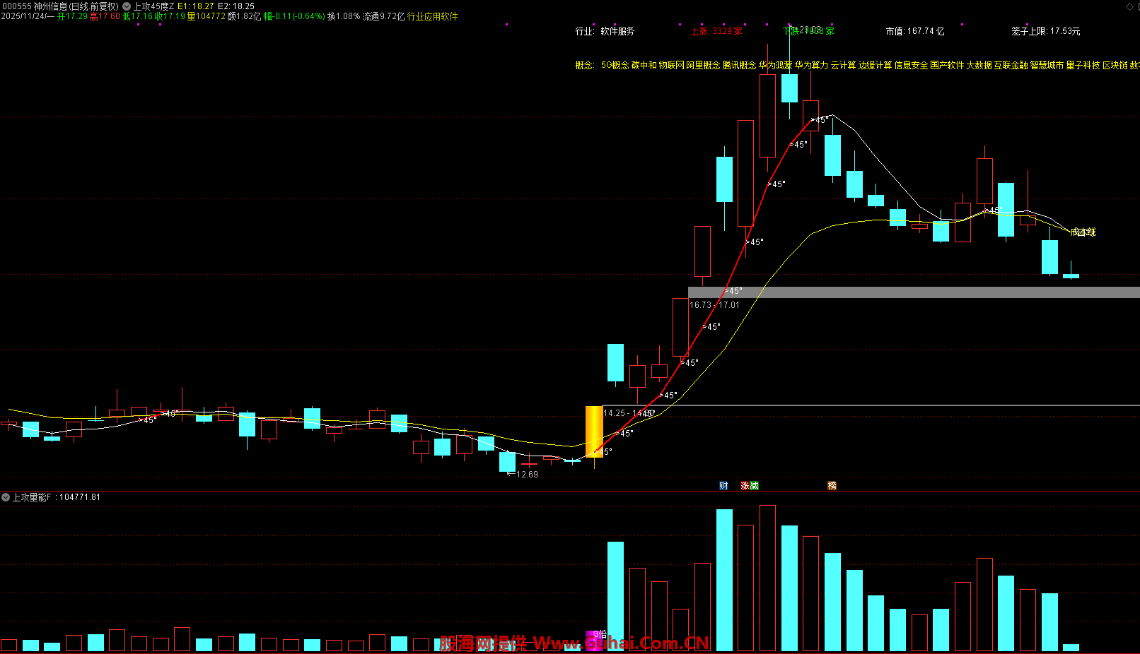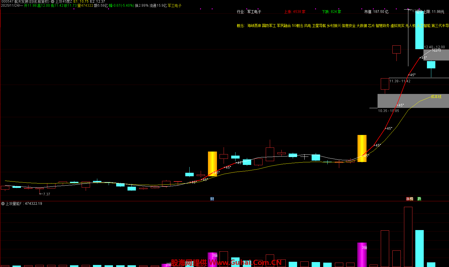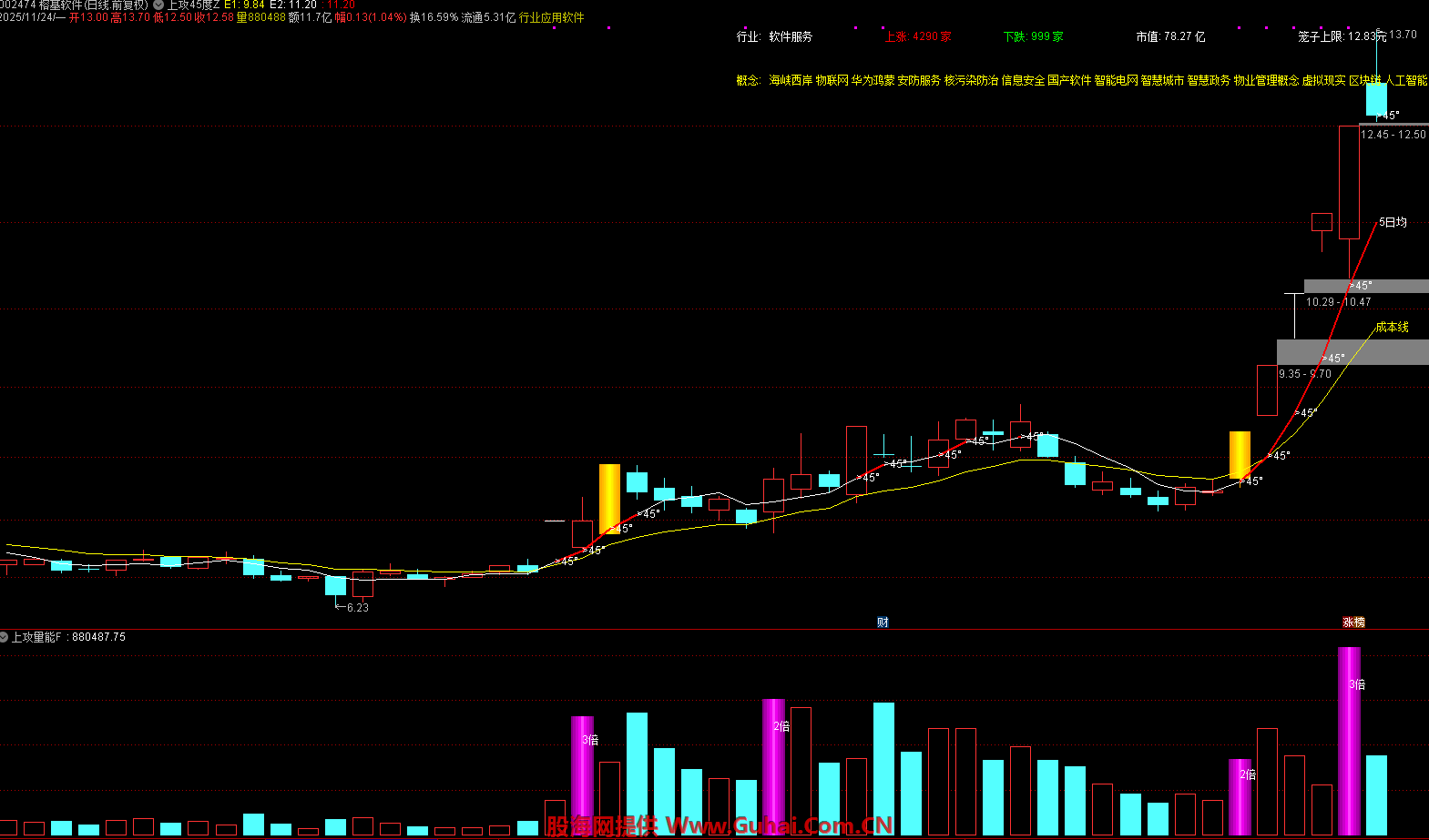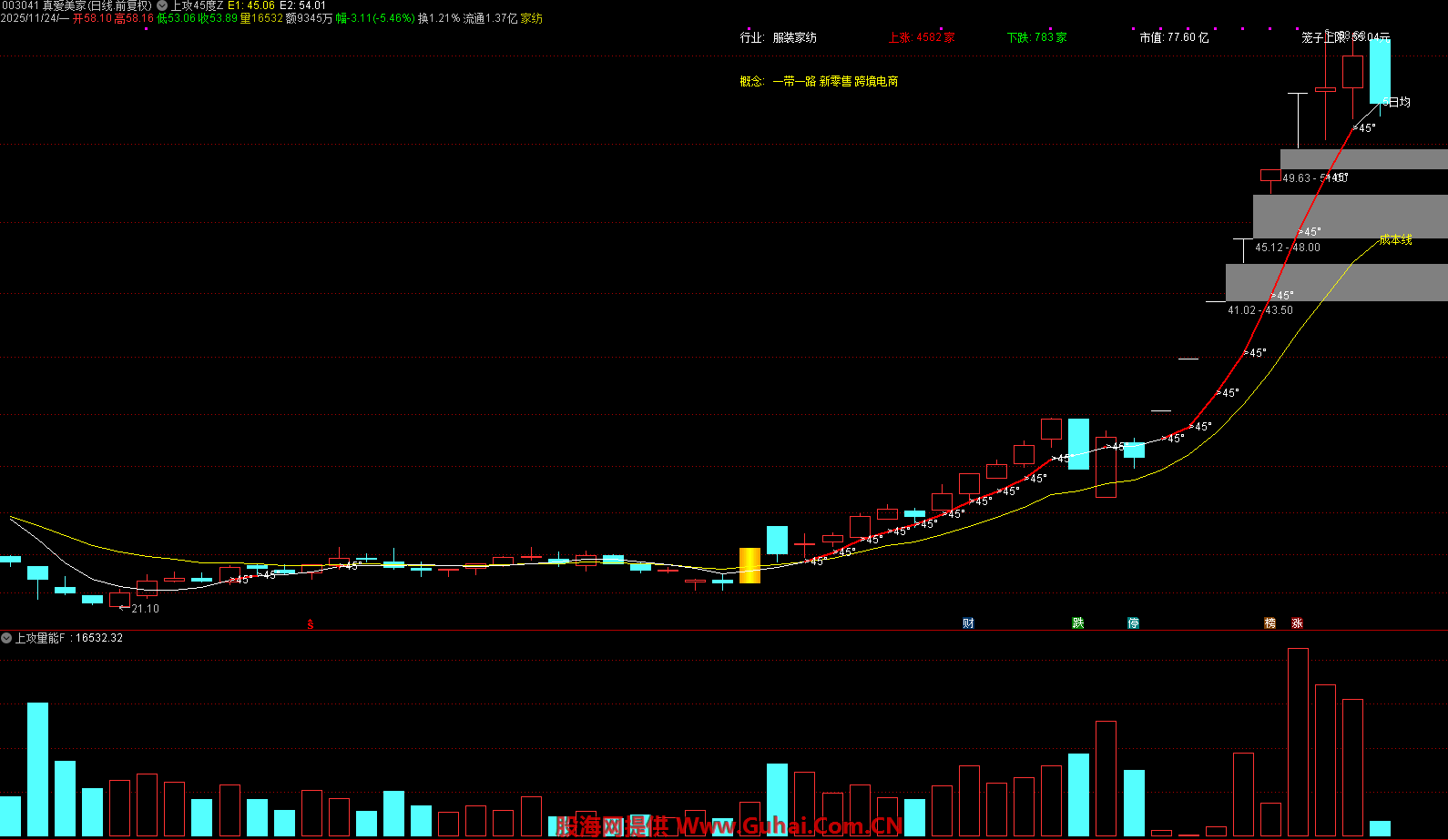 指标体系包含两个指标:上攻45度主图指标直观显示趋势强度,上攻量能副图则辅助验证动能持续性。二者结合可精准捕捉趋势股主升浪,是抖音热门推荐的实战型量化工具,助投资者把握翻倍行情起点。