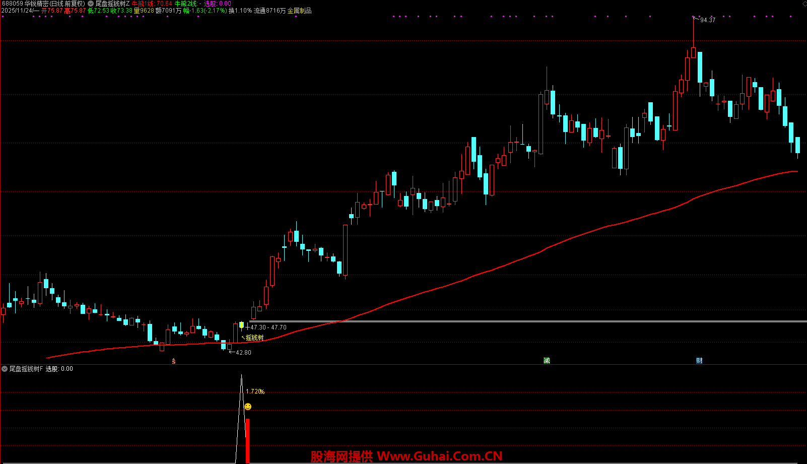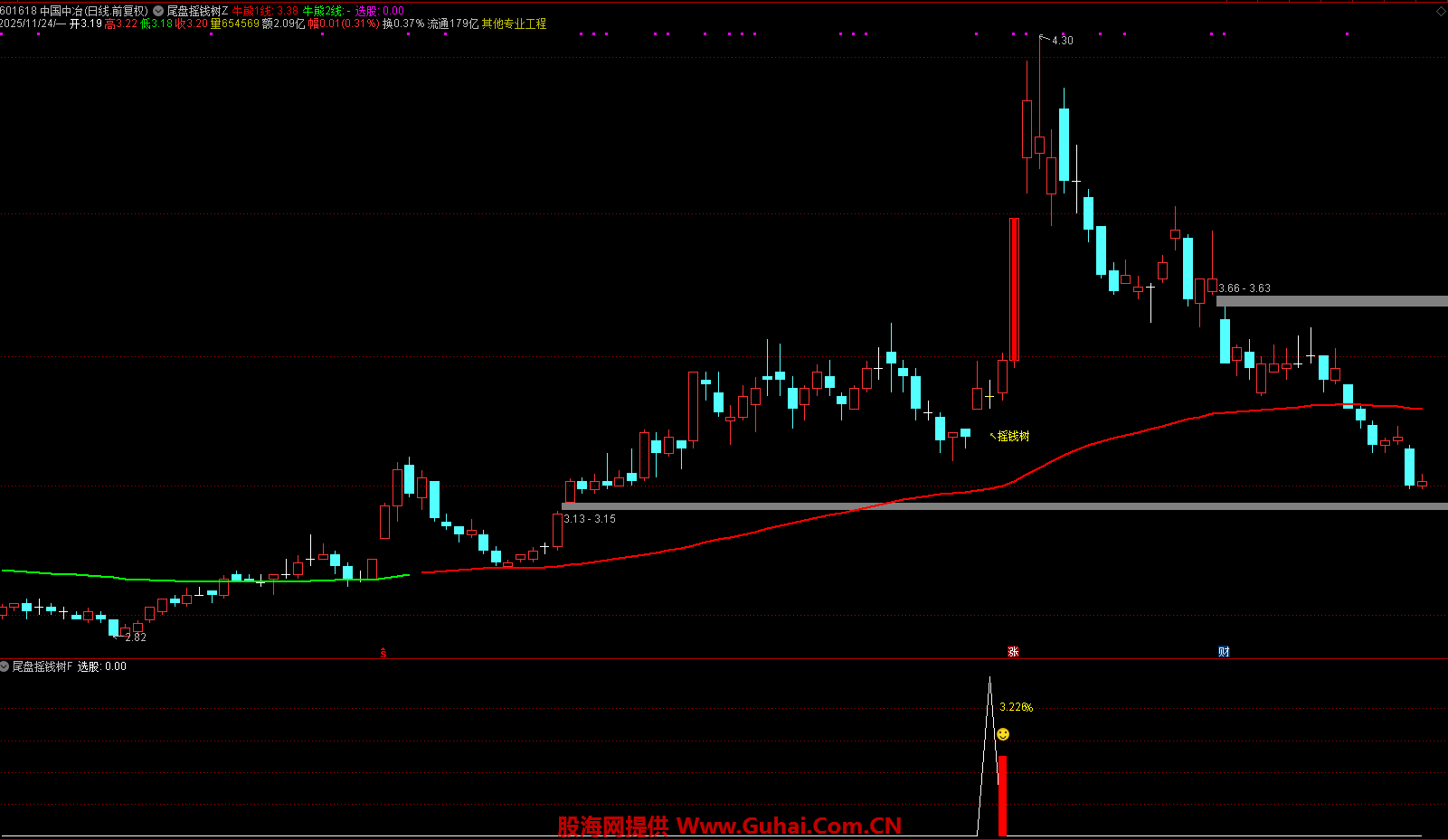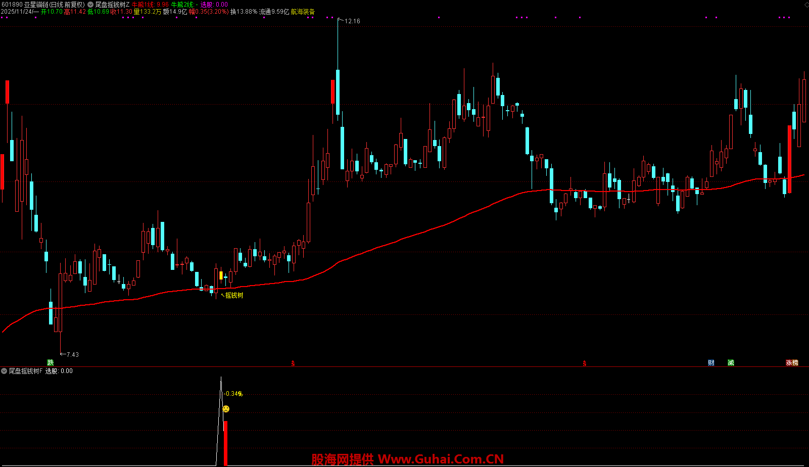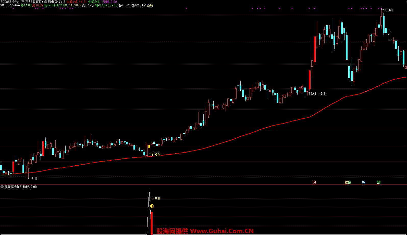 相关简介:指标通过多重条件过滤,结合价格趋势、均线系统、成交量等因素进行判断,尾盘选股,兼顾短线波段,信号适中。