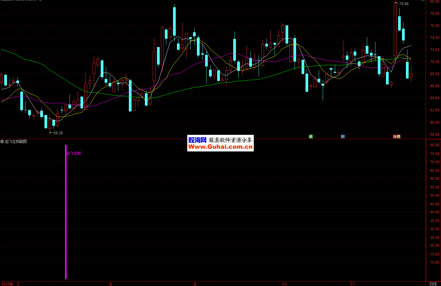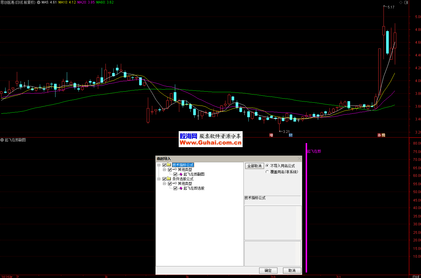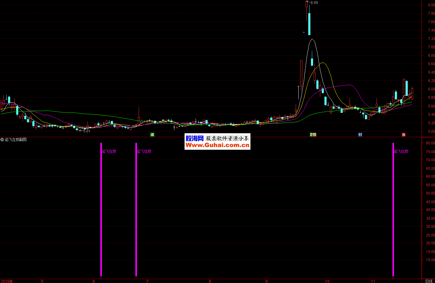 二、通达信〖起飞在即〗副图/选股 识别股票即将启动上涨的转折点 源码 指标通过计算价格在不同周期内的相对位置和动量变化,识别股票即将启动上涨的转折点。当短期动量线上穿长期动量线且处于低位区域时,发出"起飞在即"信号,提示买入机会。 操作策略:当指标出现紫色信号柱和文字提示时买入,结合其他技术分析确认后介入。