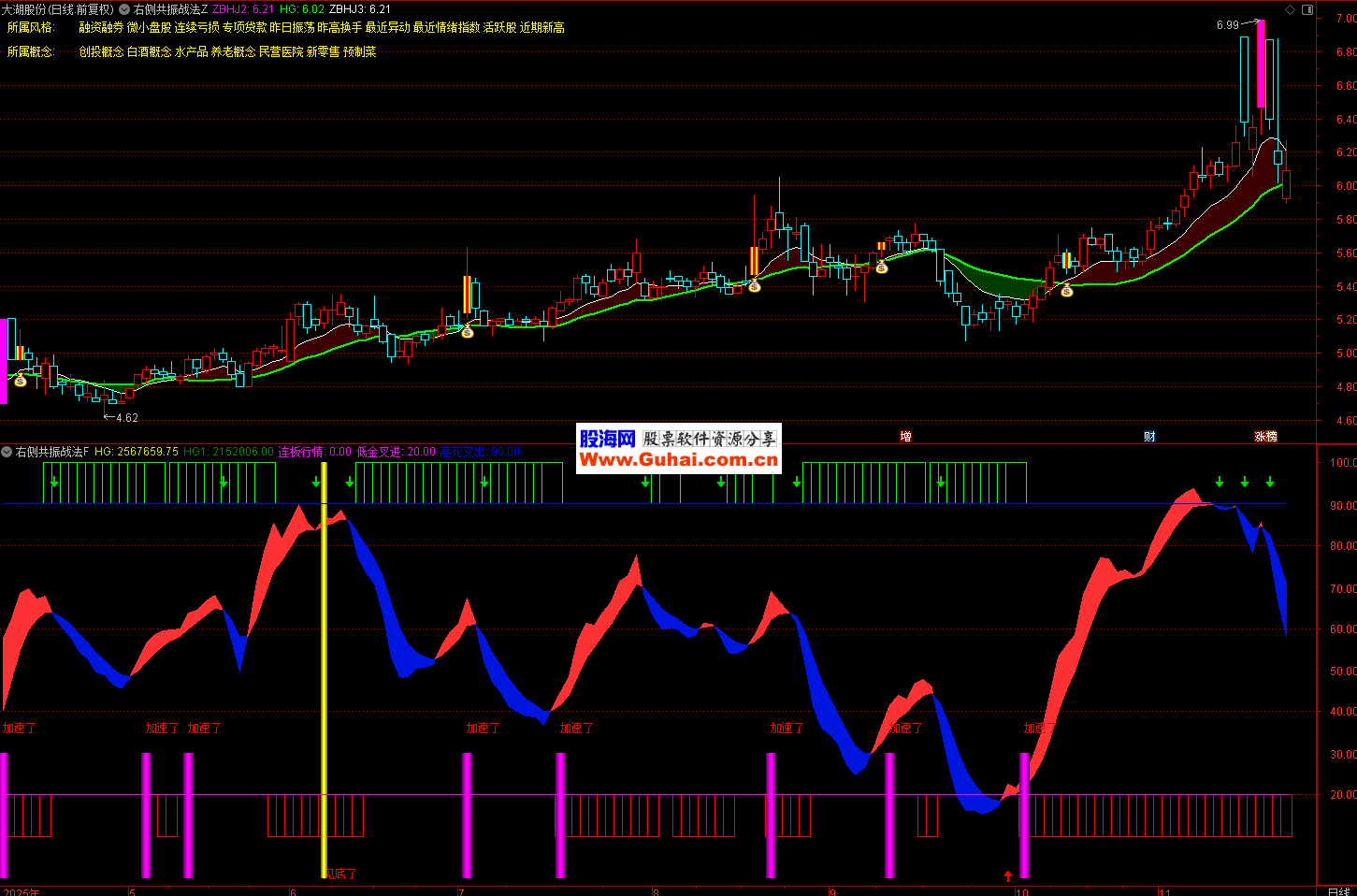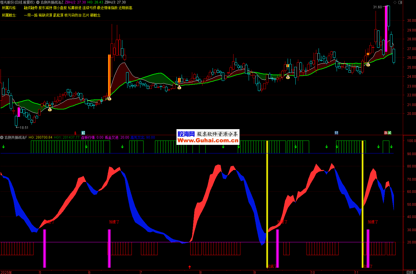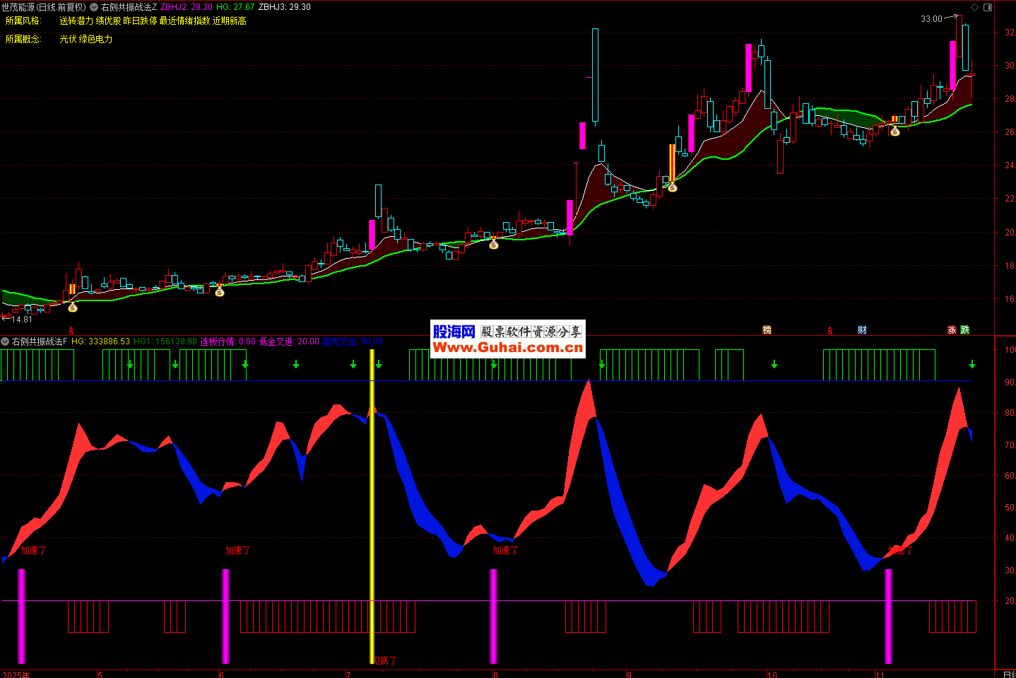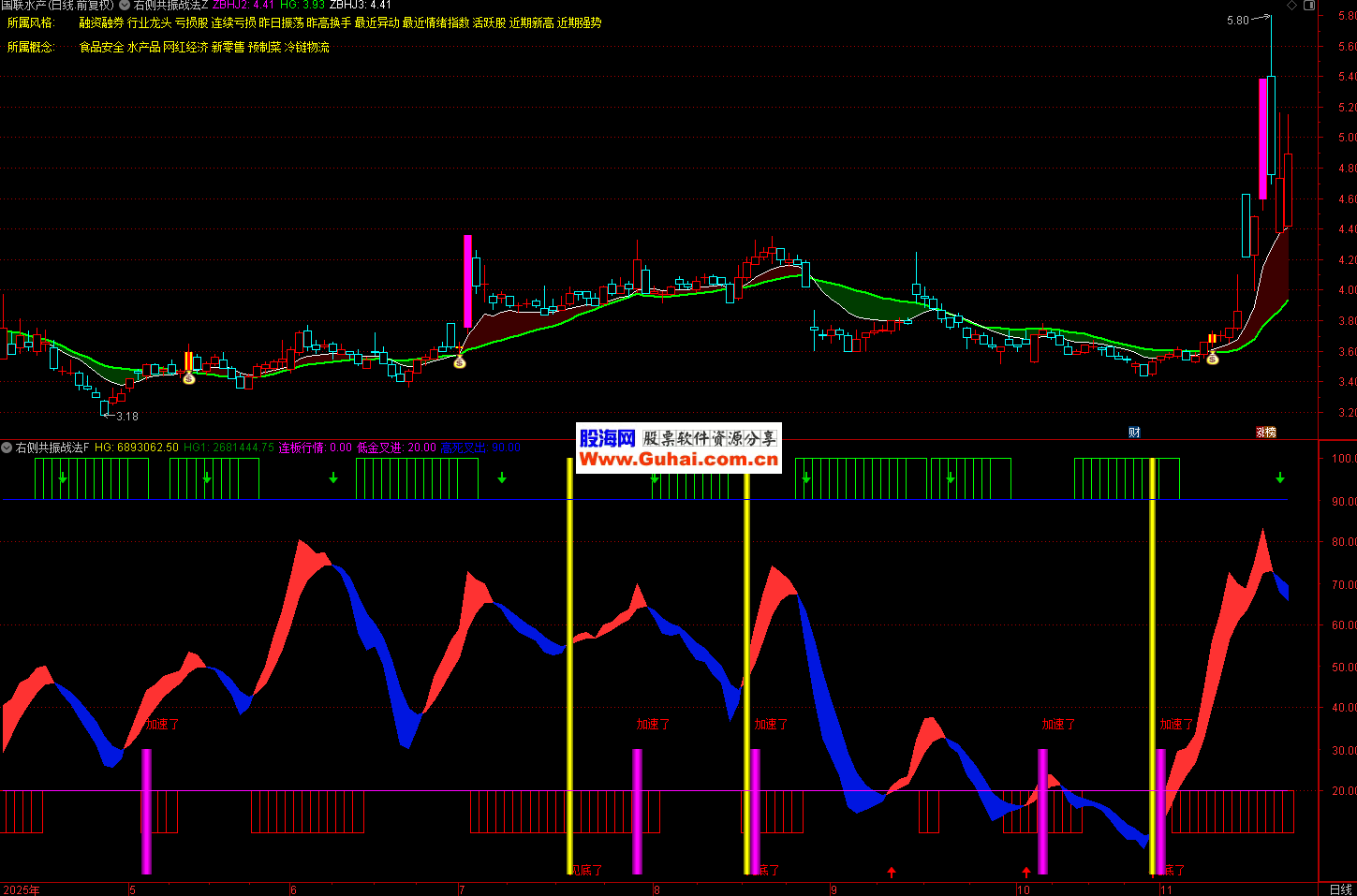 【加速启动信号】—— 主升共振点 条件:在底部共振出现后,主图出现**“钱袋子”图标**,同时副图转为紫色量能柱。