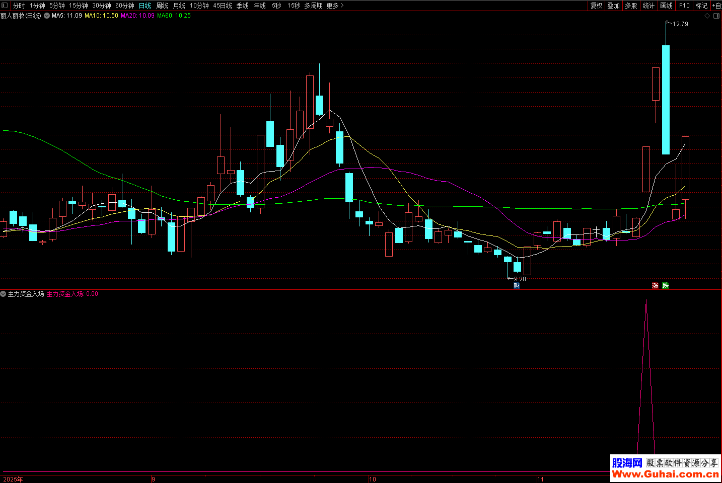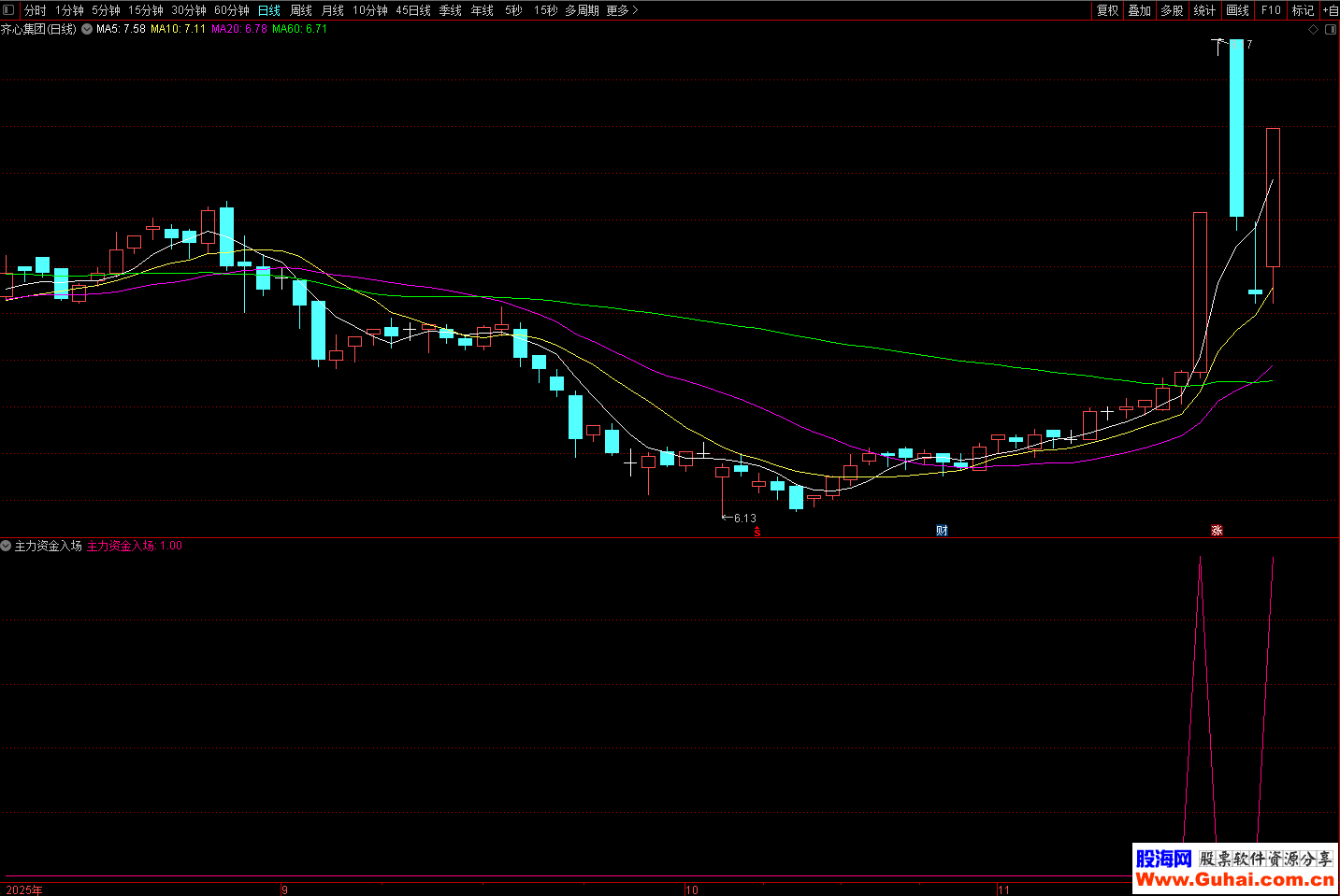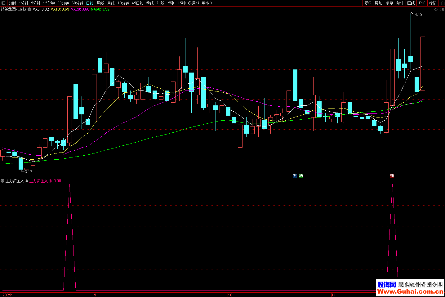指标用于识别主力资金入场时的共振买点信号。当指标发出信号时,表明个股同时满足以下条件: