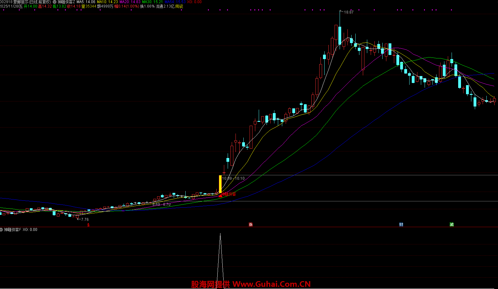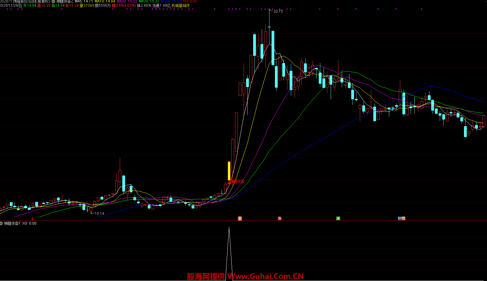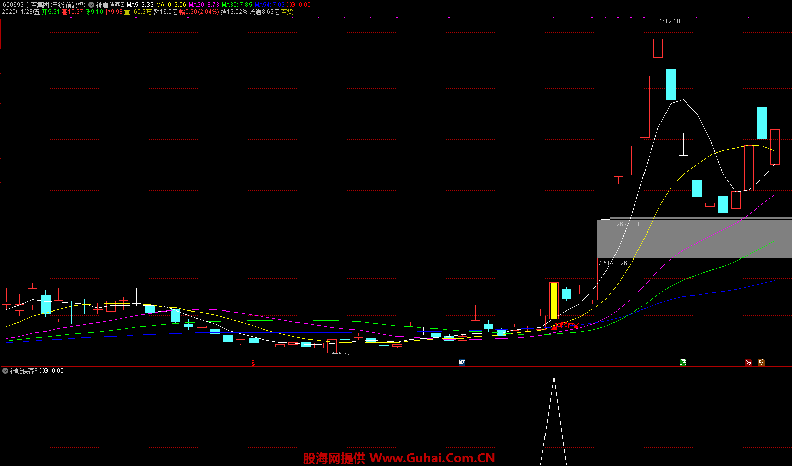 K 线显示为黄色实体,若此时标的处于低位区域,将额外标注 “神雕侠客” 文字标识,并以红色箭头明确标记买入点位,方便投资者直观识别。