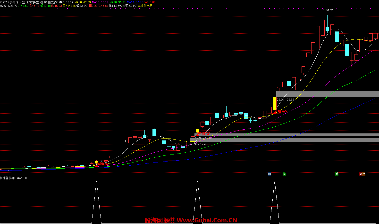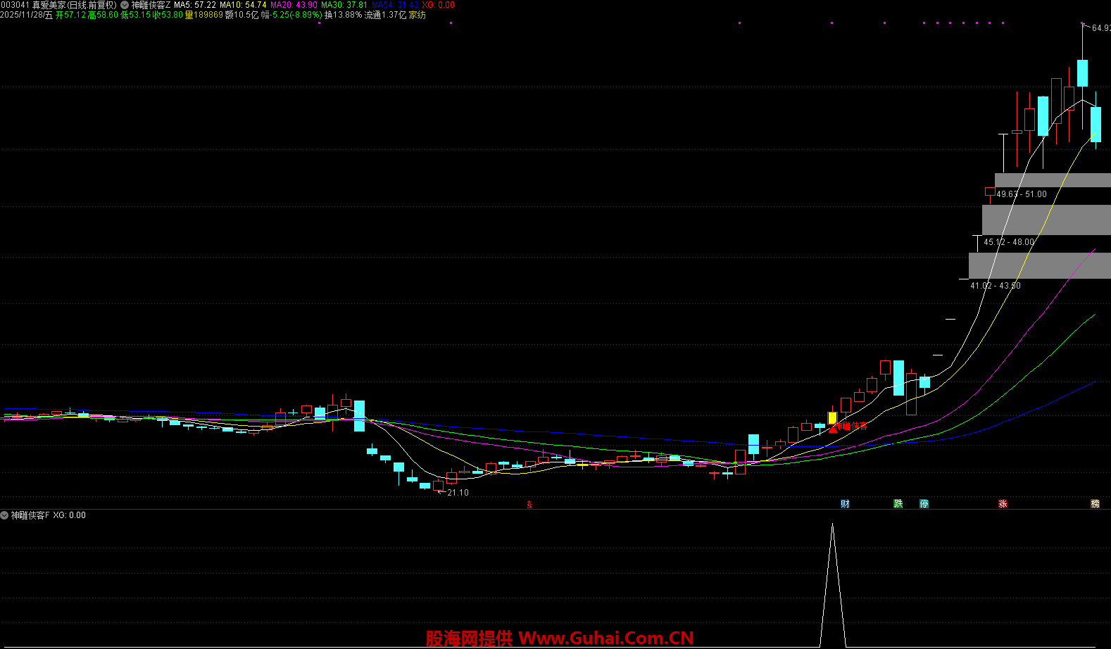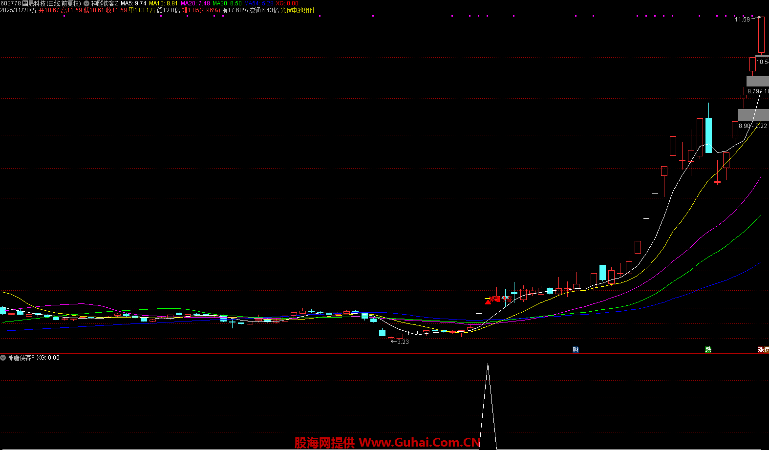 K 线显示为黄色实体,若此时标的处于低位区域,将额外标注 “神雕侠客” 文字标识,并以红色箭头明确标记买入点位,方便投资者直观识别。