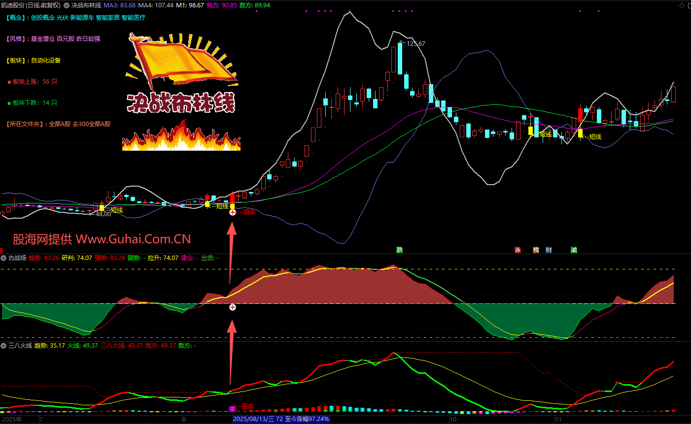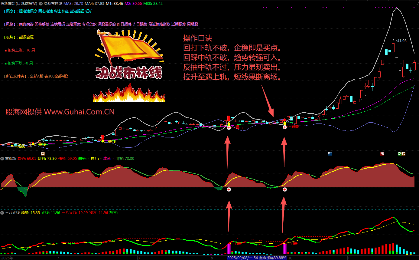 ★中轨(粉线):多头线,通常在股价短期趋势的“中轴线”。在上升趋势中,它是支撑;在下降趋势中,它是阻力。