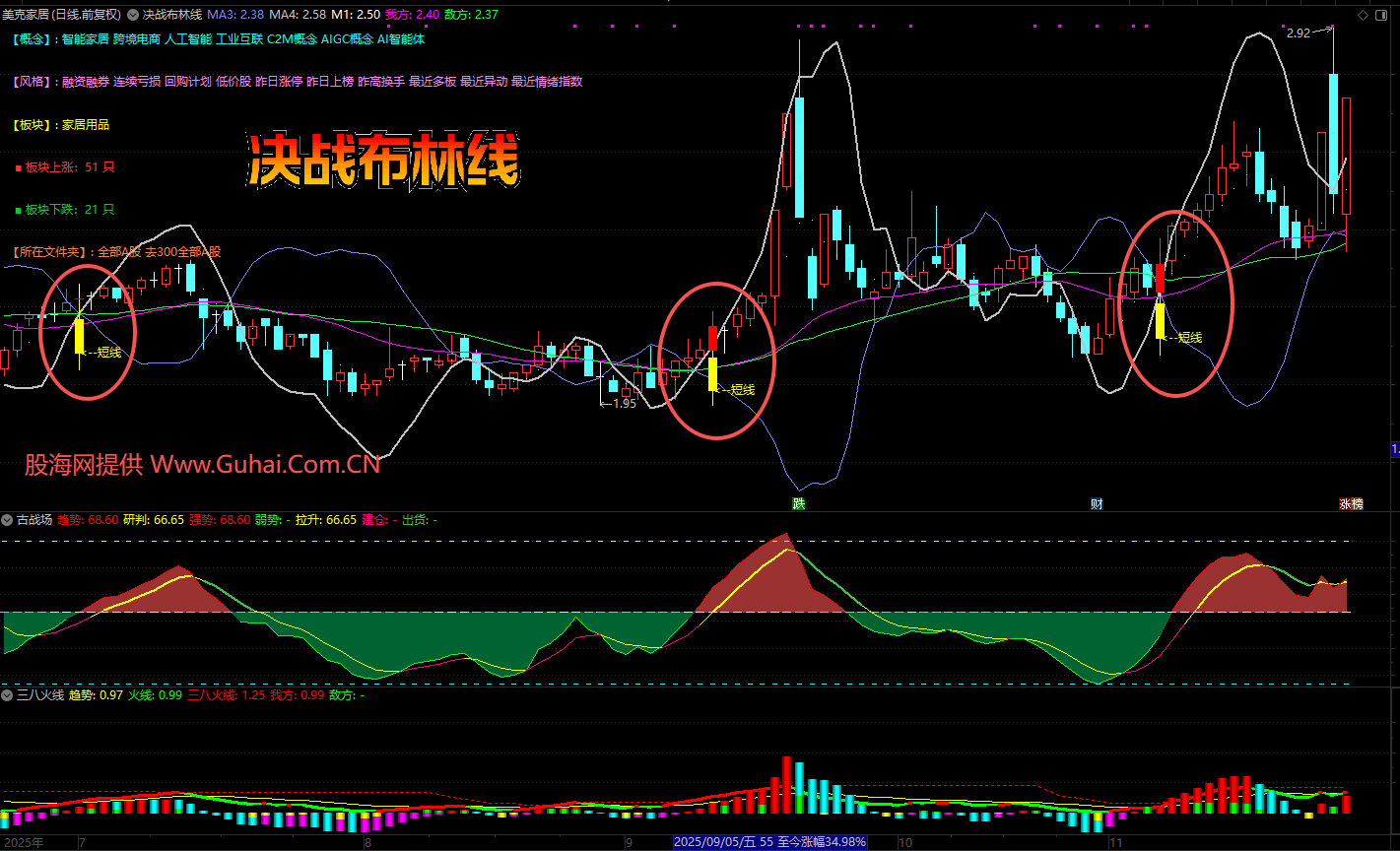 通达信【决战布林线】不同与传统的、三轨布林线、他有四条线组成,中轨是由多空线二线共同组成,清晰标示,多空搏力。