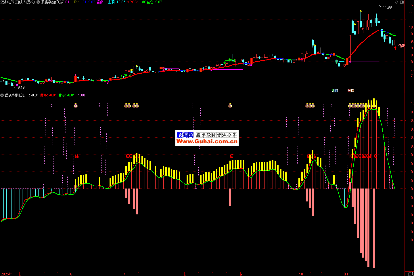 1.等待低吸信号触发:出现红色“低吸”文字+向上箭头;