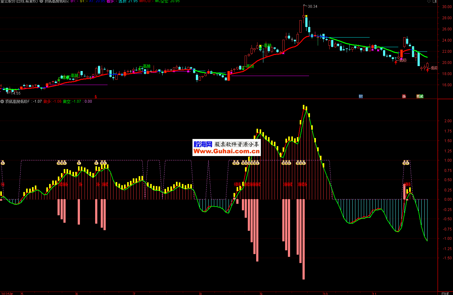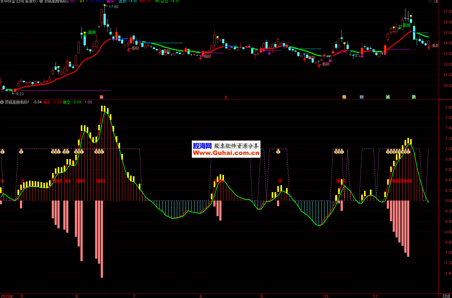 通达信顶底高抛低吸指标,本指标是一款中短线趋势与强弱结合的交易辅助工具,核心逻辑通过“均线系统判断趋势方向+强弱指标,识别高低点+多维度信号验证”,生成低吸、高抛及趋势转折信号,适用于个股及大盘的中短线交易决策,兼顾趋势跟随与波段操作需求。