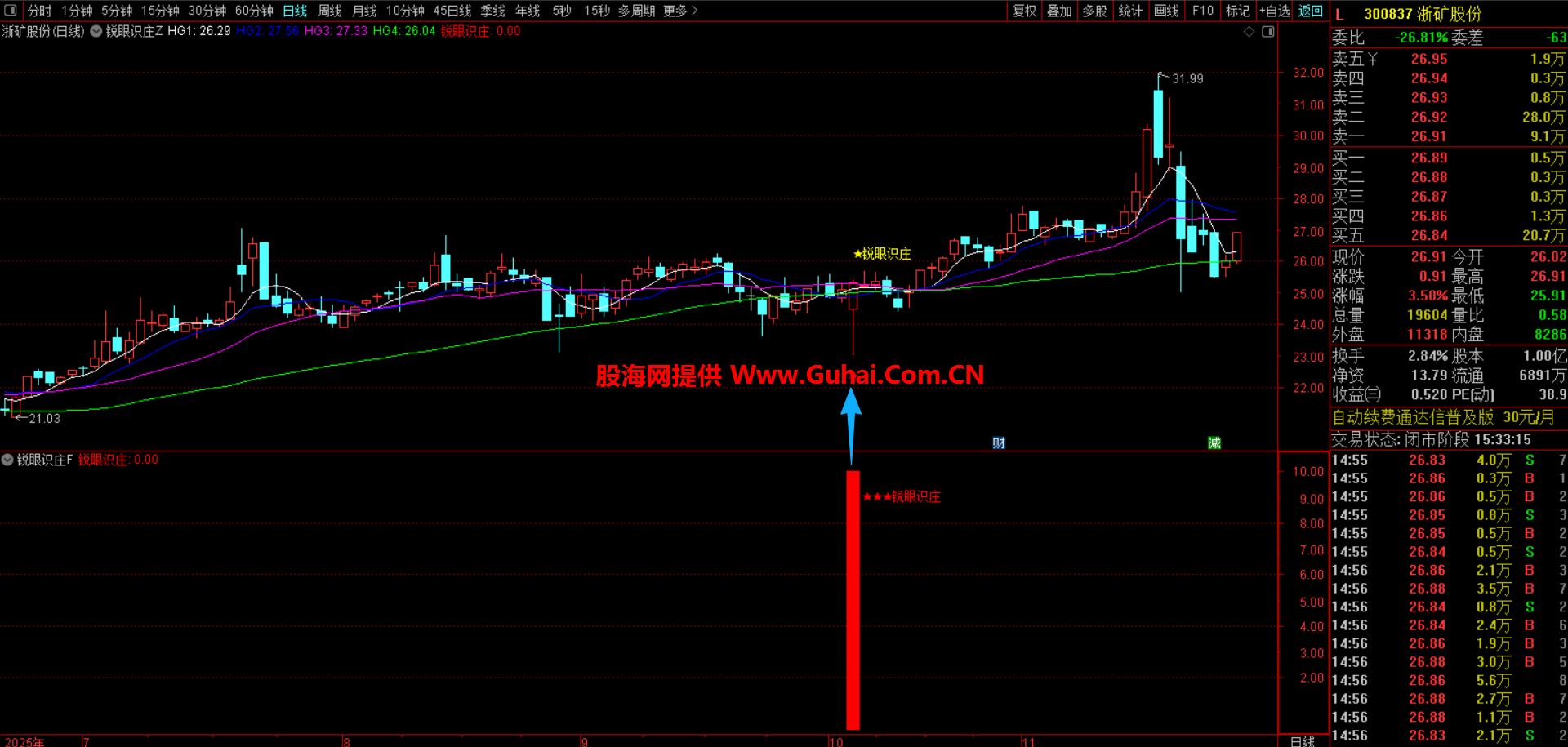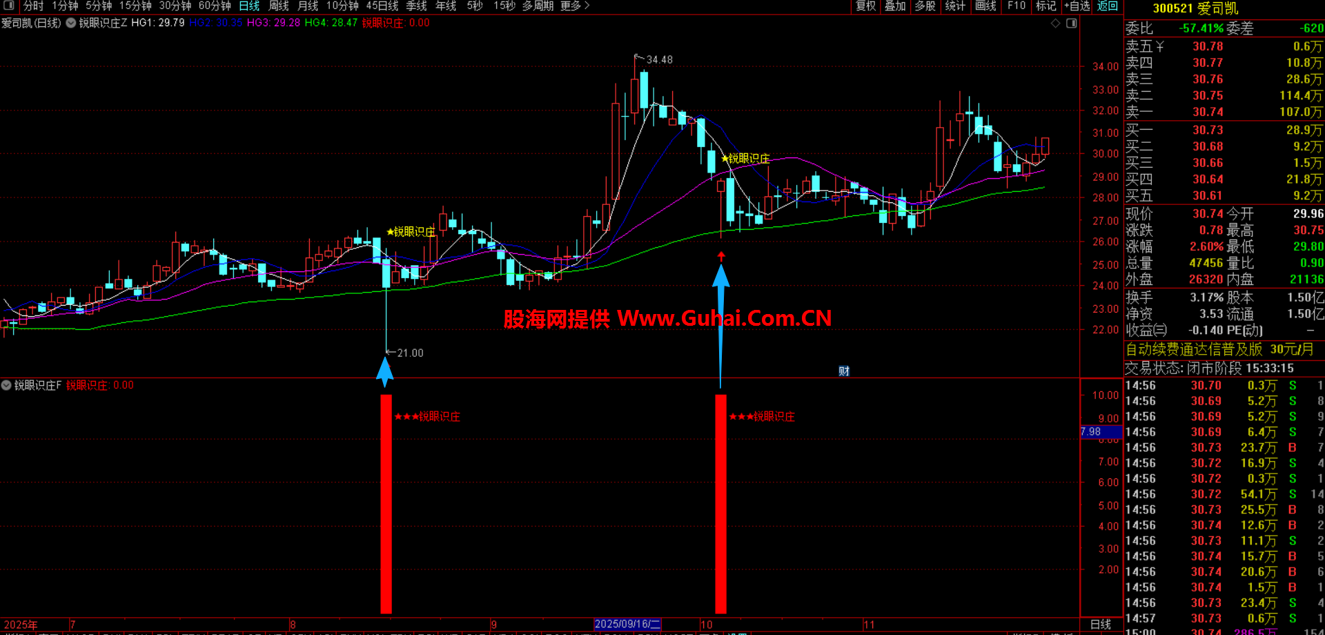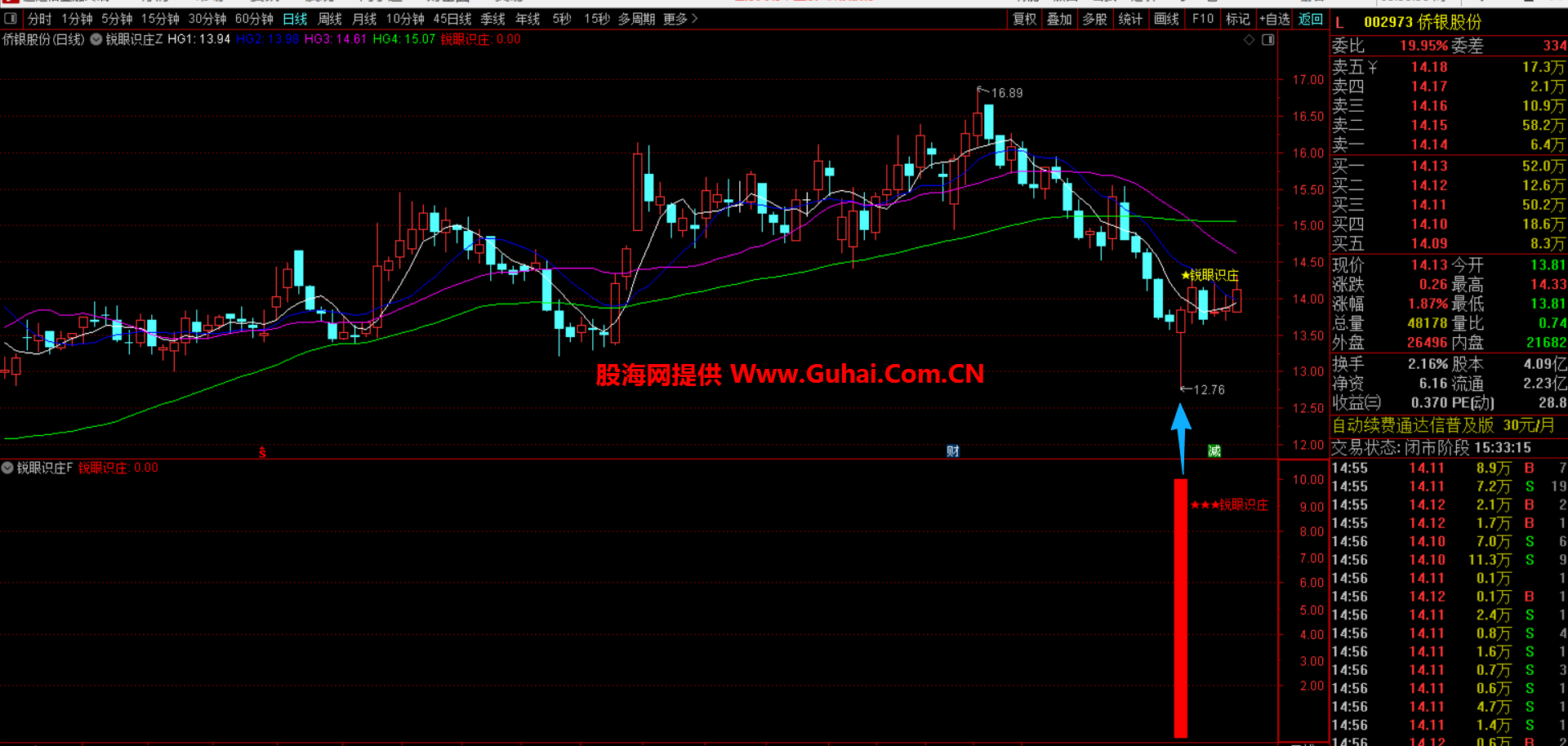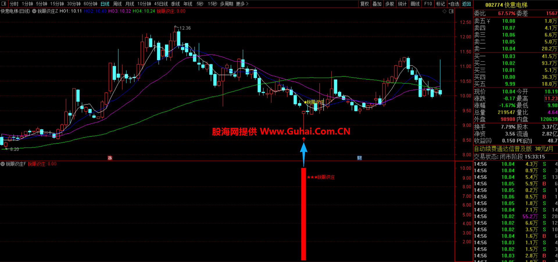 当指标在副图区域出现红色柱状标记,并显示“锐眼识庄”文字时,就代表触发了识别条件。这意味着当前股价位置不高,同时出现了长下影线等主力吸筹特征,值得你重点关注。