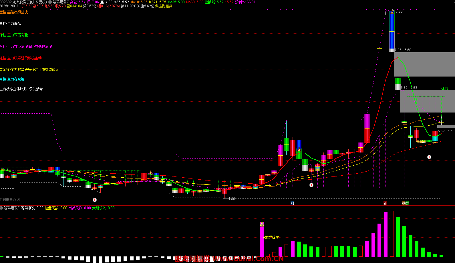 当控盘线由负转正且MACD金叉时触发“筹码爆发”黄色信号,提示短线爆发机会;同时通过“大胆杀入”紫柱信号强化买入确认。