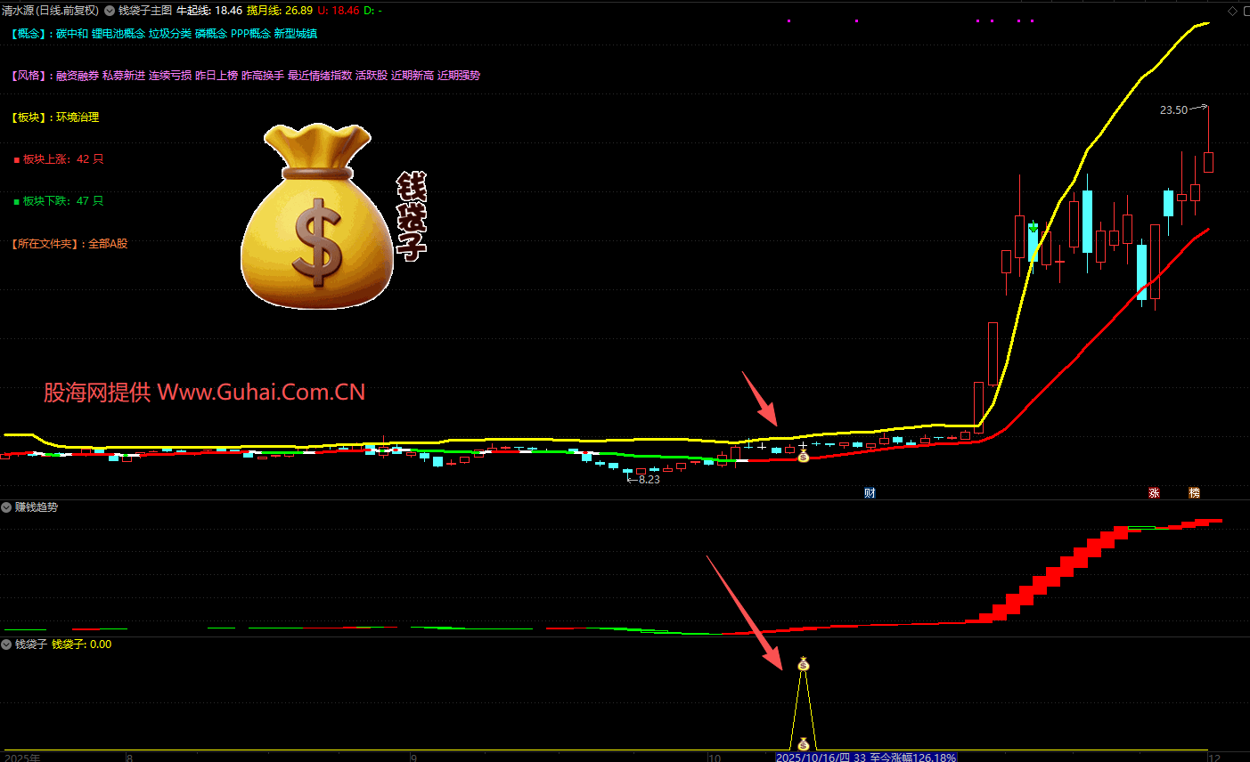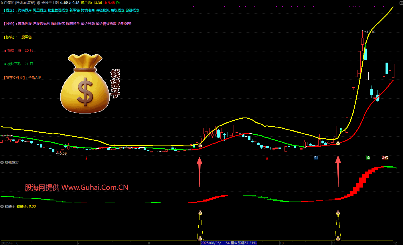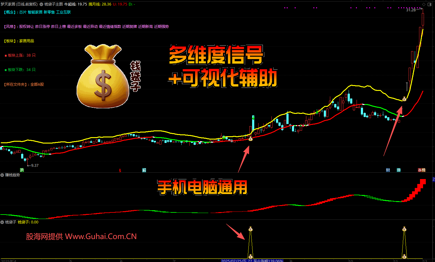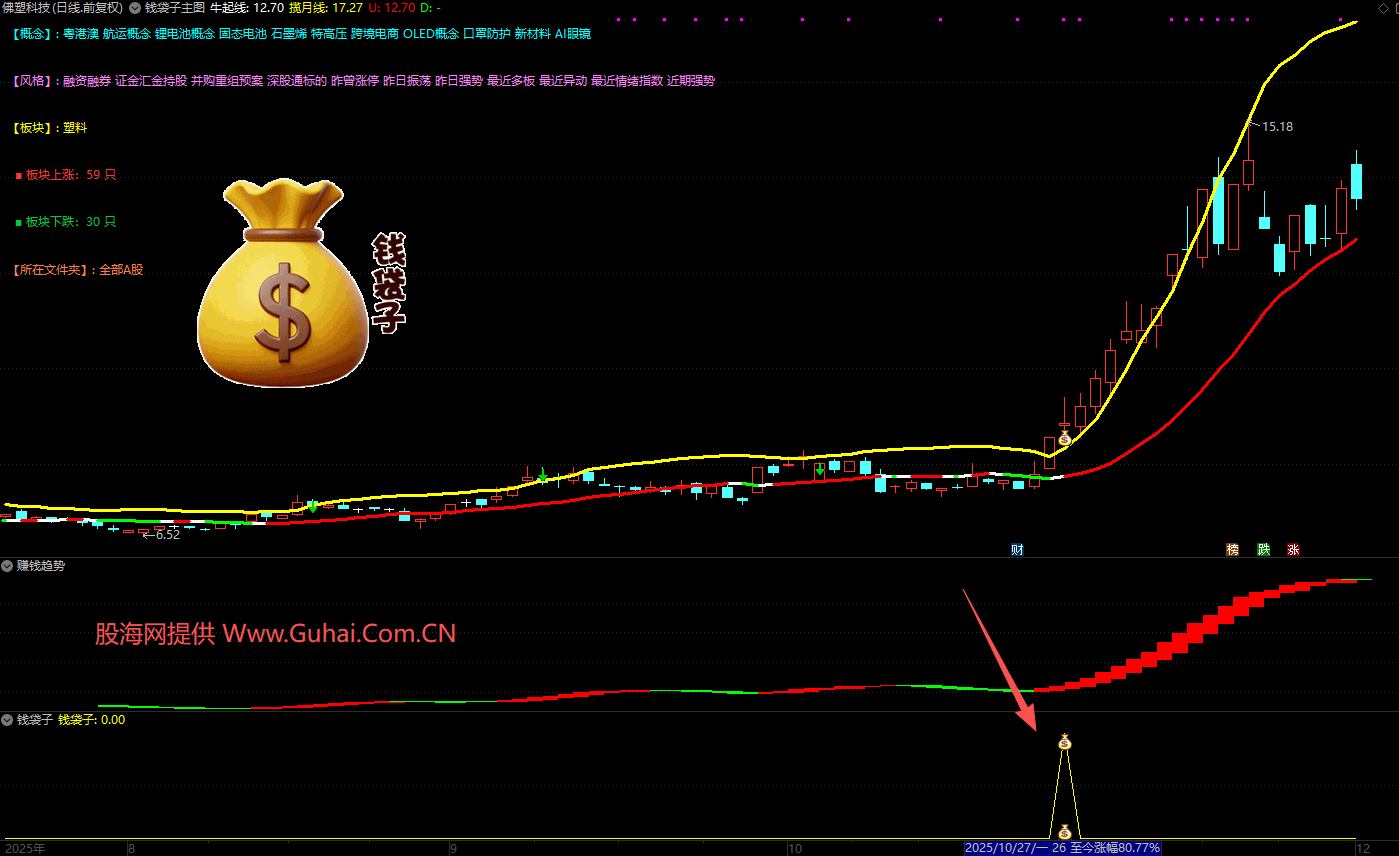8、智能信号标记:当满足所有条件时,K线图上会出现多个“钱袋子”图标,提示重点关注