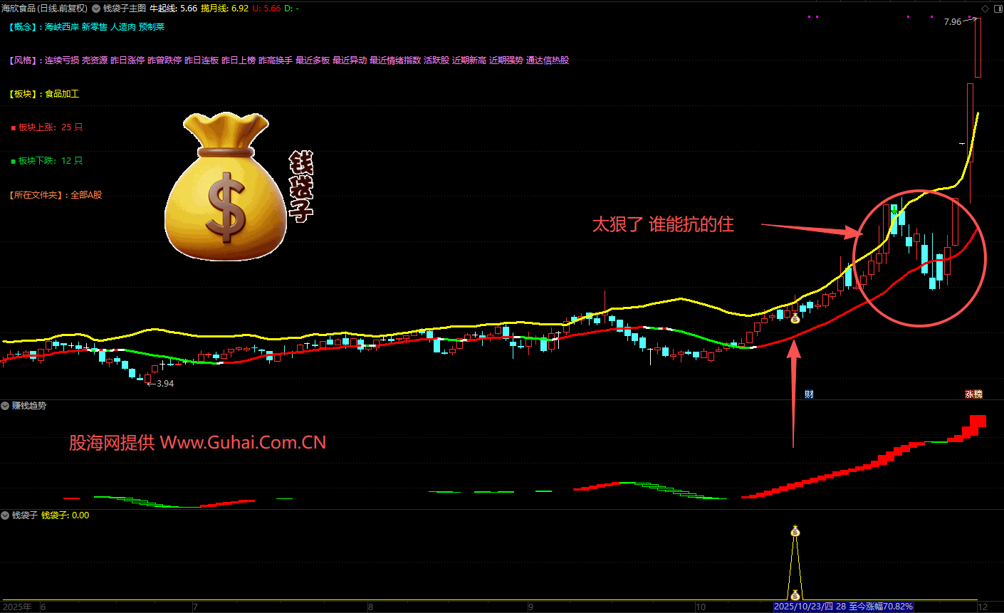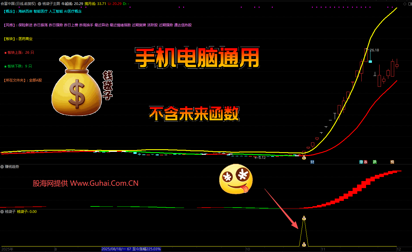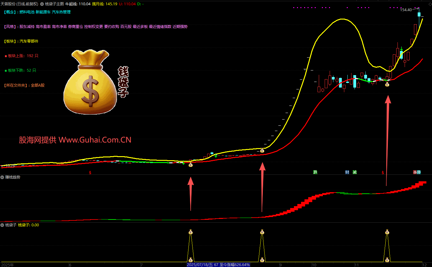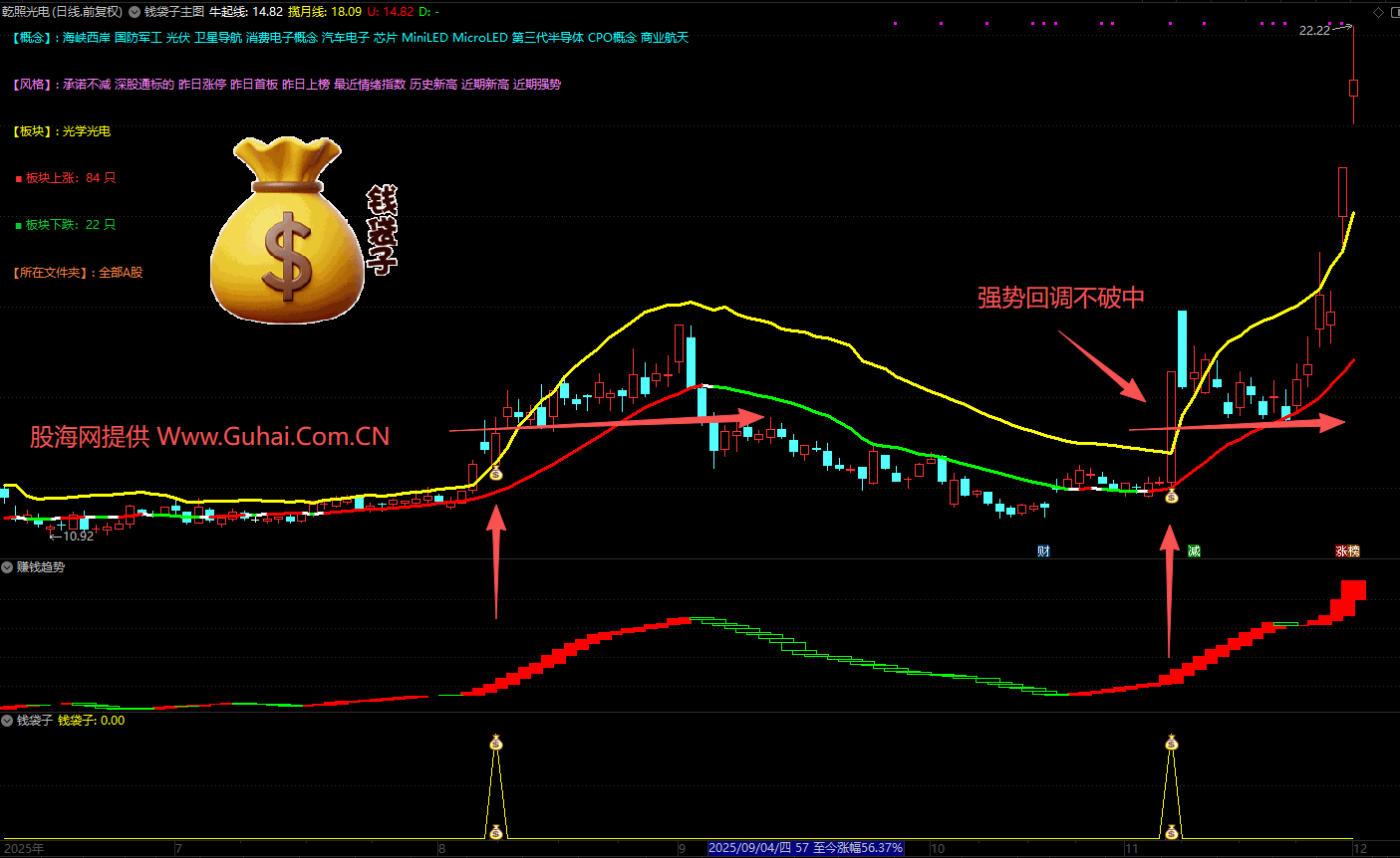 8、智能信号标记:当满足所有条件时,K线图上会出现多个“钱袋子”图标,提示重点关注