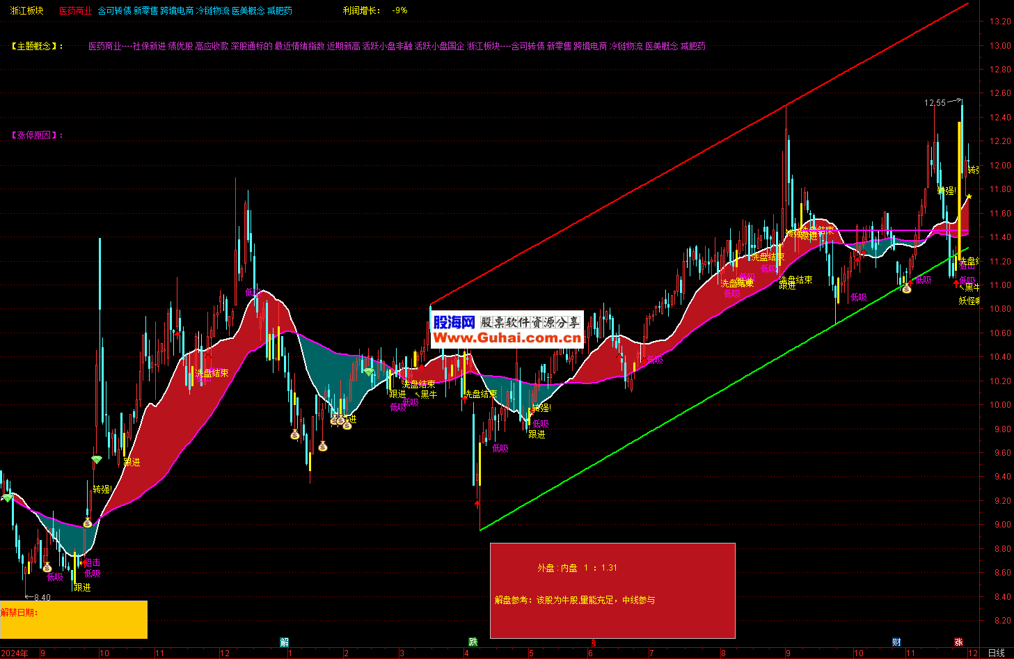 通达信简易红飘带主图指标,该指标是一款 “趋势判断 + 买卖信号 + 个股基本面 + 风险预警” 四位一体 的综合主图工具,适配通达信(手机 + 电脑版),核心功能是通过多均线系统、量能验证、技术形态筛选,清晰标注个股趋势类型(牛股 / 猴股 / 熊股等)、买卖信号(狙击 / 跟进 / 低吸等),同时叠加基本面数据和风险提示,适合短线、波段及中线投资者快速把控个股全貌。