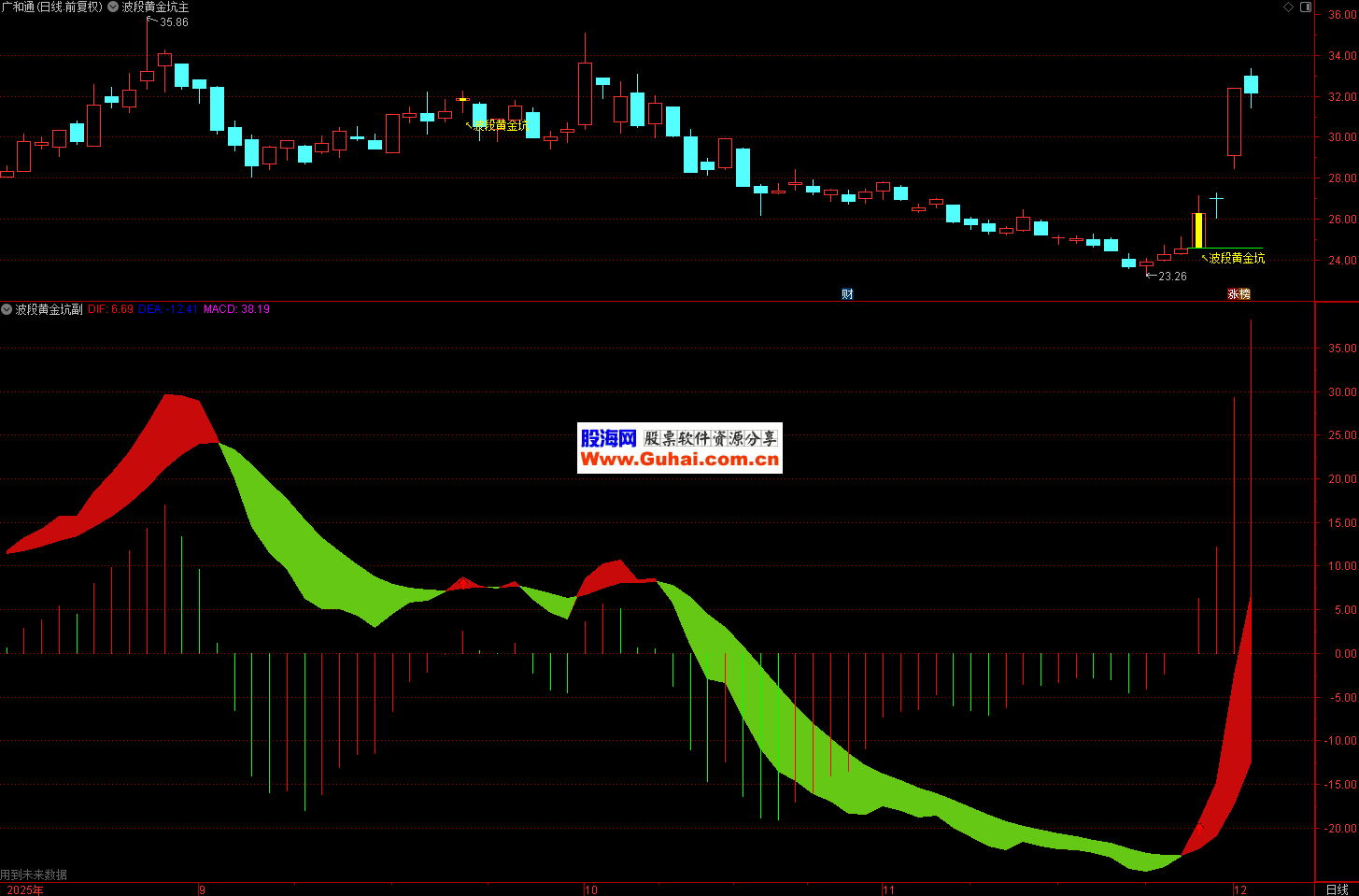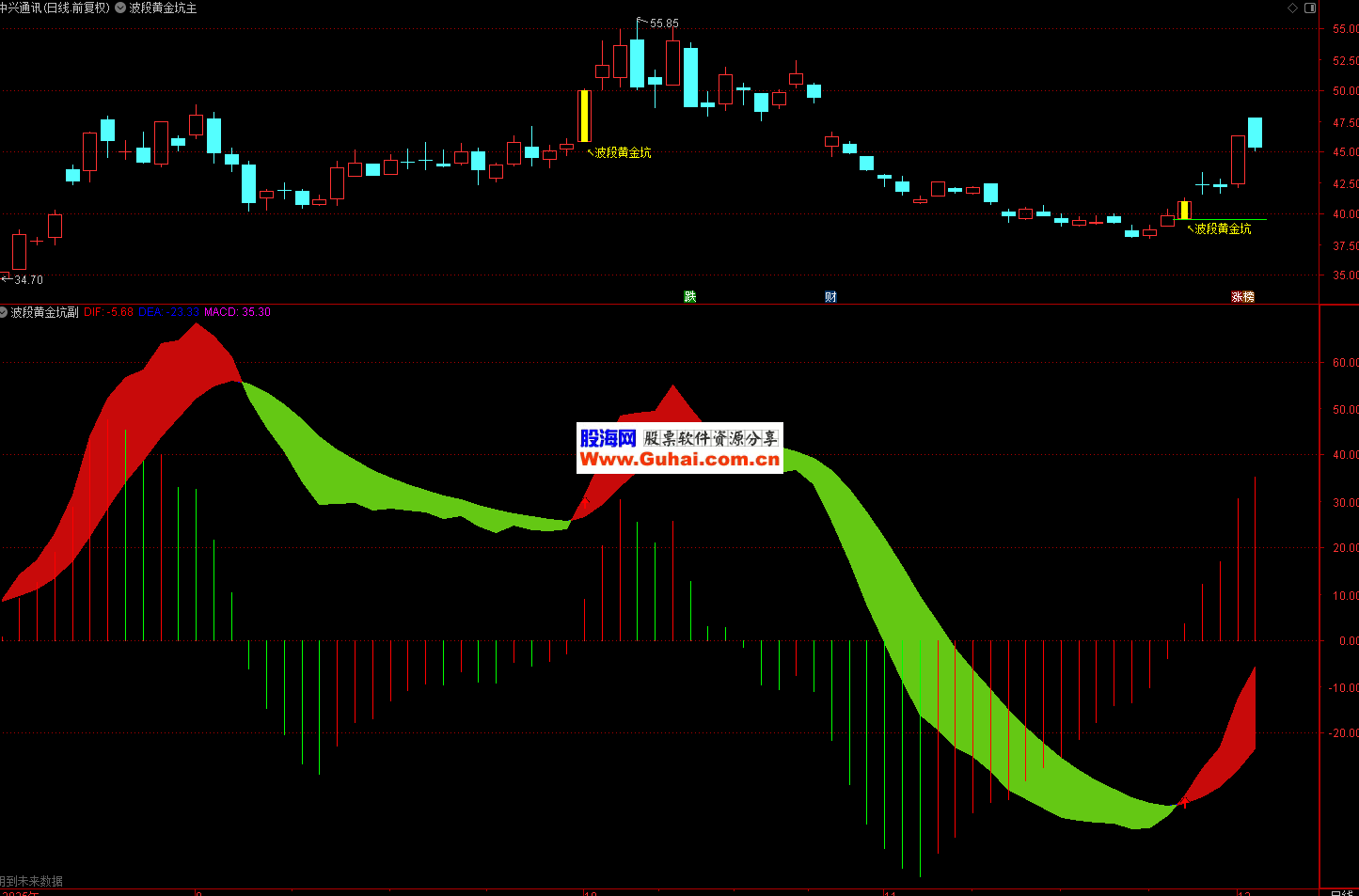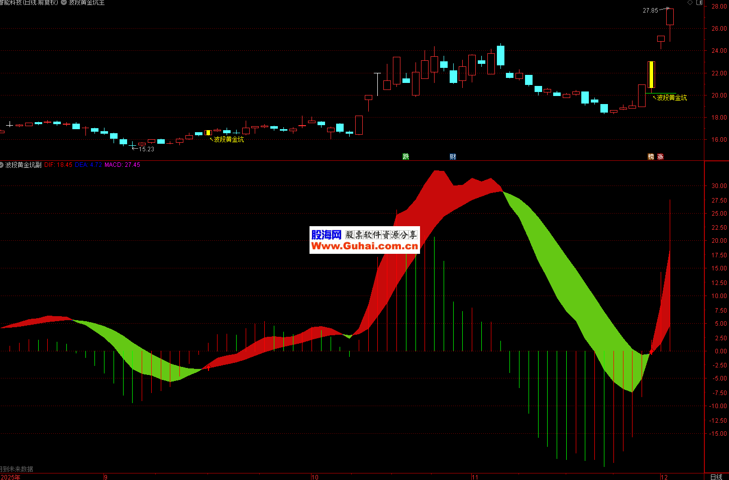 1、【波段黄金坑】的副图是一个在传统MACD基础上深度优化的增强版指标,通过彩色柱状线、背离检测、多空信号标记等多重手段,大幅提升了MACD的视觉效果和实战价值。