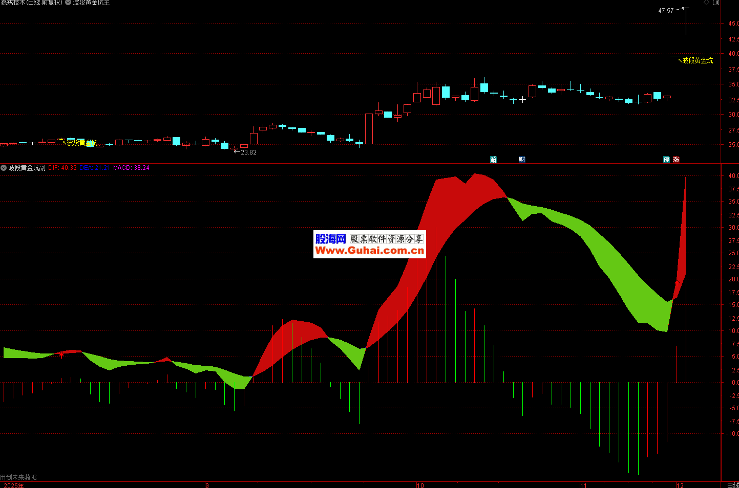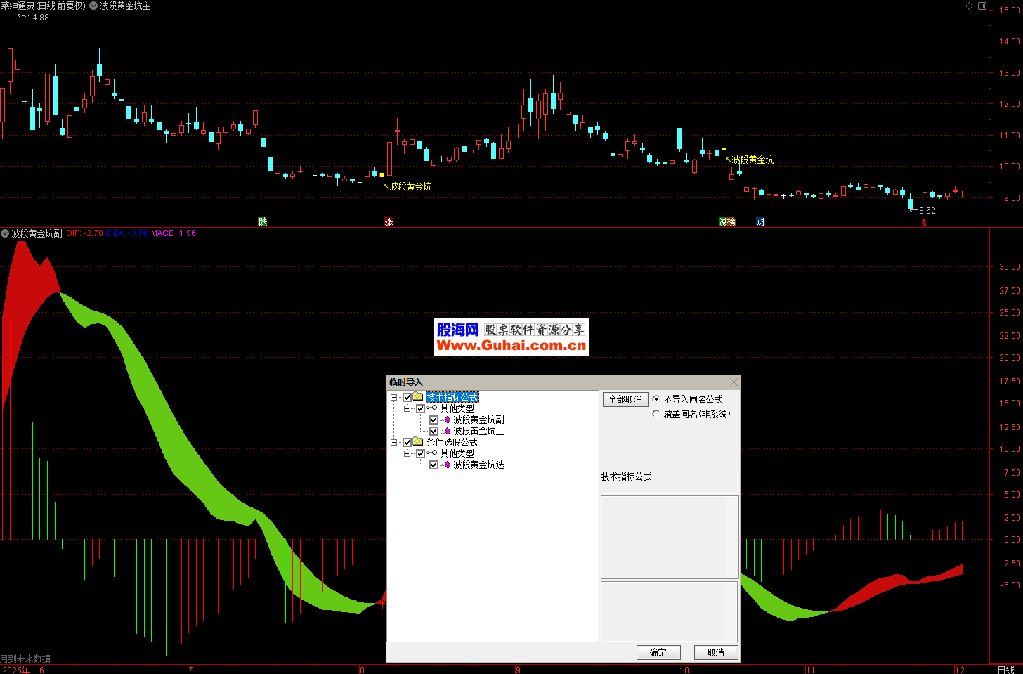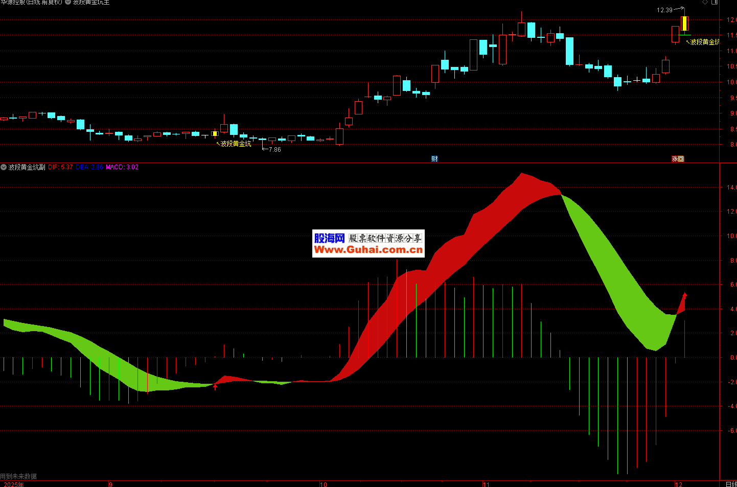 1、【波段黄金坑】的副图是一个在传统MACD基础上深度优化的增强版指标,通过彩色柱状线、背离检测、多空信号标记等多重手段,大幅提升了MACD的视觉效果和实战价值。