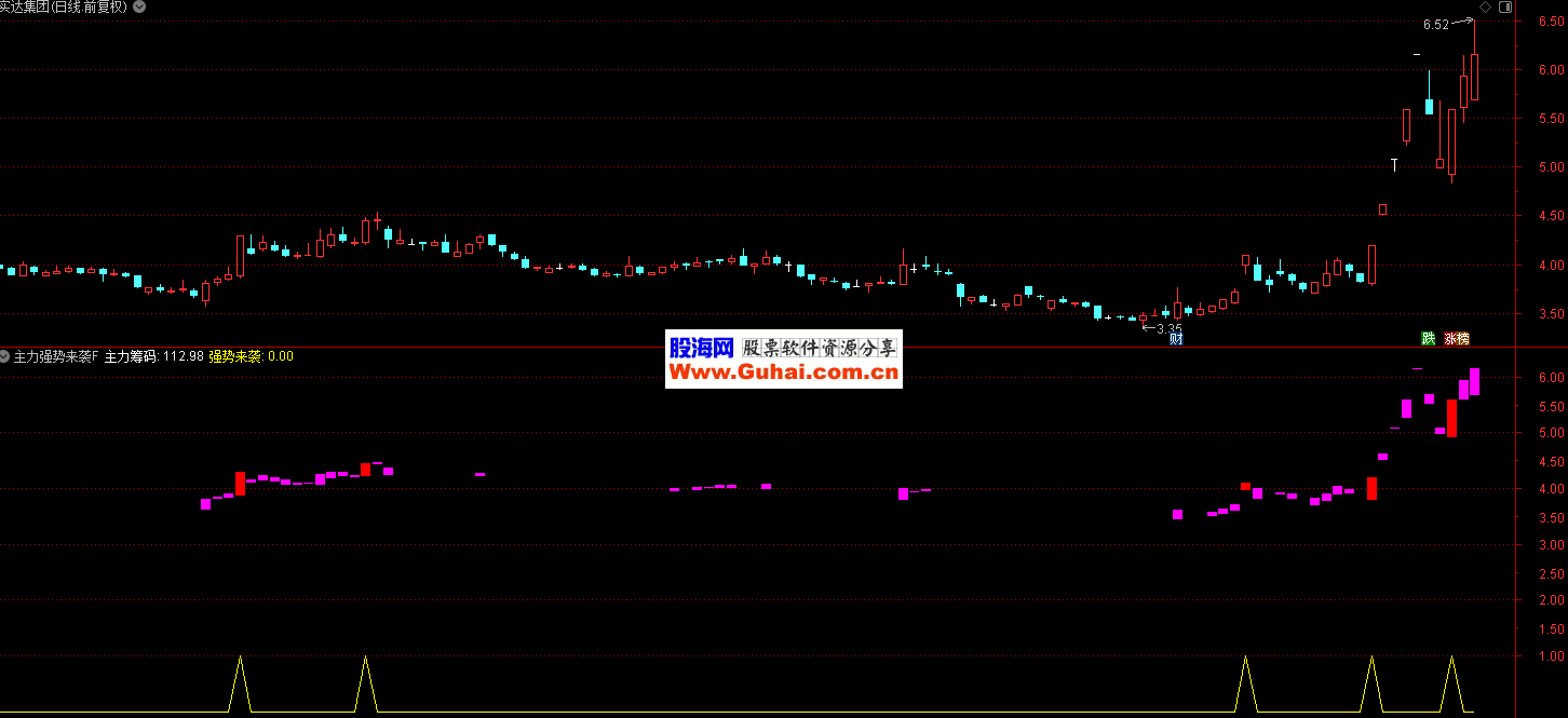 通达信主力强势来袭指标,这是公式最关键的信号,满足条件:之前主力筹码≤50,当前首次超过 50(红色 K 线标注),代表: