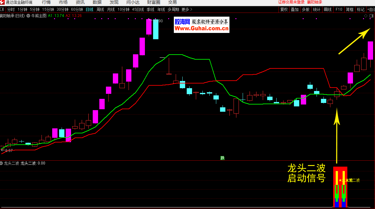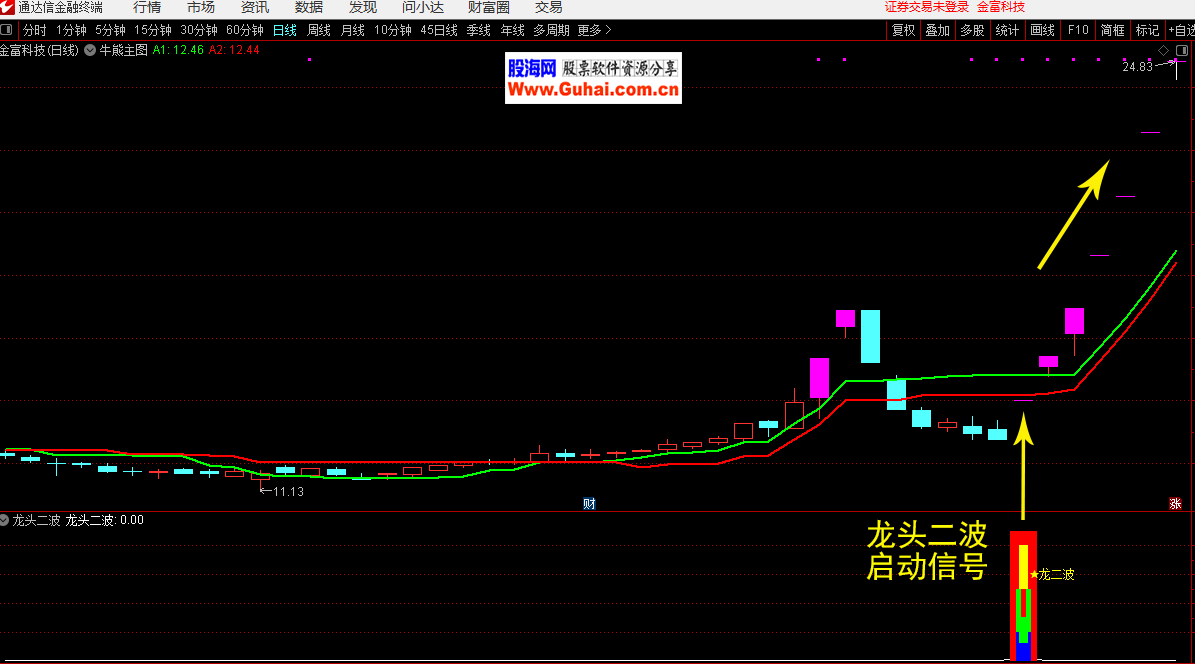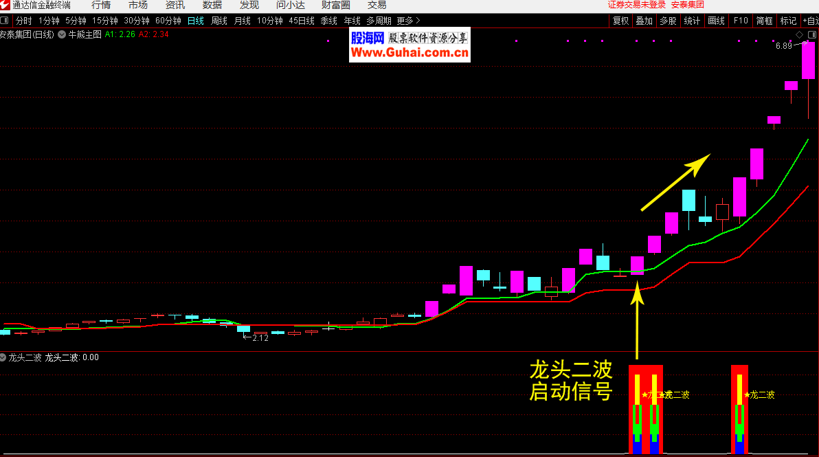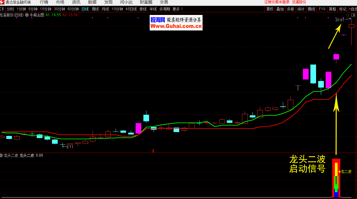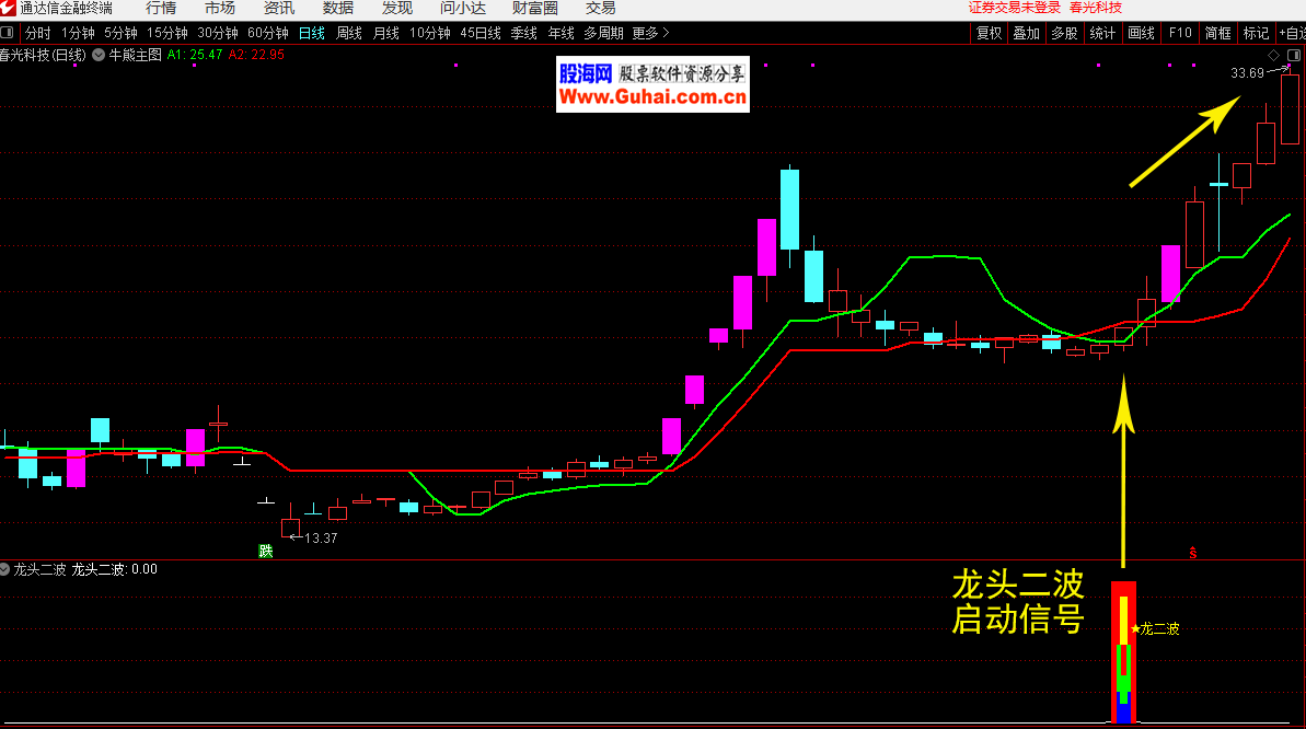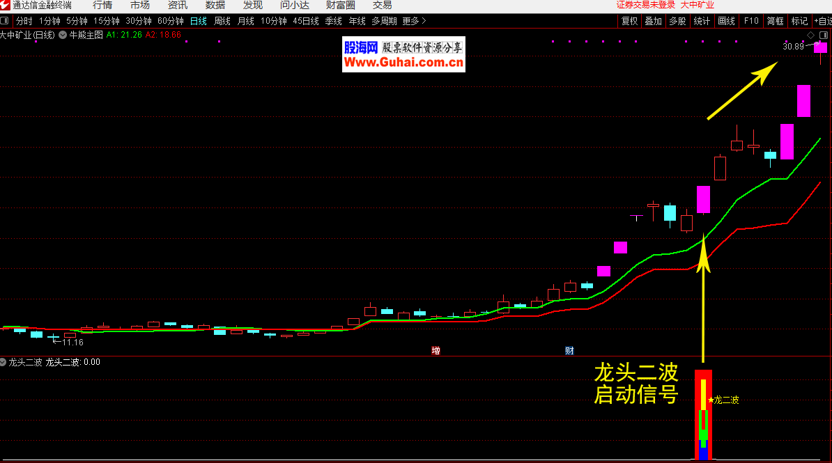 龙头二波副图出现买入信号时,为强烈看多信号可以介入;跌破信号K线最低点要果断离场。