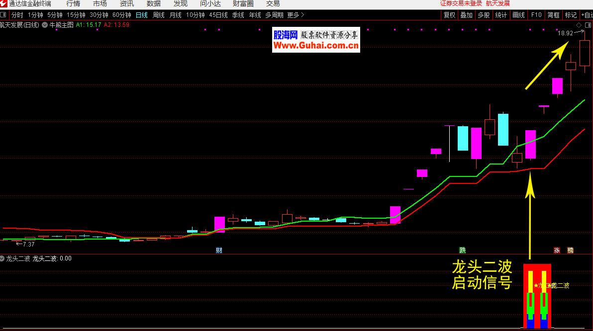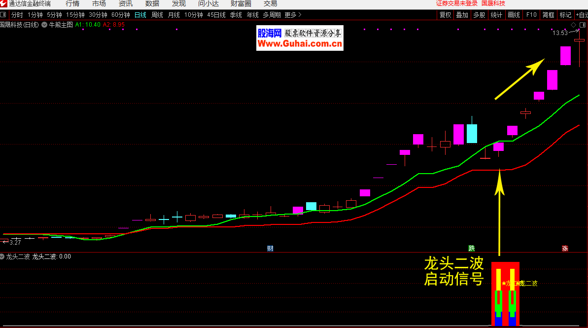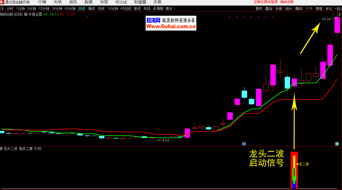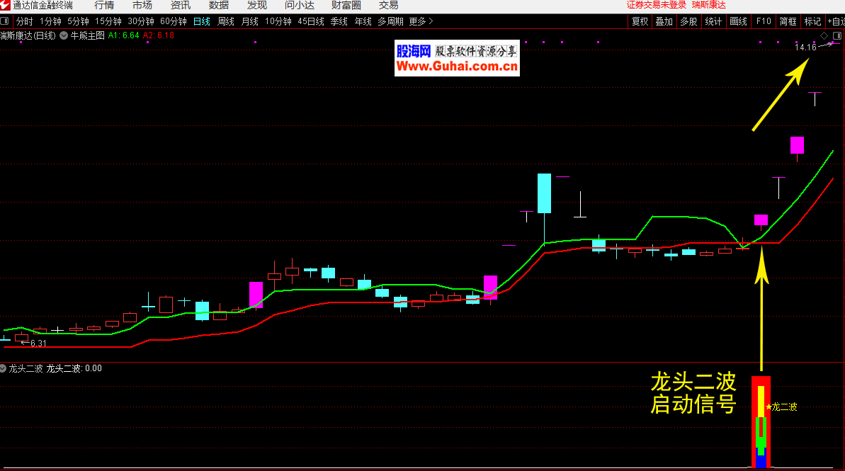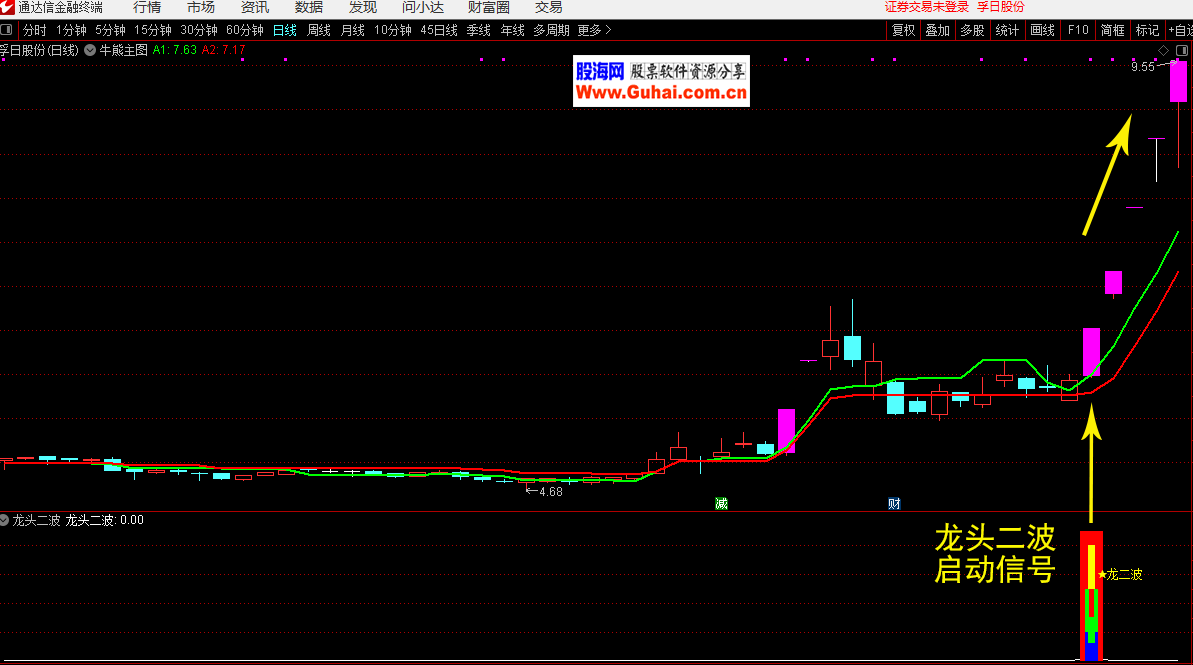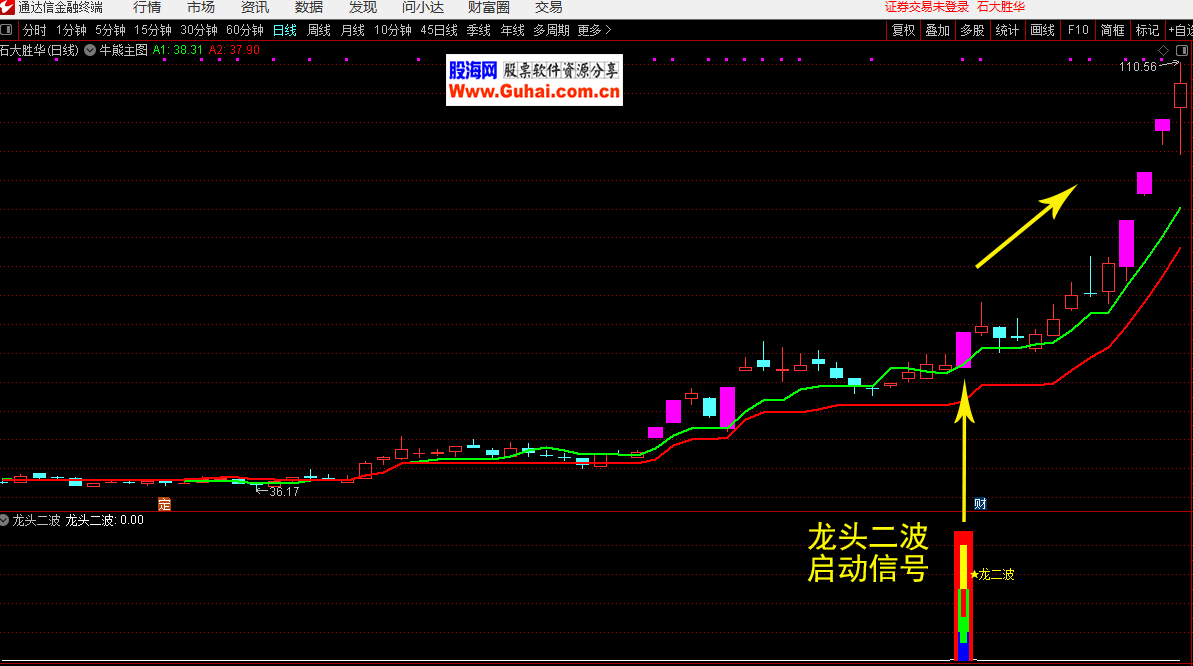 龙头二波副图出现买入信号时,为强烈看多信号可以介入;跌破信号K线最低点要果断离场。